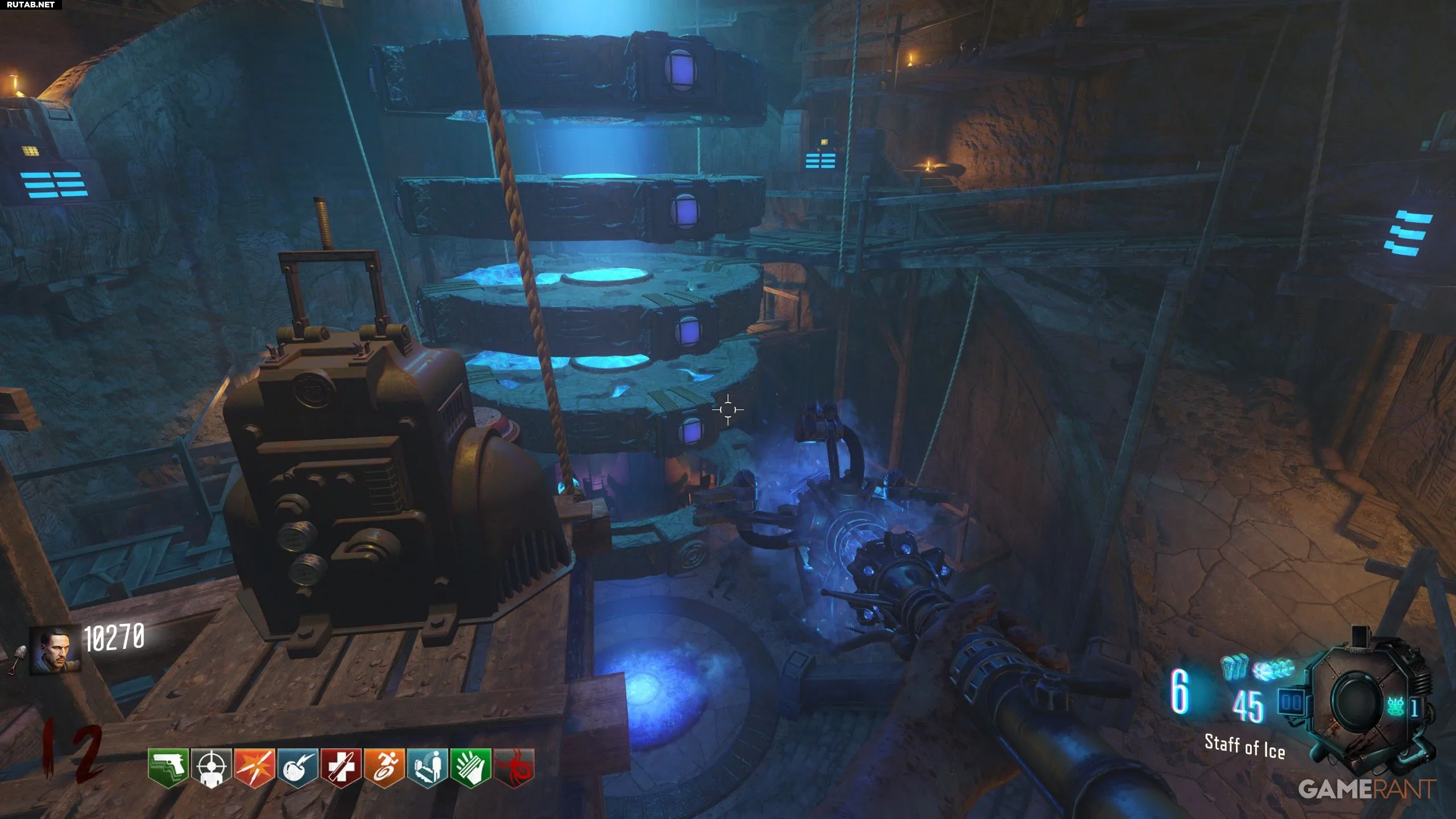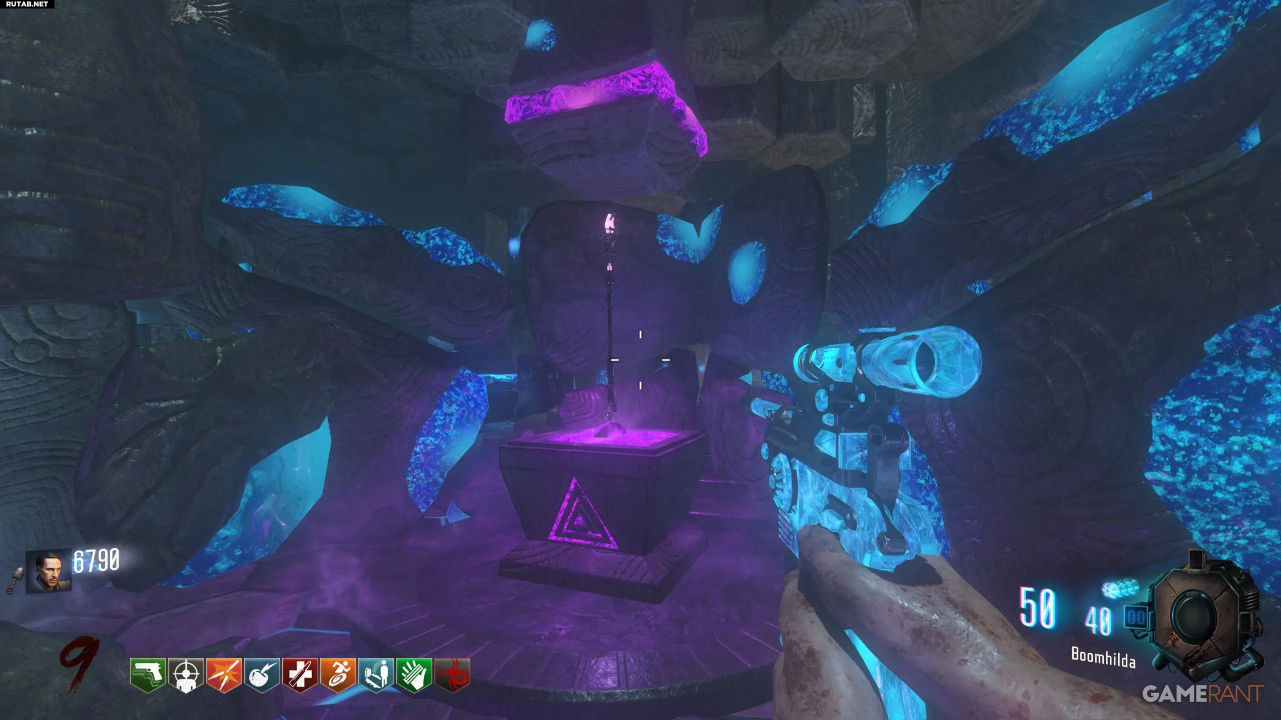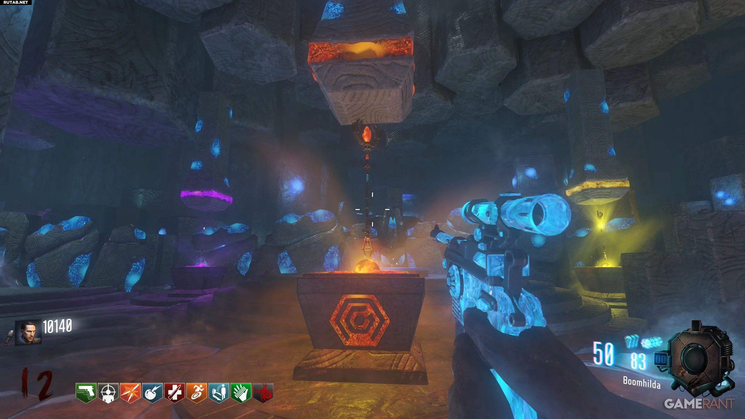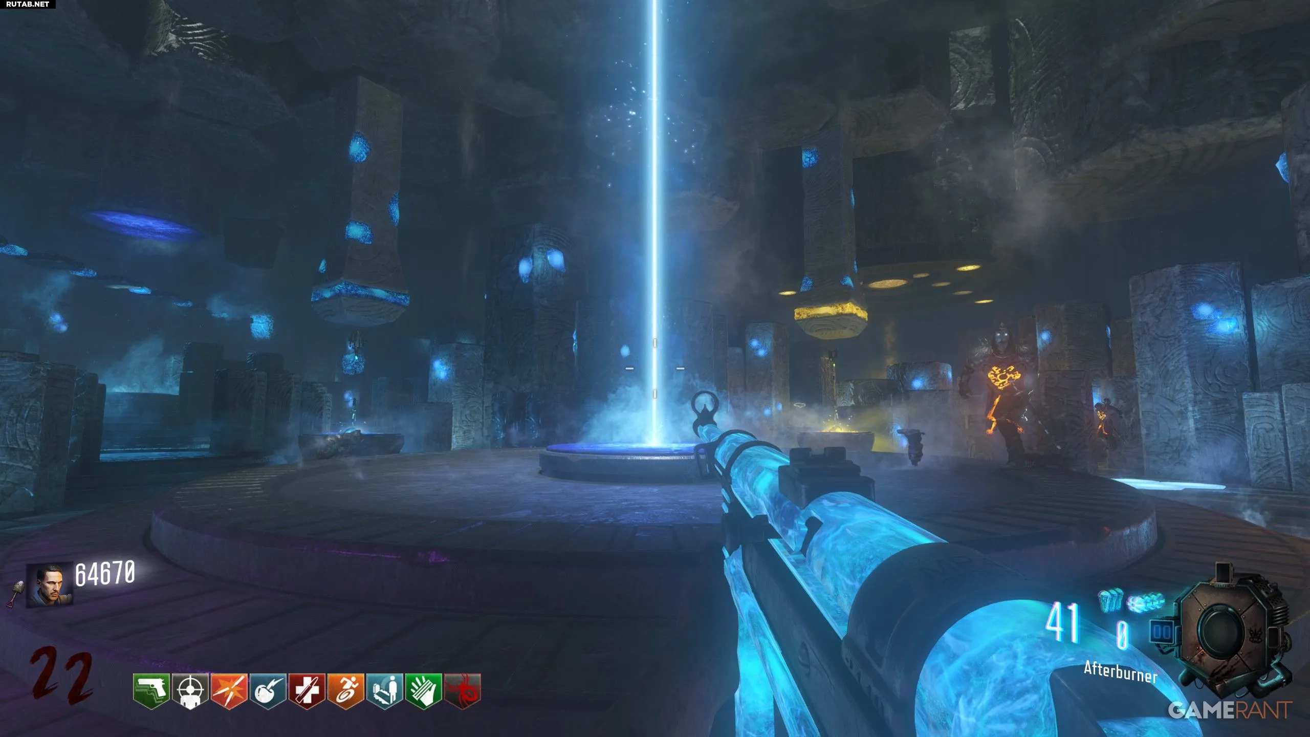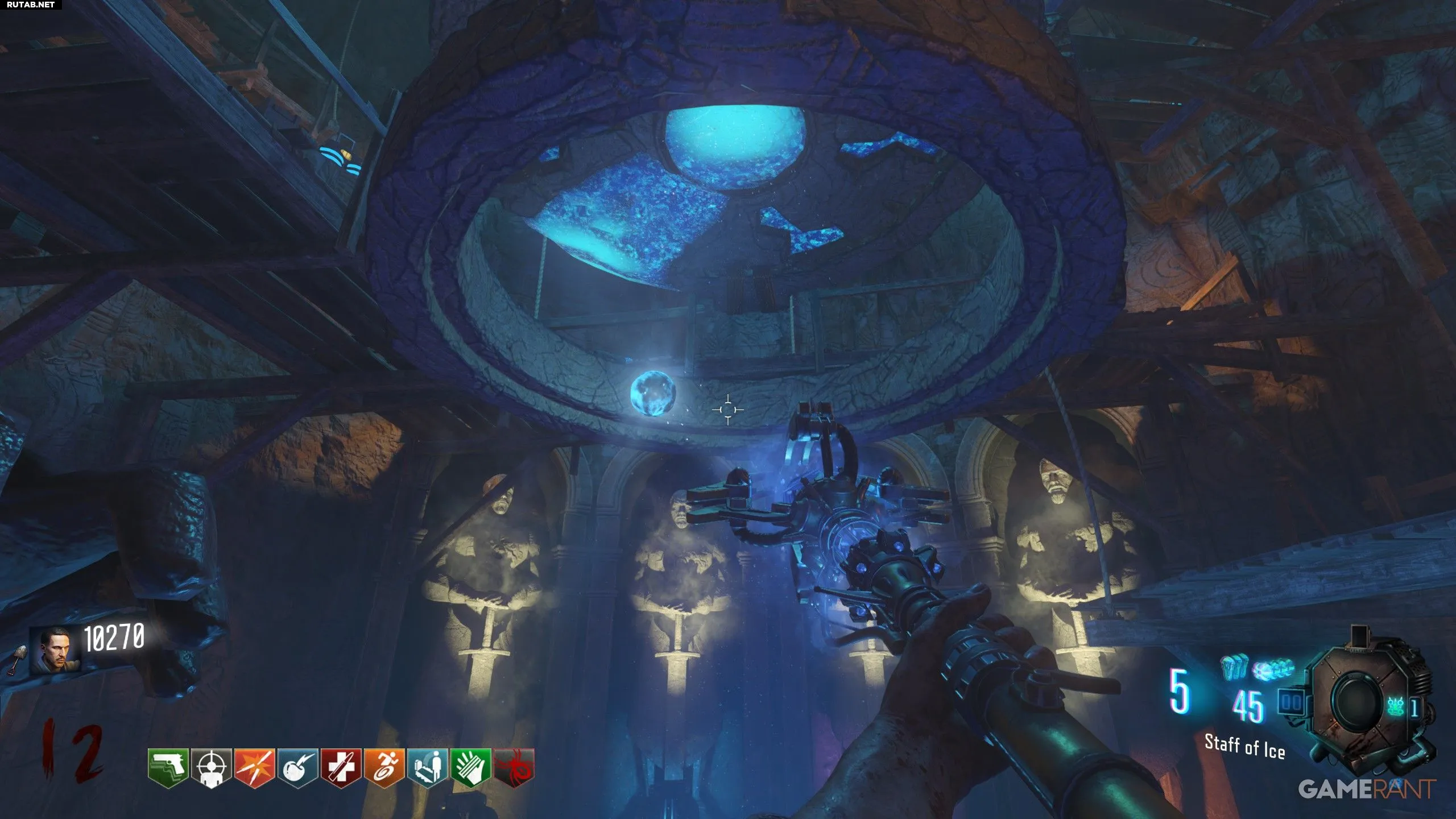 После этого вернитесь к кургану под Pack-a-Punch и потяните четыре рычага до тех пор, пока на каждом вращающемся циферблате не появится красный символ. Наконец, выстрелите в Красную Сферу из Посоха Огня и вернитесь в «Безумное место», чтобы поместить Посох Огня на красный алтарь и совершить более 20 убийств для его улучшения.