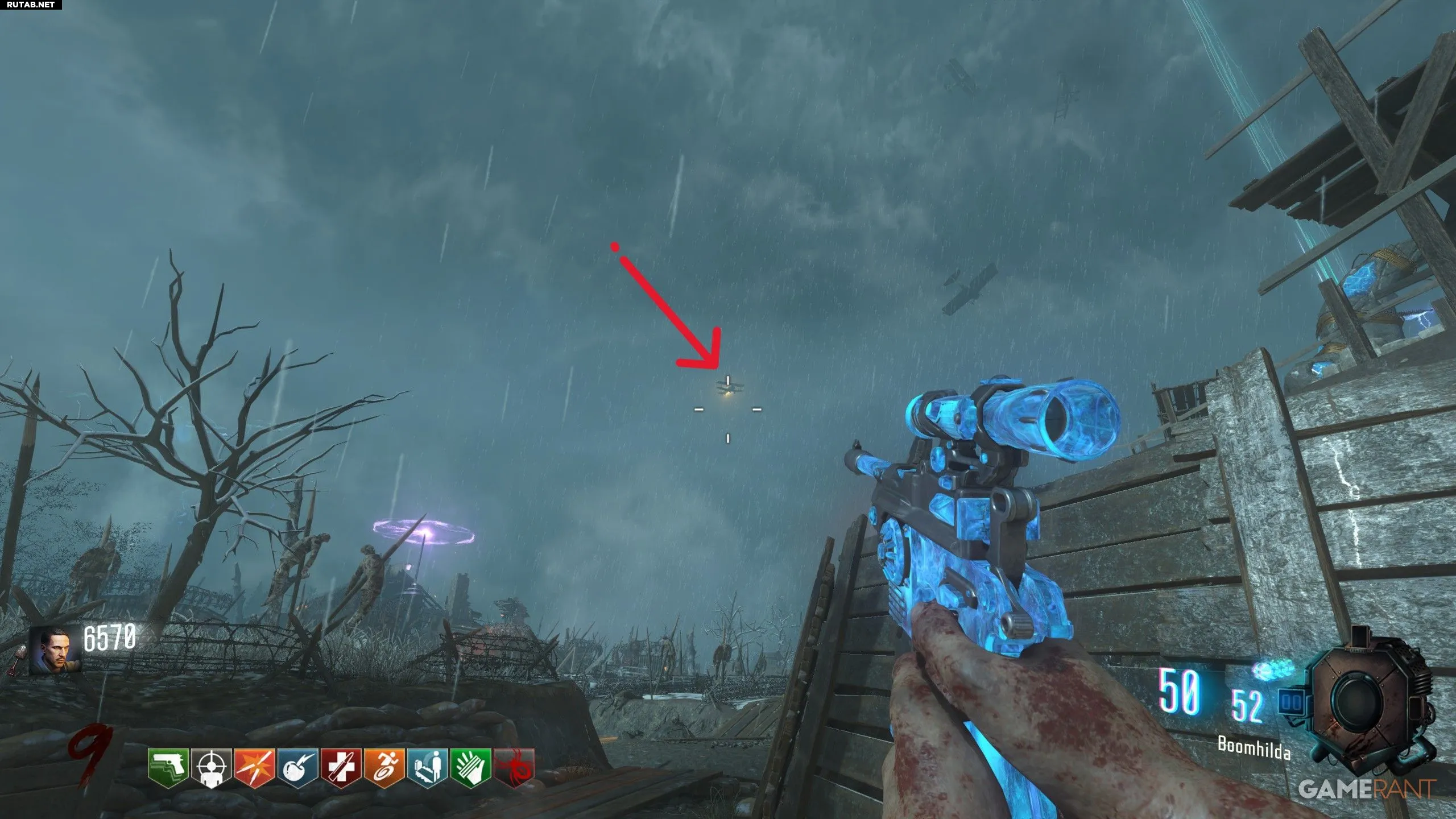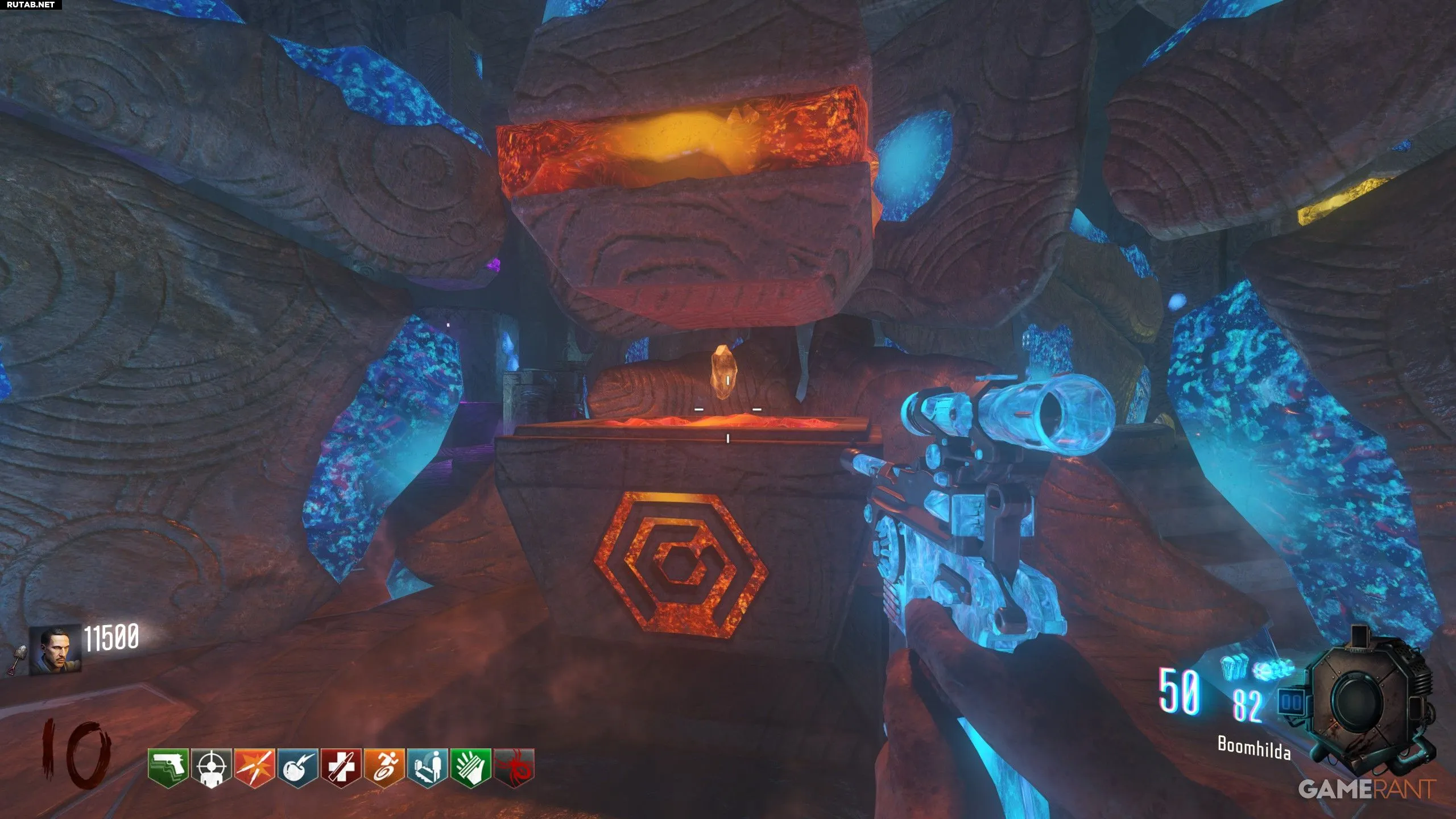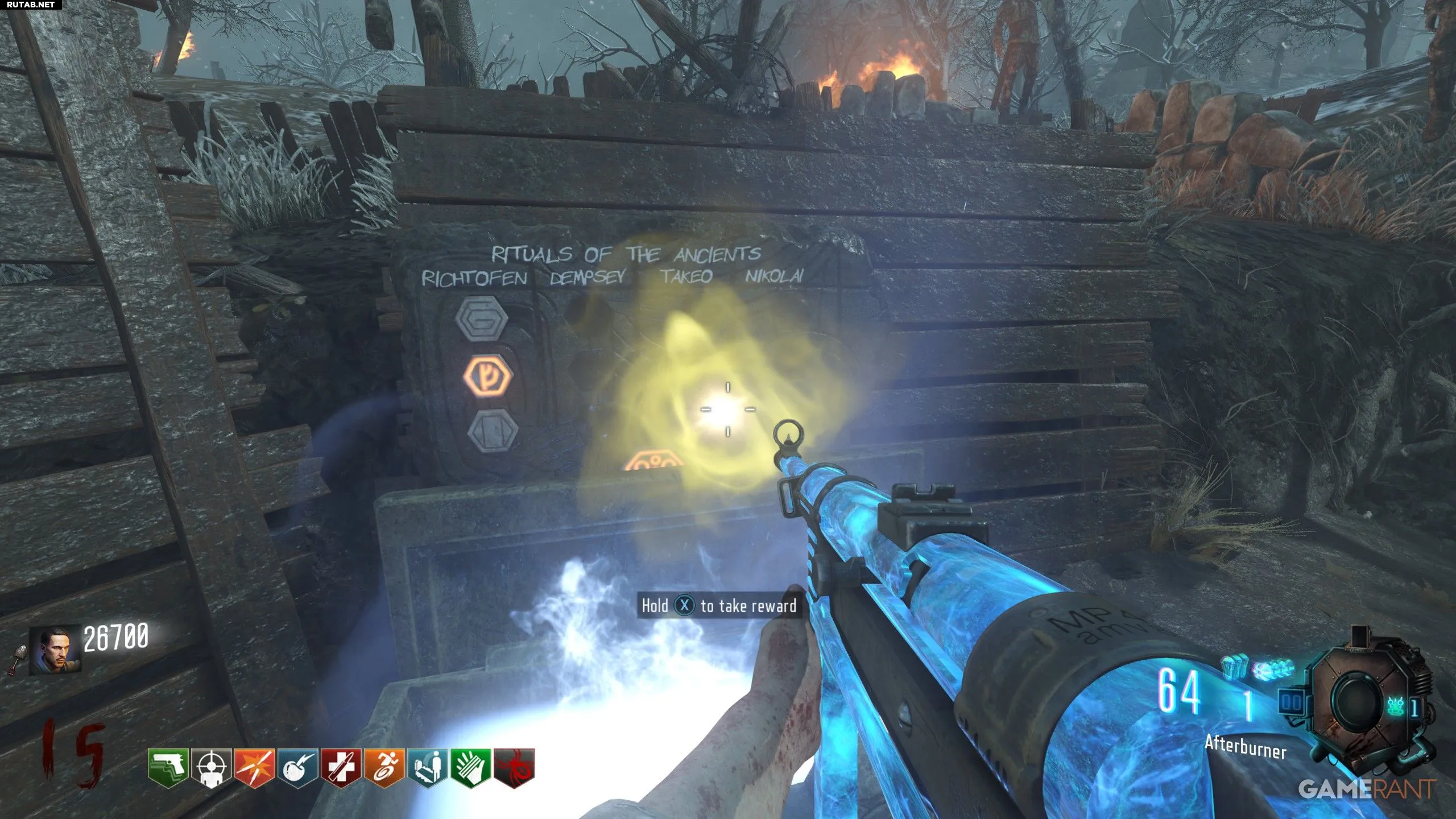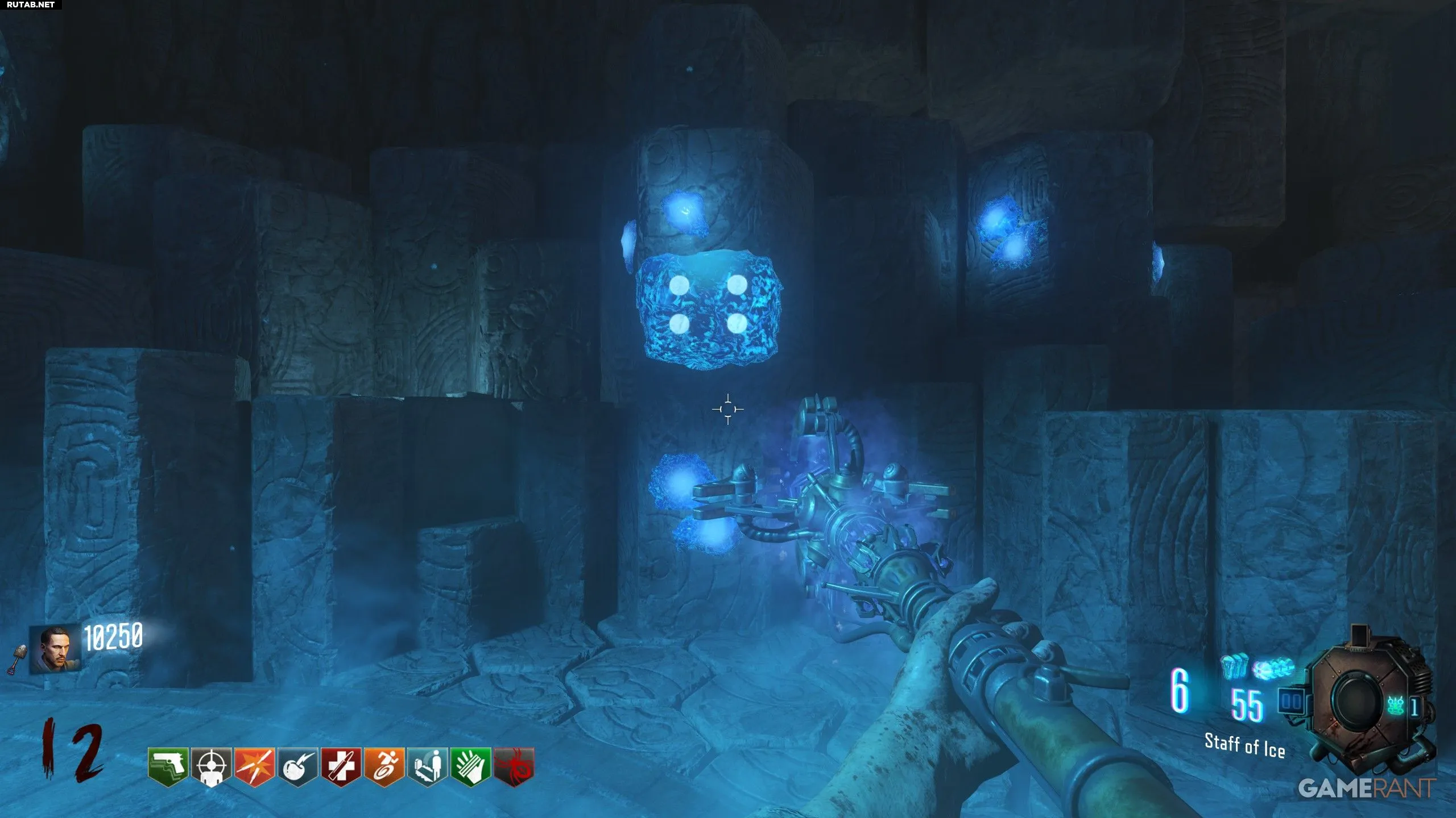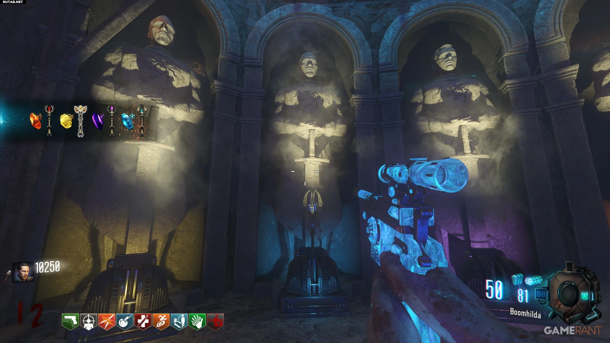 После этого вернитесь к кургану под Pack-a-Punch и потяните четыре рычага до тех пор, пока на каждом вращающемся циферблате не появится красный символ. Наконец, выстрелите в Красную Сферу из Посоха Огня и вернитесь в «Безумное место», чтобы поместить Посох Огня на красный алтарь и совершить более 20 убийств для его улучшения.