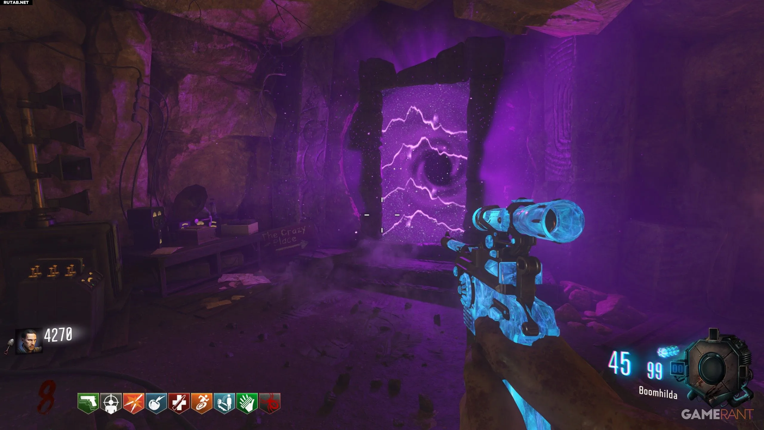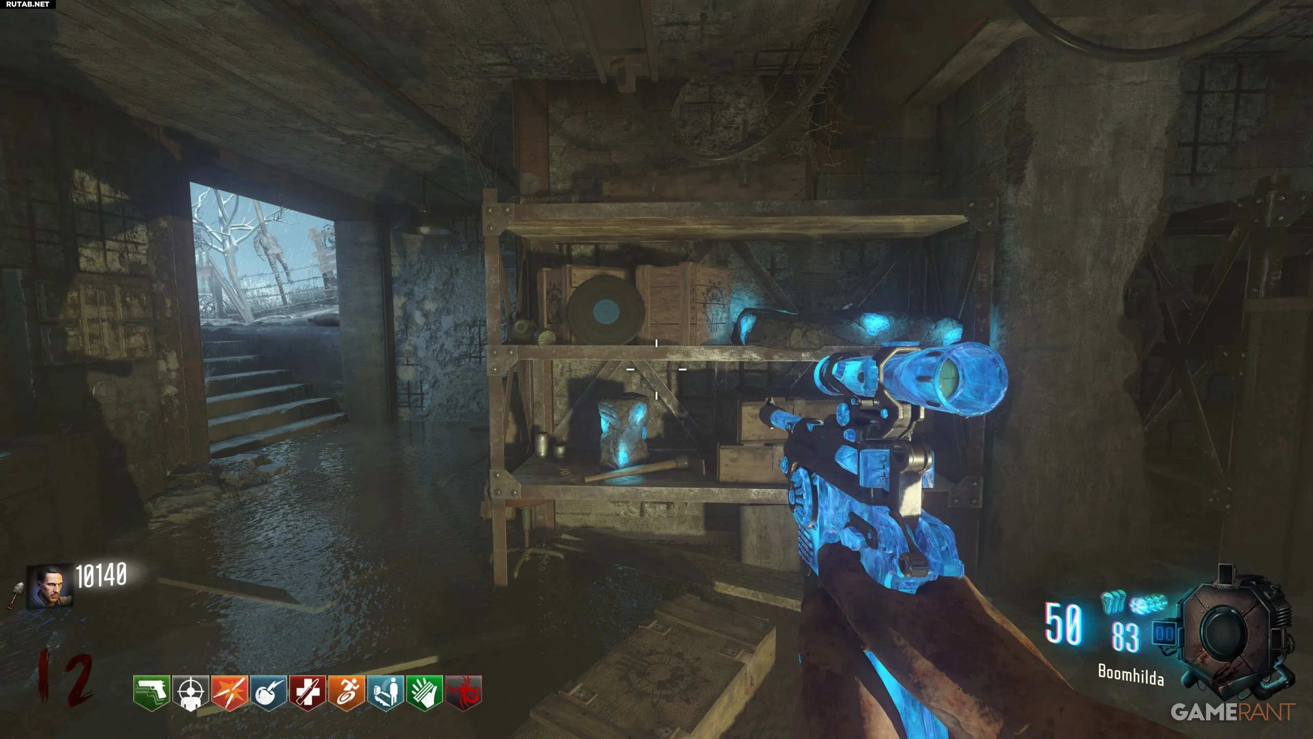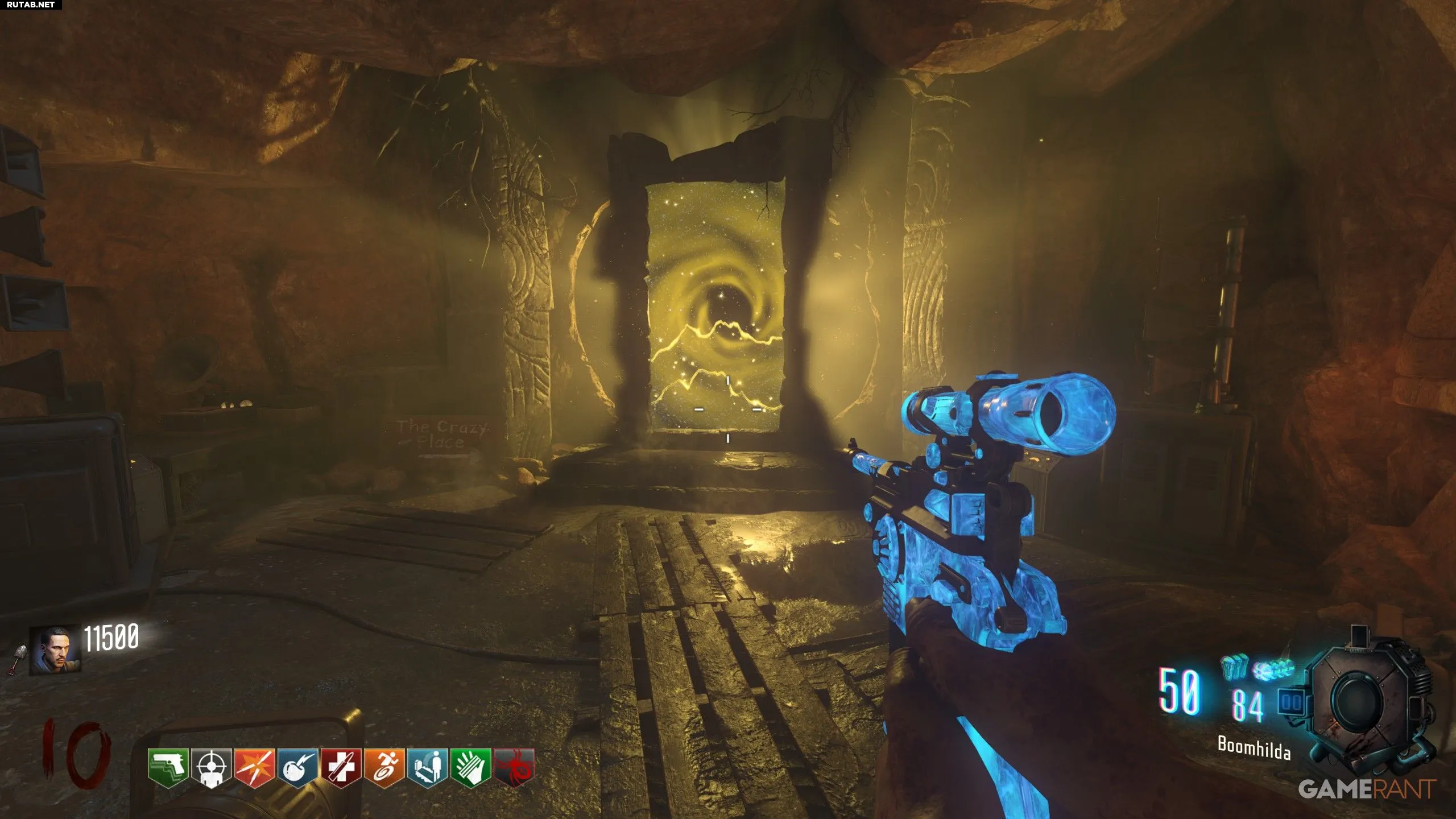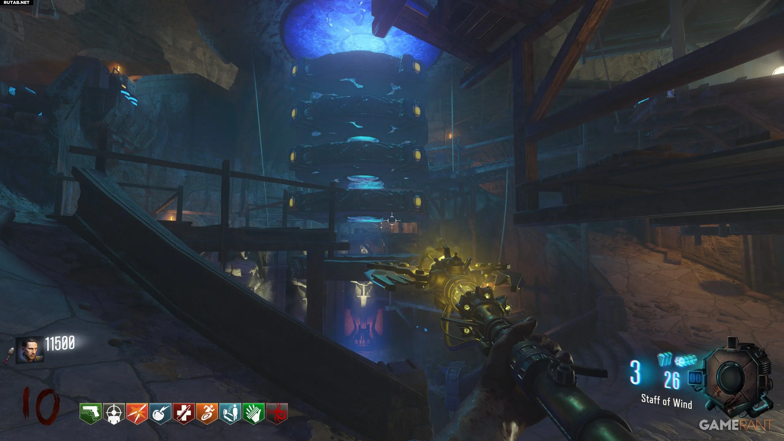 Когда у вас будут и диск, и граммофон, взаимодействуйте со столом под лестницей от Pack-a-Punch, чтобы открыть секретную зону, где можно создавать посохи.