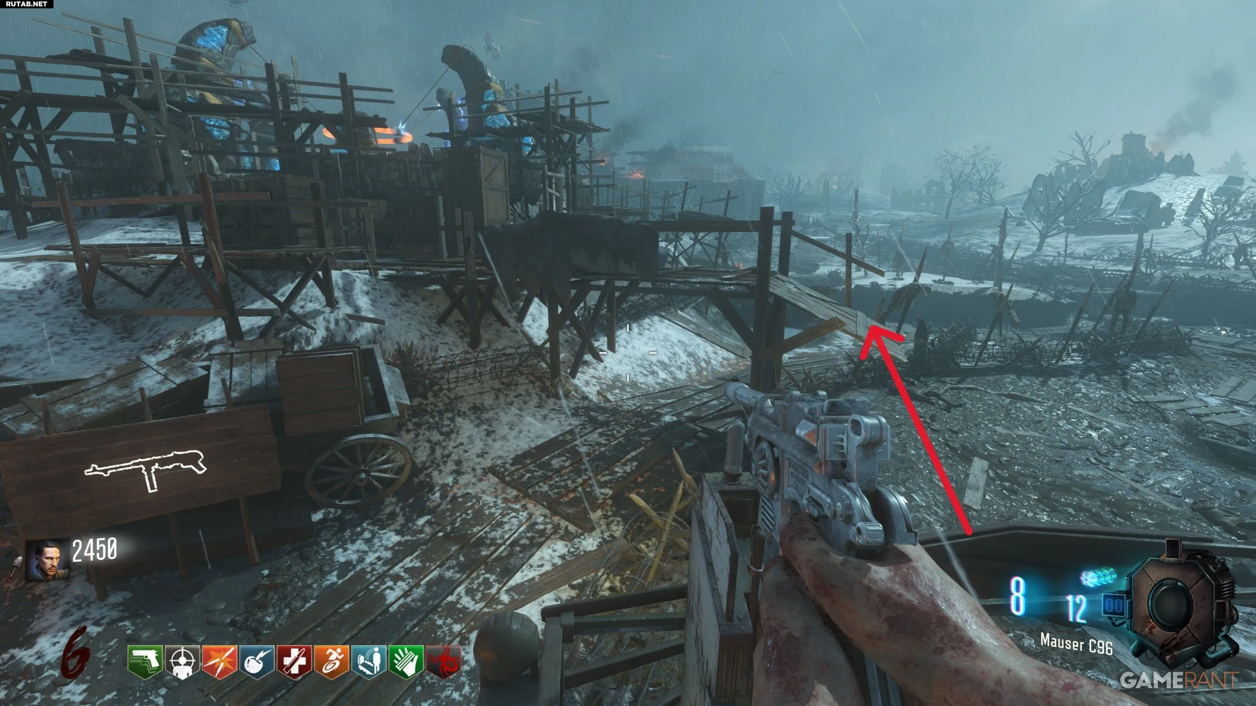 - Проезжая мимо «Раскопок», посмотрите налево. Увидев точку покупки MP-40, запрыгните на деревянный настил и возьмите следующую деталь.
