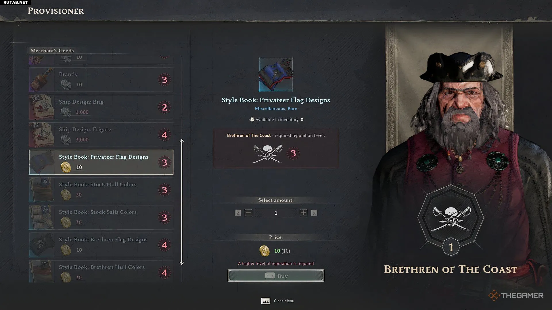 Поставщик фракции Беспутные Буканьеры продаёт следующие товары за пиастры и гинеи по мере роста вашей репутации: