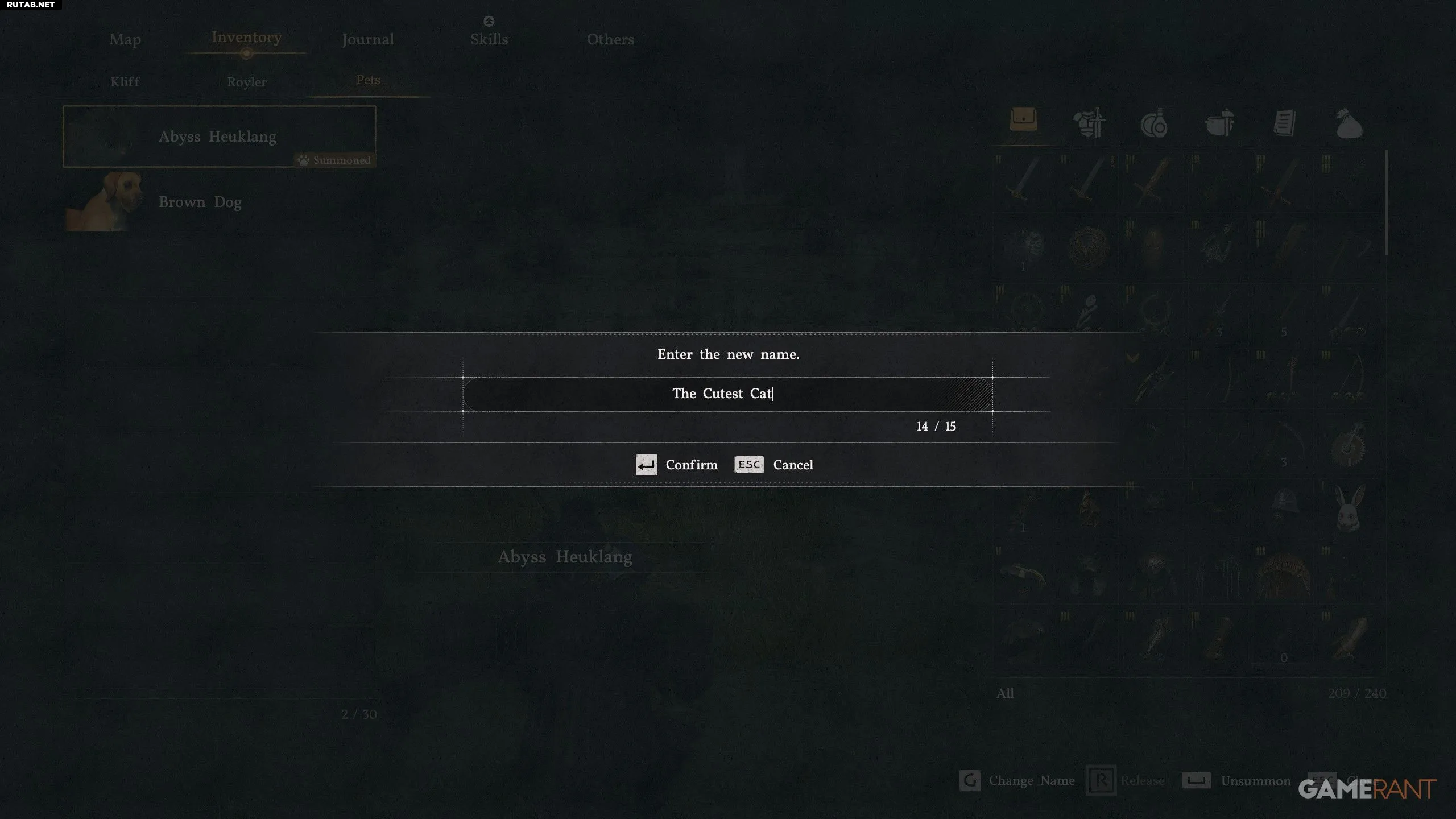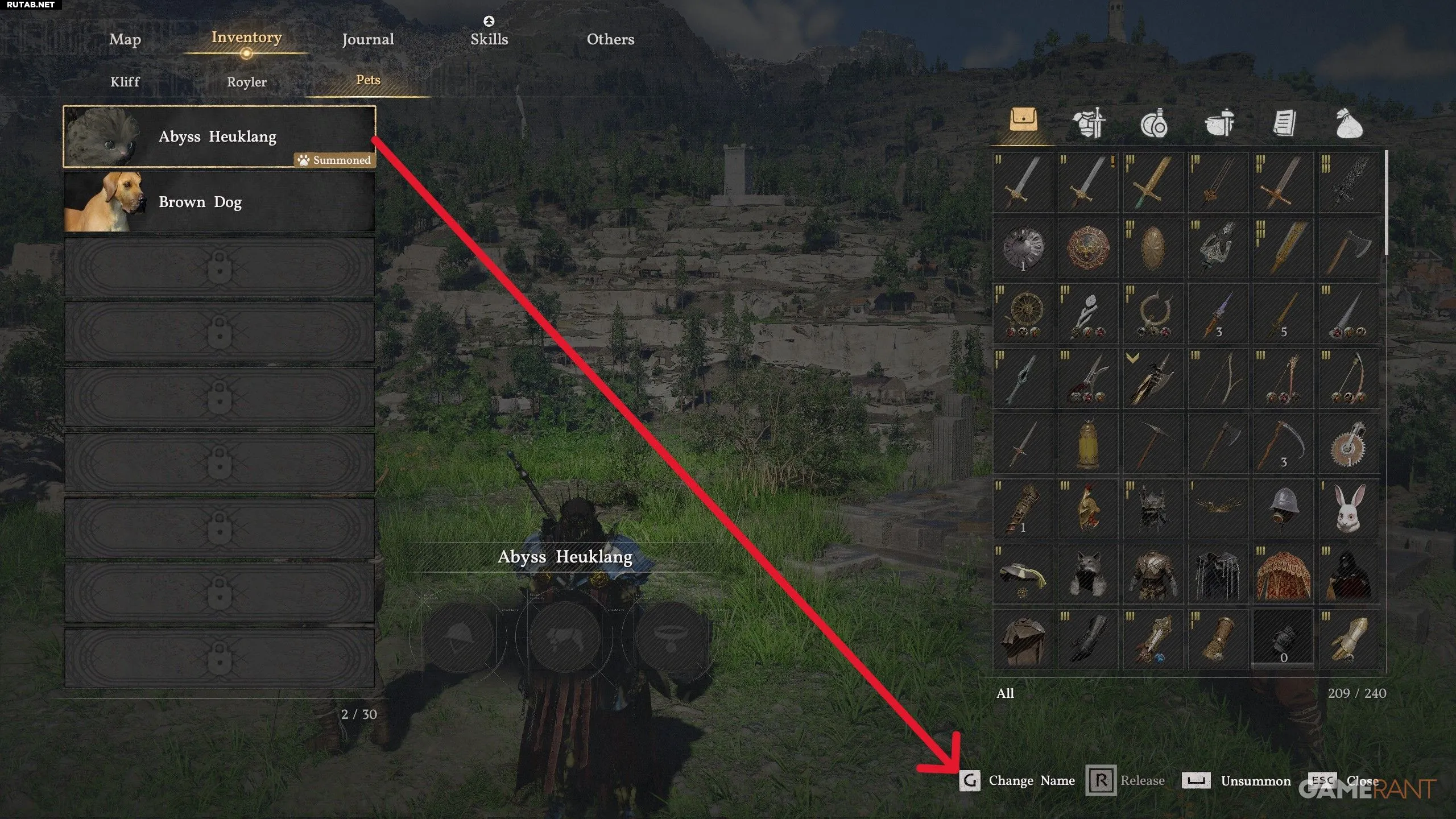 - Чтобы изменить имя питомца, сначала откройте инвентарь, нажав кнопку «Параметры».
