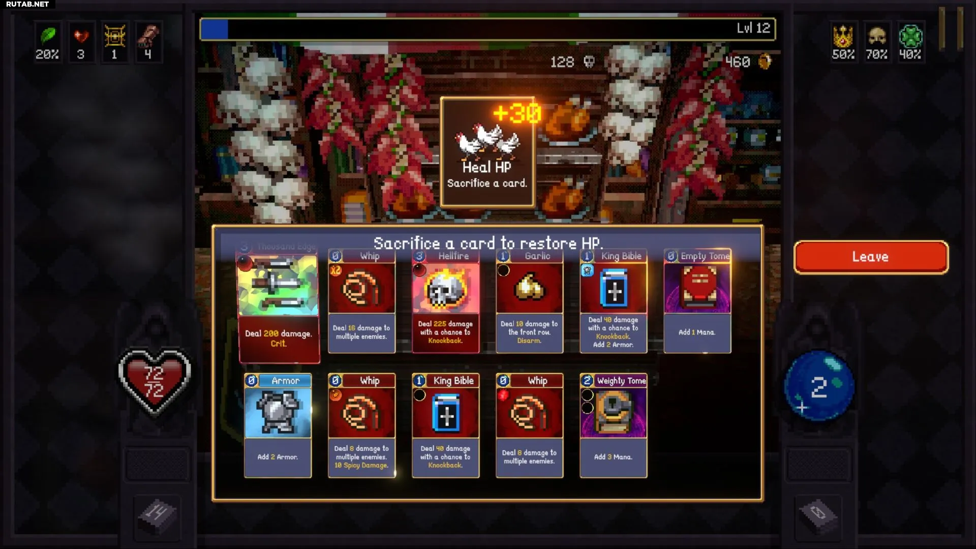 Самый эффективный, но наименее надёжный метод. Во время исследования этажа подземелья вы можете наткнуться на закусочную. Там можно пожертвовать одну карту из своей колоды, чтобы восстановить 30 HP.