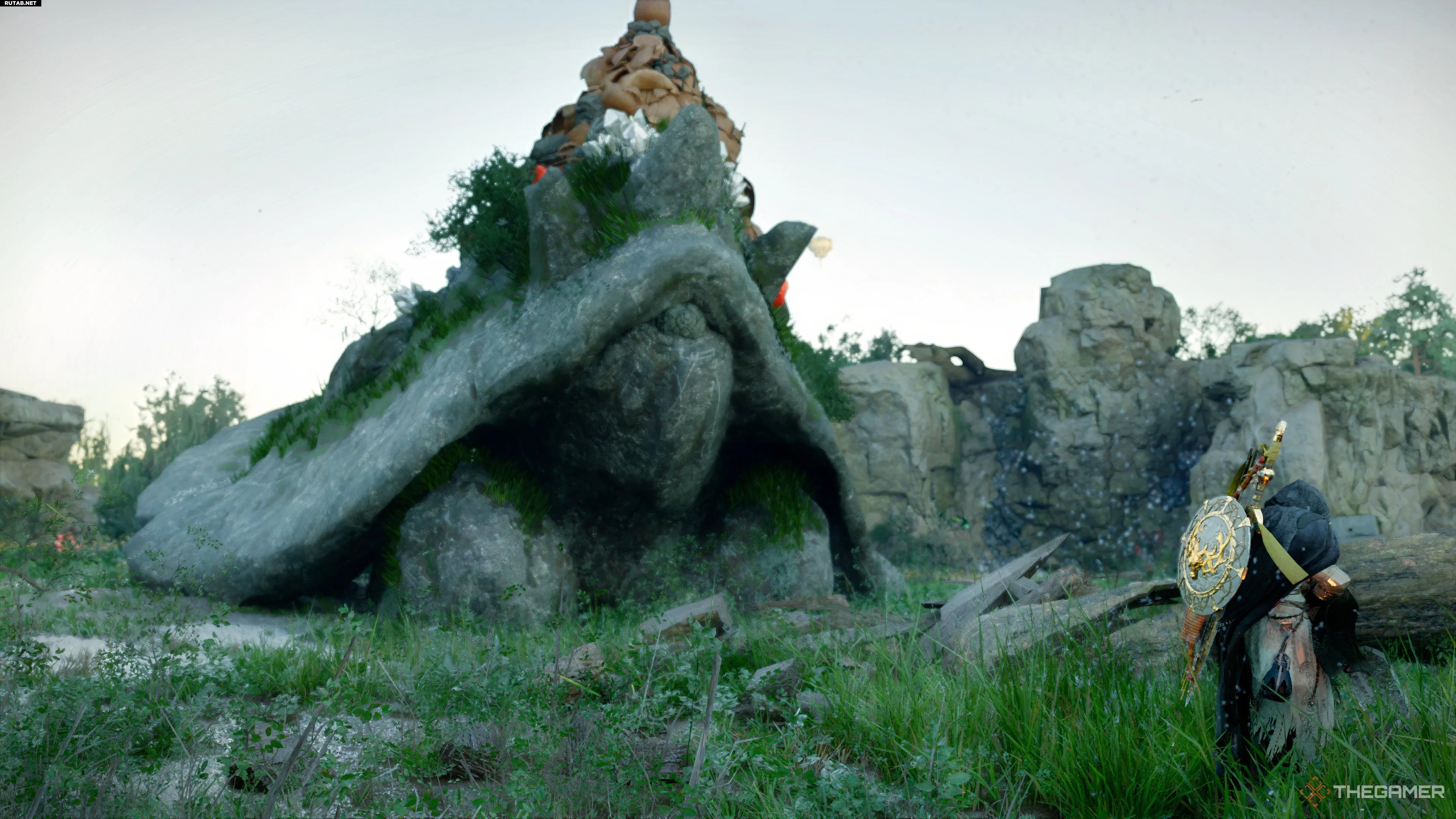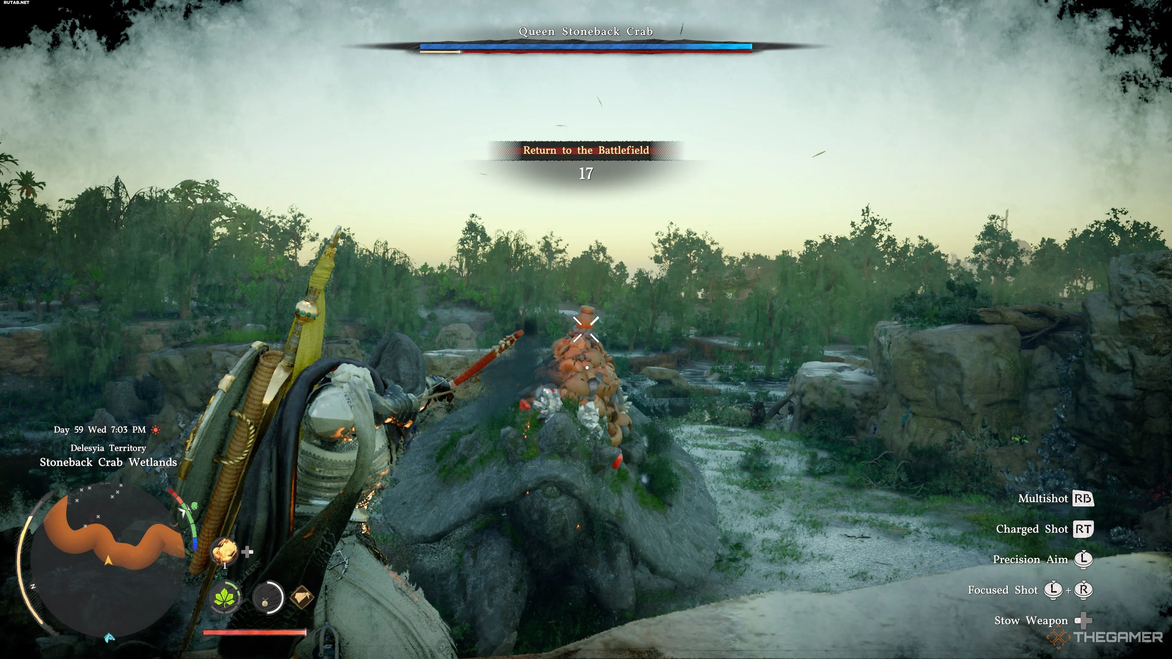Следуйте за маркером квеста к центру озера, и вы запустите кат-сцену, в которой появится босс Королева камнекрабов.