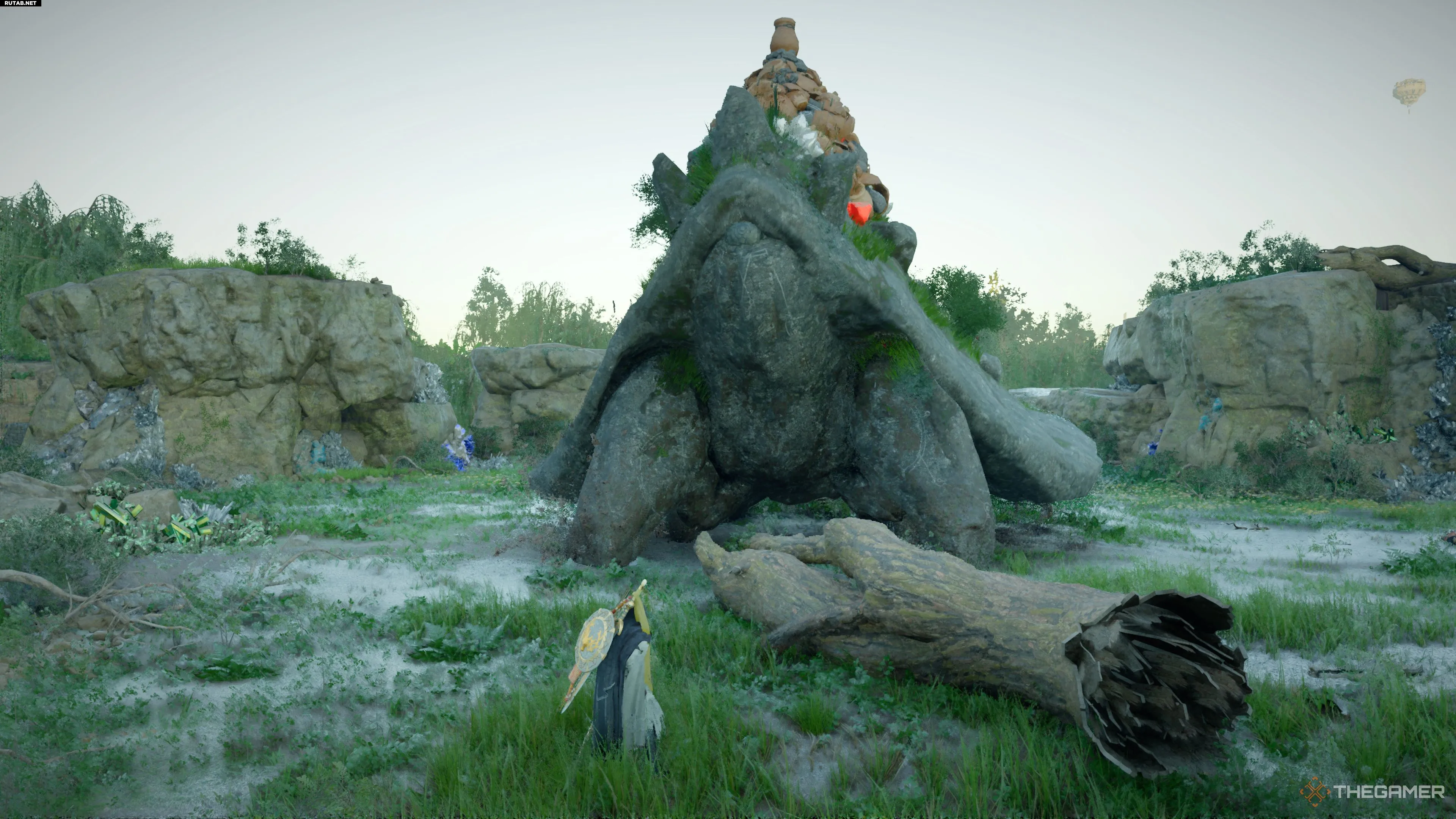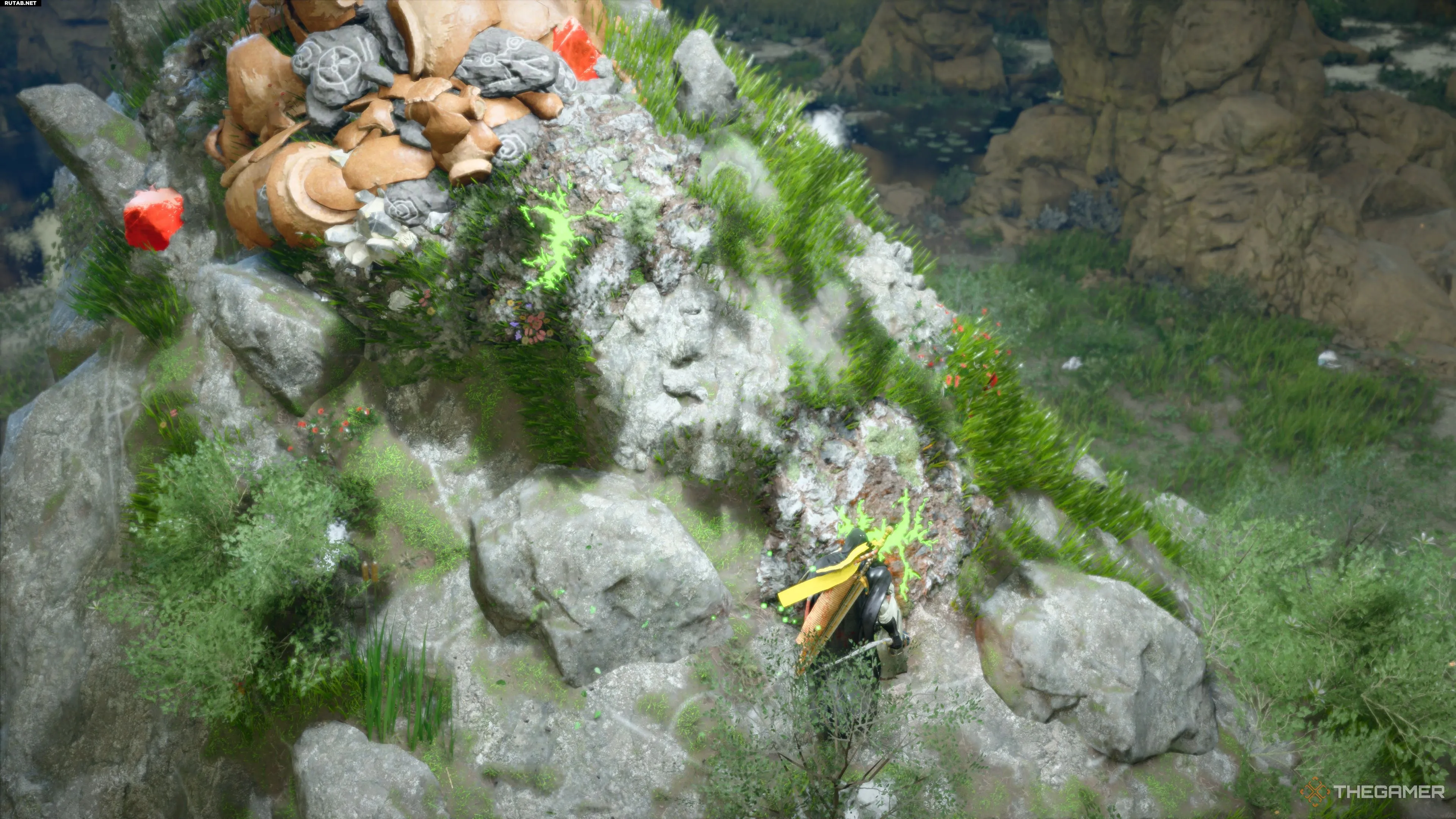 В качестве альтернативы вы также можете забраться на одну из близлежащих точек обзора и использовать Бомбы-стрелы, чтобы сбить минеральные наросты, скрывающие уязвимые точки босса.