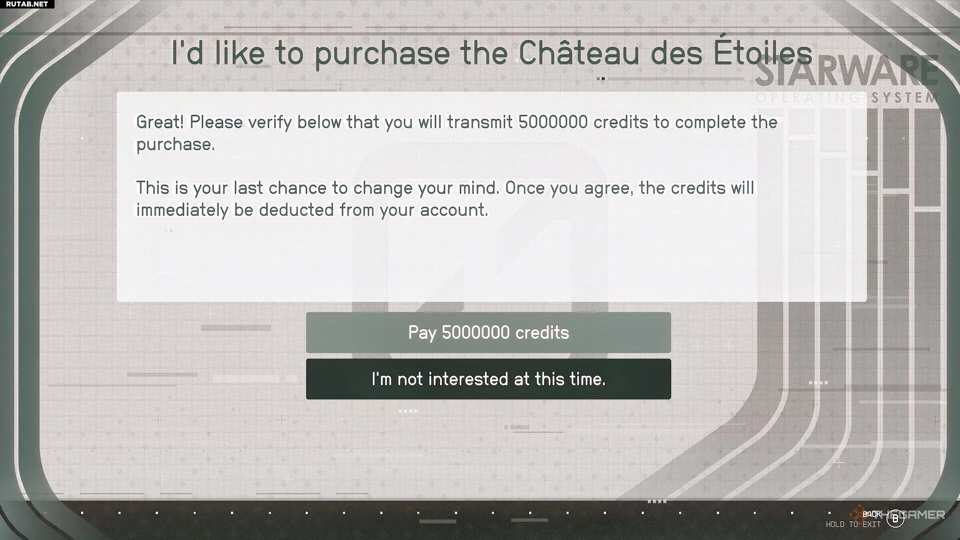 Внутри вы найдете комнату, принадлежащую Риши Сенту. Воспользуйтесь компьютером, чтобы получить информацию о покупке Chateau des Etoiles. Этот особняк в астероиде обойдется вам в 5 миллионов кредитов.