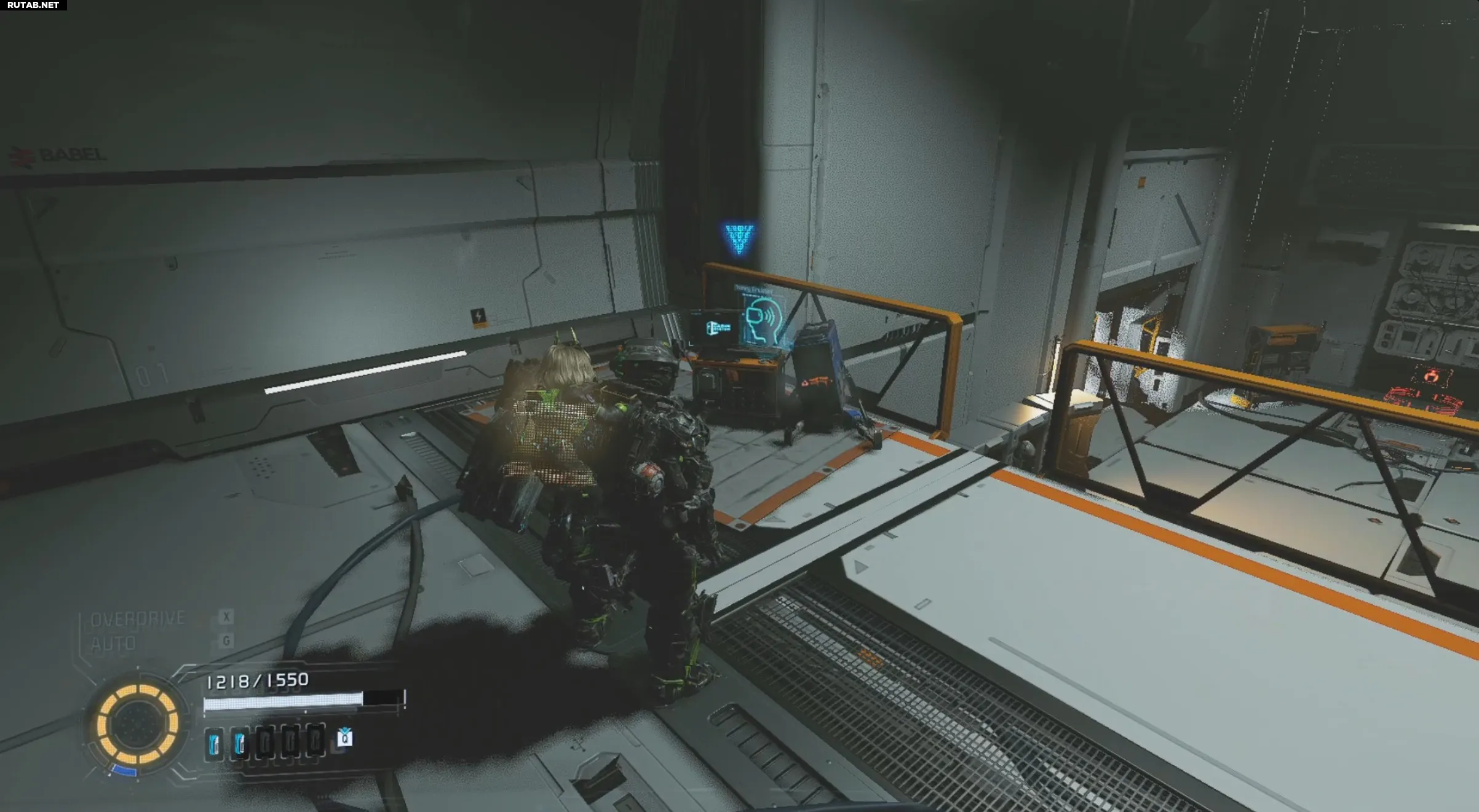Продвигайтесь дальше, минуя платформинг с пониженной гравитацией и первую встречу с LunaDigger. Вы попадёте в комнату со станцией трамвая у точки доступа к башне. Зайдите внутрь и найдите сломанного Mr. Cabin рядом с перилами. Обучающие данные лежат прямо на этом разбитом модуле.