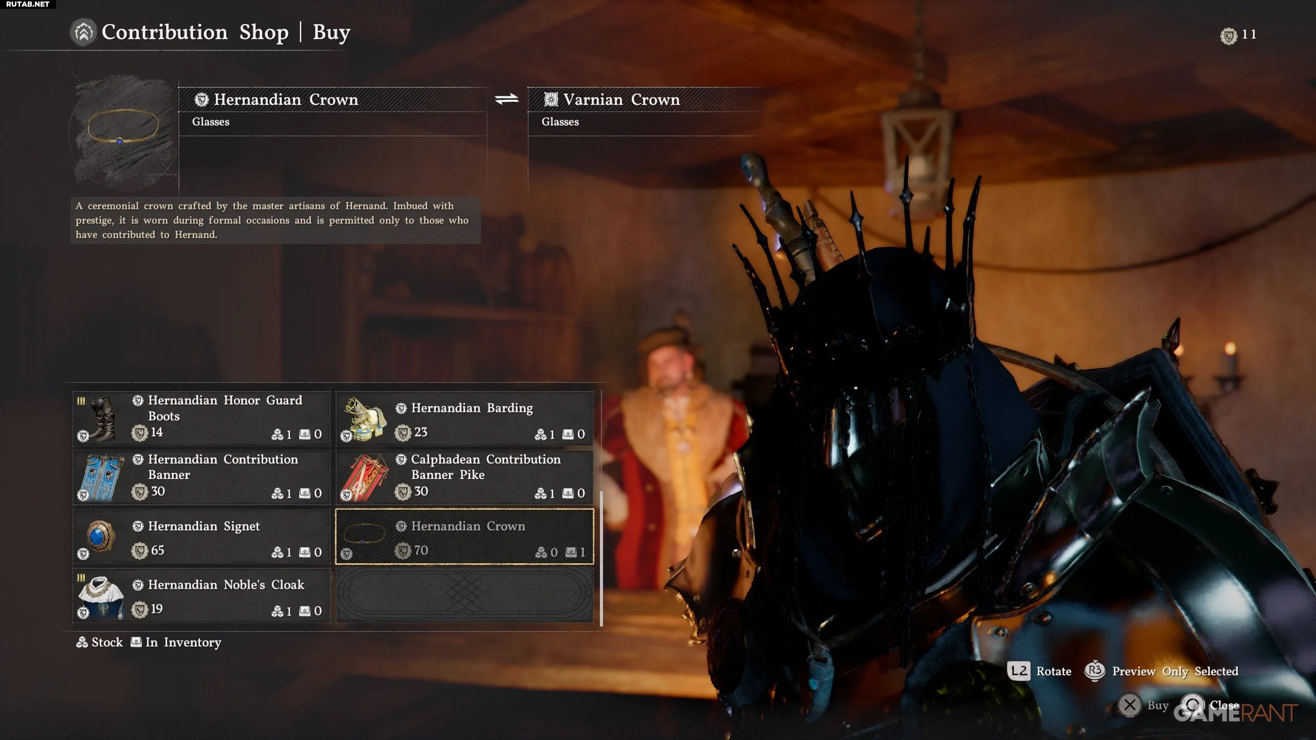 - Корону Эрнанда можно купить за 70 Очков репутации в Лавке (репутация в Эрнанде), которая находится в Замке Эрнанда.