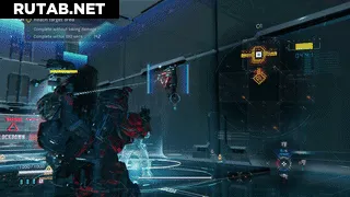 Секция 2 начинается сразу после первой комнаты и включает короткий участок с платформами. Не спешите: прыжки не нужно делать за один раз, времени достаточно. Единственная хитрость — когда минуете платформы и столкнетесь с тремя роботами. Сначала быстро выстрелите одним зарядом из пушки-приманки прямо на край лазера. Затем очень быстро взломайте робота слева и выстрелите 1–2 раза в его уязвимое место. Это заставит летающего робота зафиксироваться на нем.