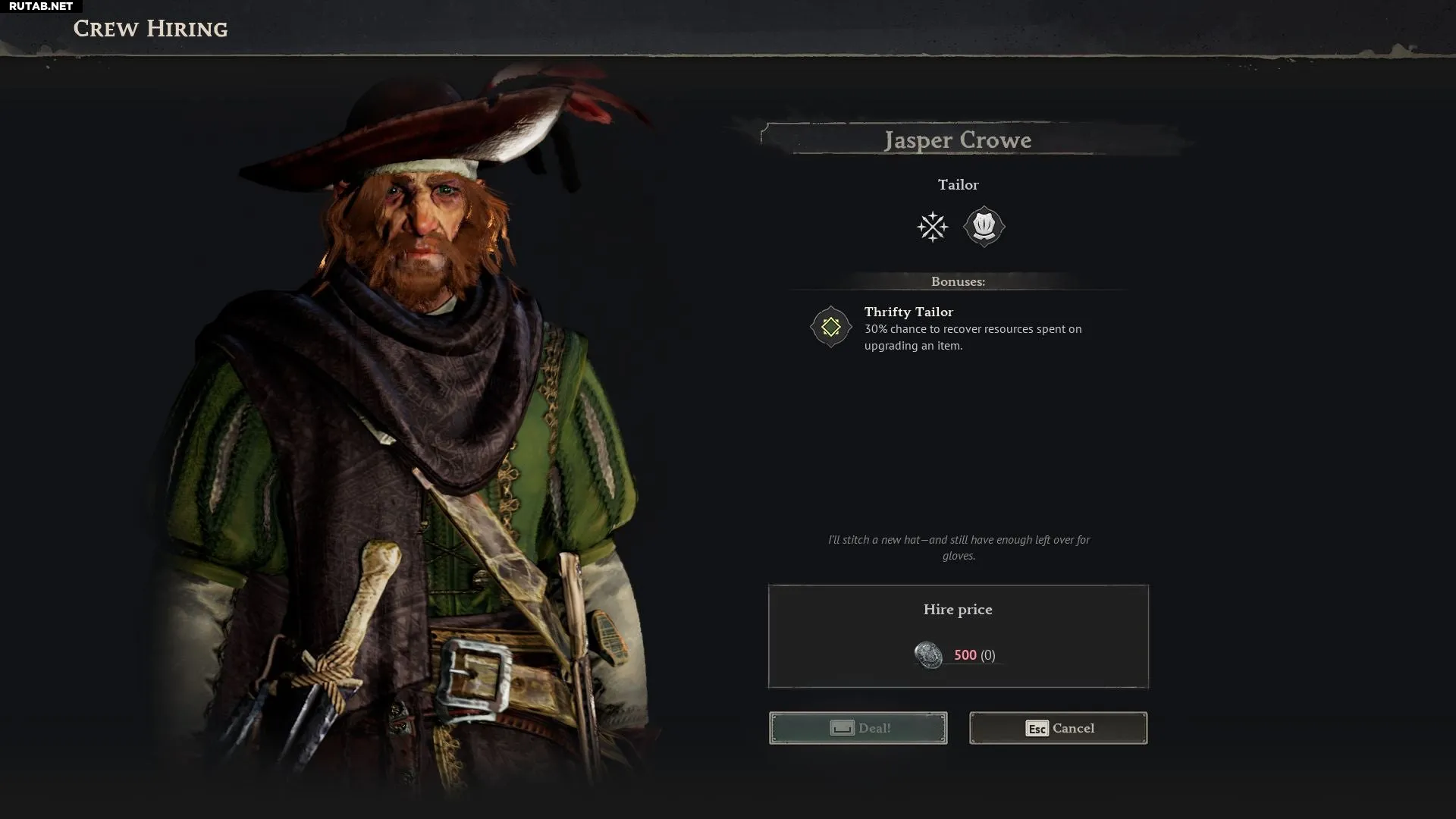 Также на Тортуге можно нанять членов команды. У них есть специальные роли (например, портной или алхимик) и дополнительные бонусы. Портной с умением «Бережливый портной» даёт 50% шанс вернуть ресурсы, потраченные на улучшение предметов. Убедитесь, что у вас достаточно пиастров для найма.