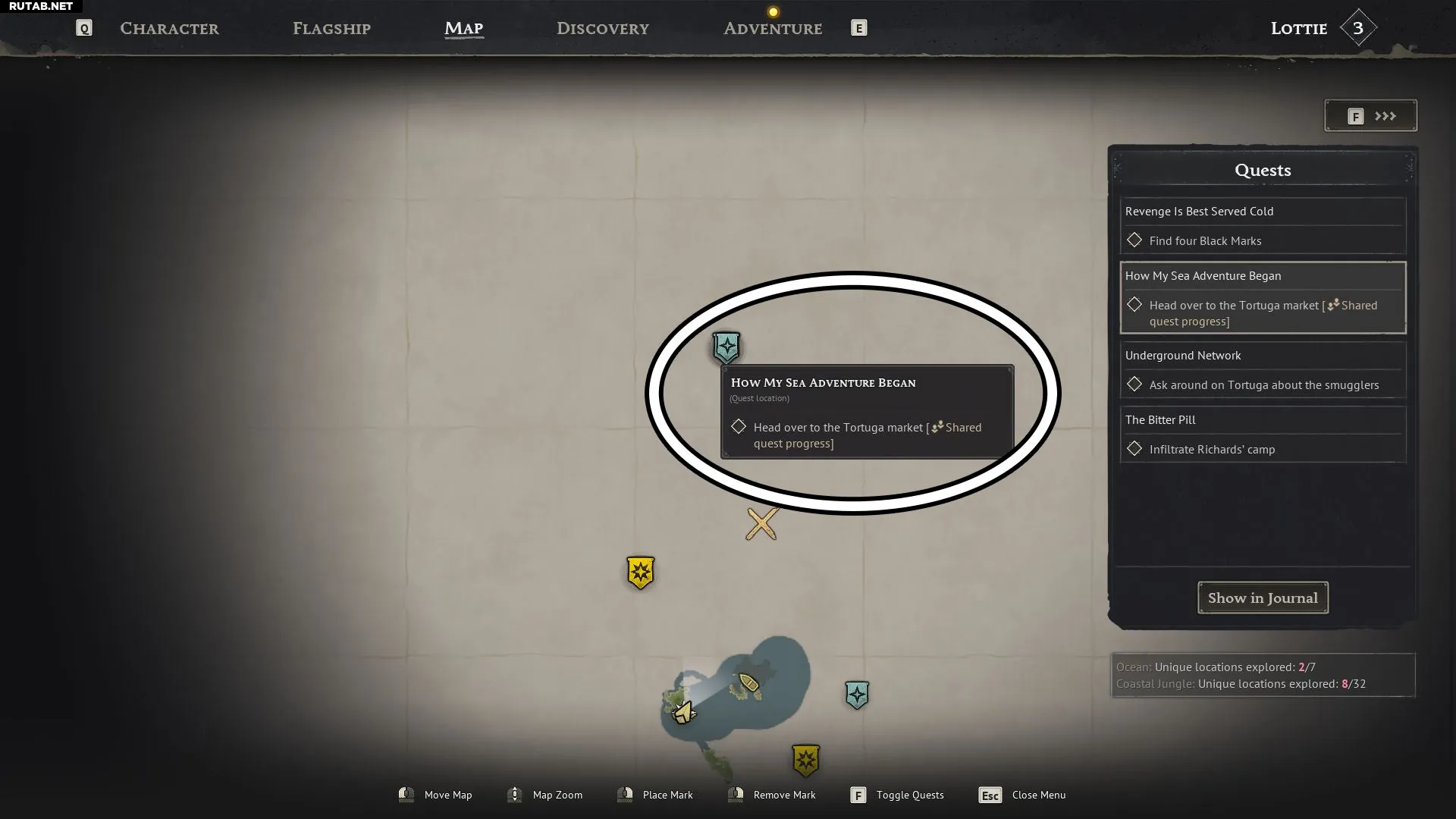 Самый лёгкий способ — пройти обучение «Как началось моё морское приключение». Последняя цель задания поставит метку Тортуги на карте.