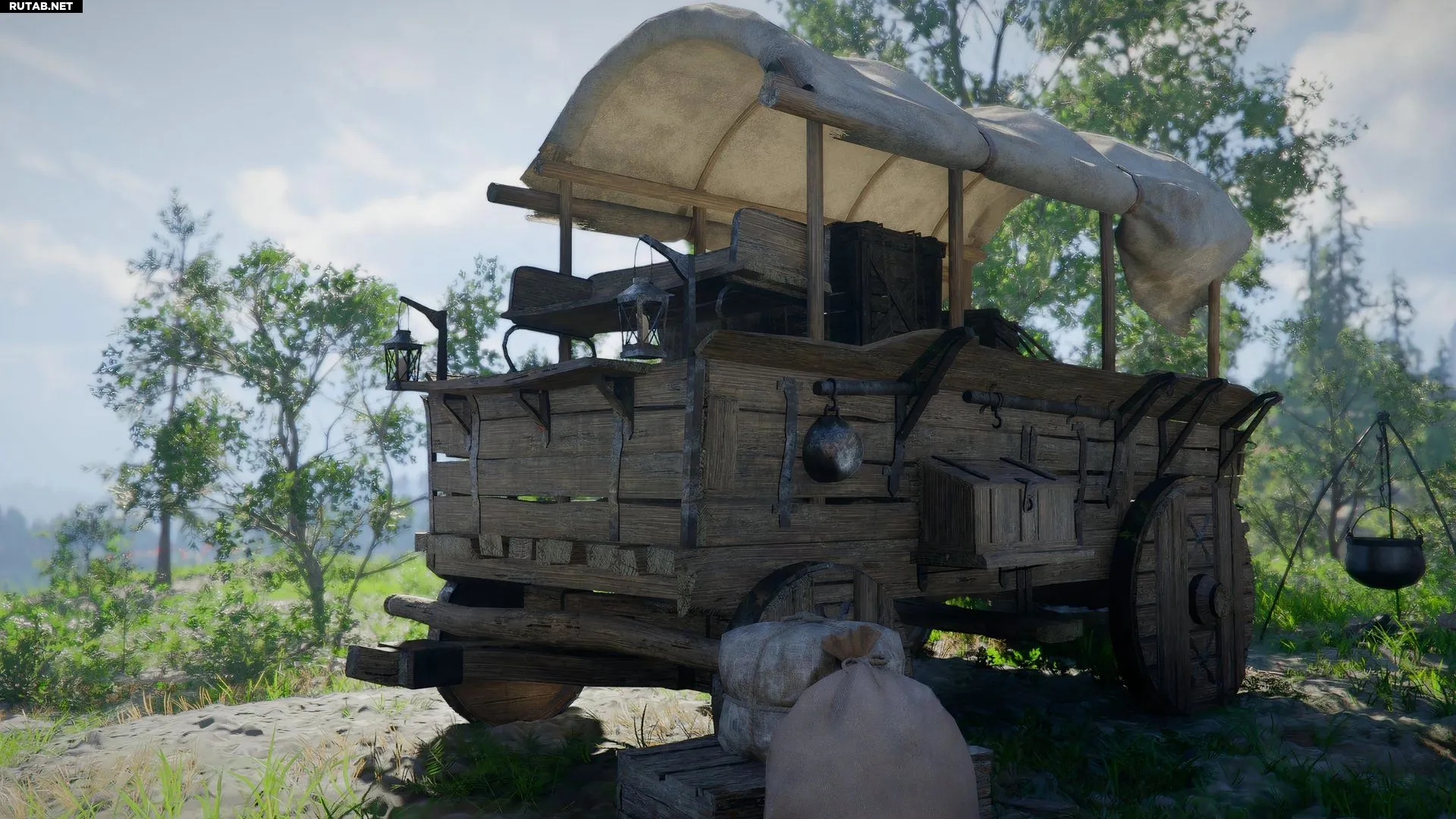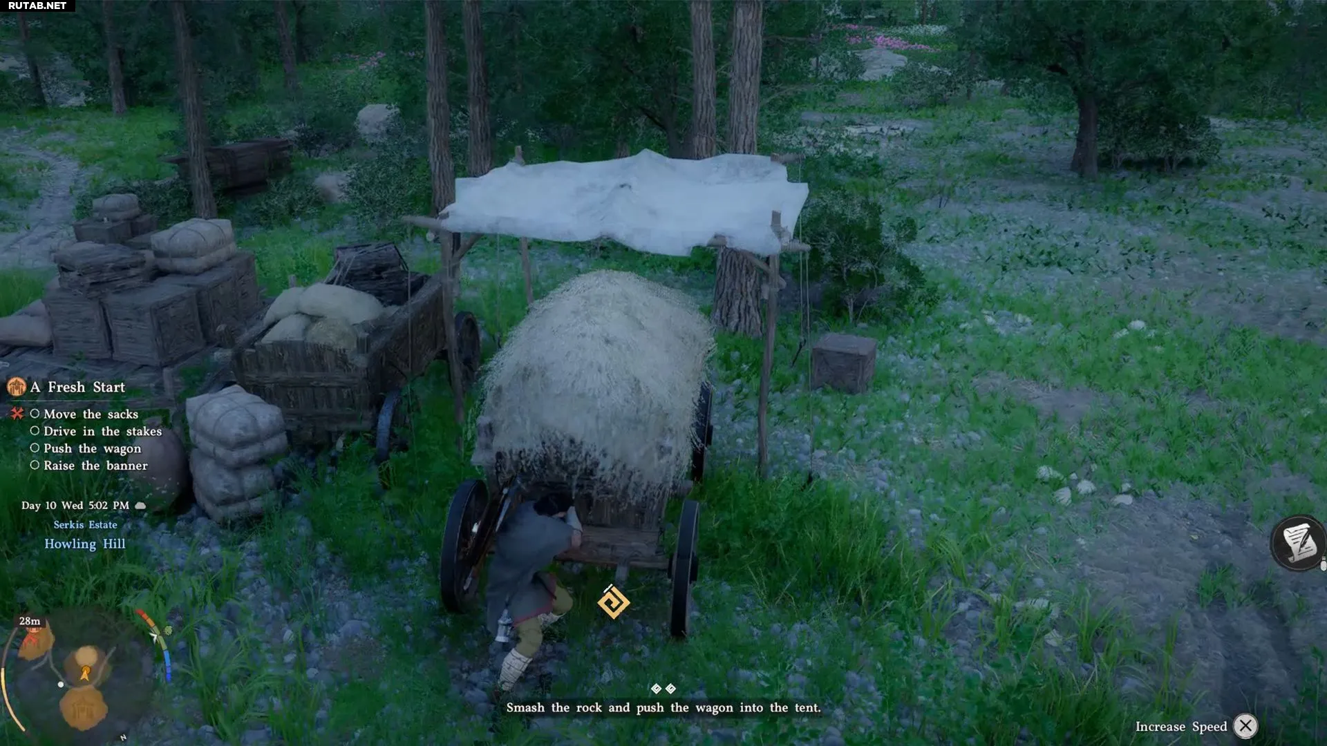 Возьмите Кирку из деревянного ящика возле камней. С её помощью просто разбейте валуны. Затем встаньте позади повозки и, удерживая кнопку движения вперёд, налегайте на неё. Толкайте повозку, пока она не окажется под навесом палатки.