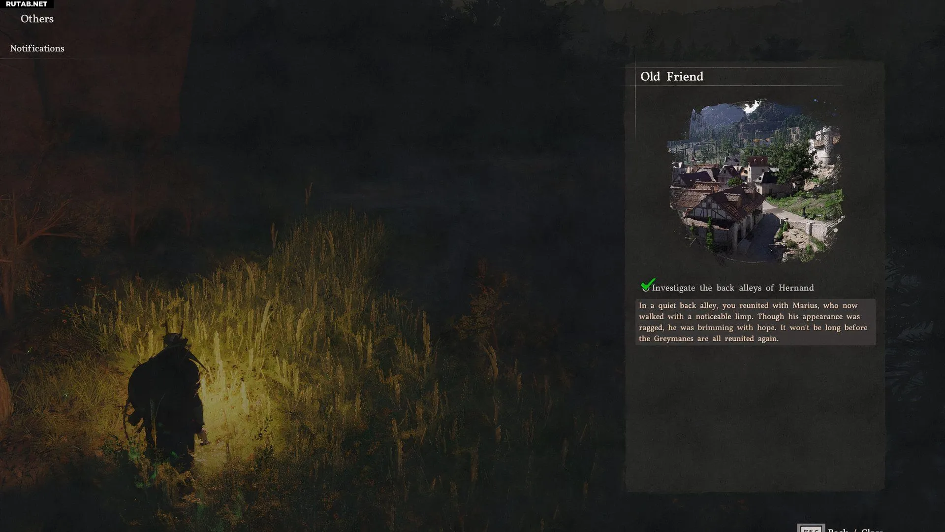 Квест «Поместье» начинается спокойно после хаоса второй главы, где вы одолели Кайлока. Вам нужно посетить закоулки Эрнанда, где слух о выжившем Серогривом приведёт вас к Мариусу. Отправляйтесь в северо-западную часть города, рядом с Кузницей и таверной. Там, на травянистом дворе, вы найдёте Мариуса, прислонившегося к стене.