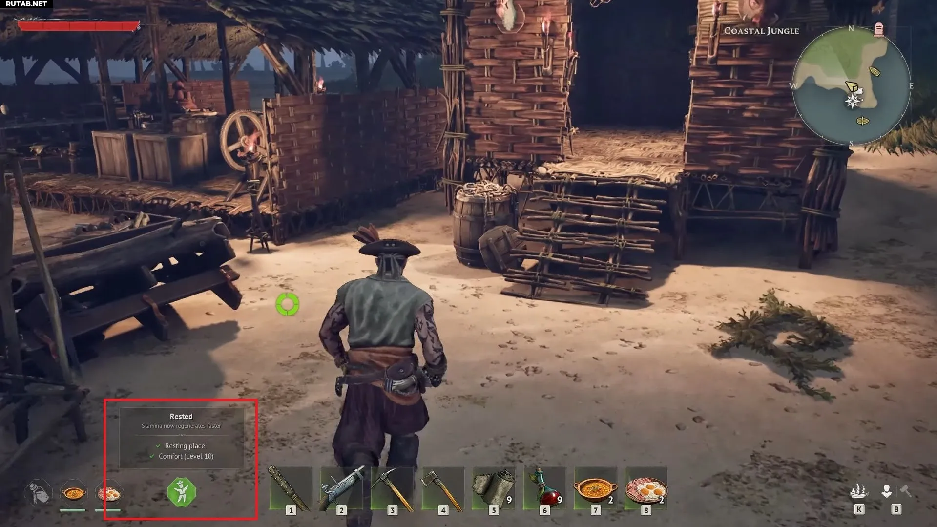 | Таймер | Когда вы покидаете базу, начинается обратный отсчет. Простой костер и палатка (2-й уровень) дают около 5 минут статуса Отдыха, но длительность значительно растет с повышением Комфорта. Например, достижение 10-го уровня увеличивает таймер почти до 17 минут, позволяя зачищать целые острова или участвовать в затяжных морских сражениях, не теряя преимущества в выносливости. |