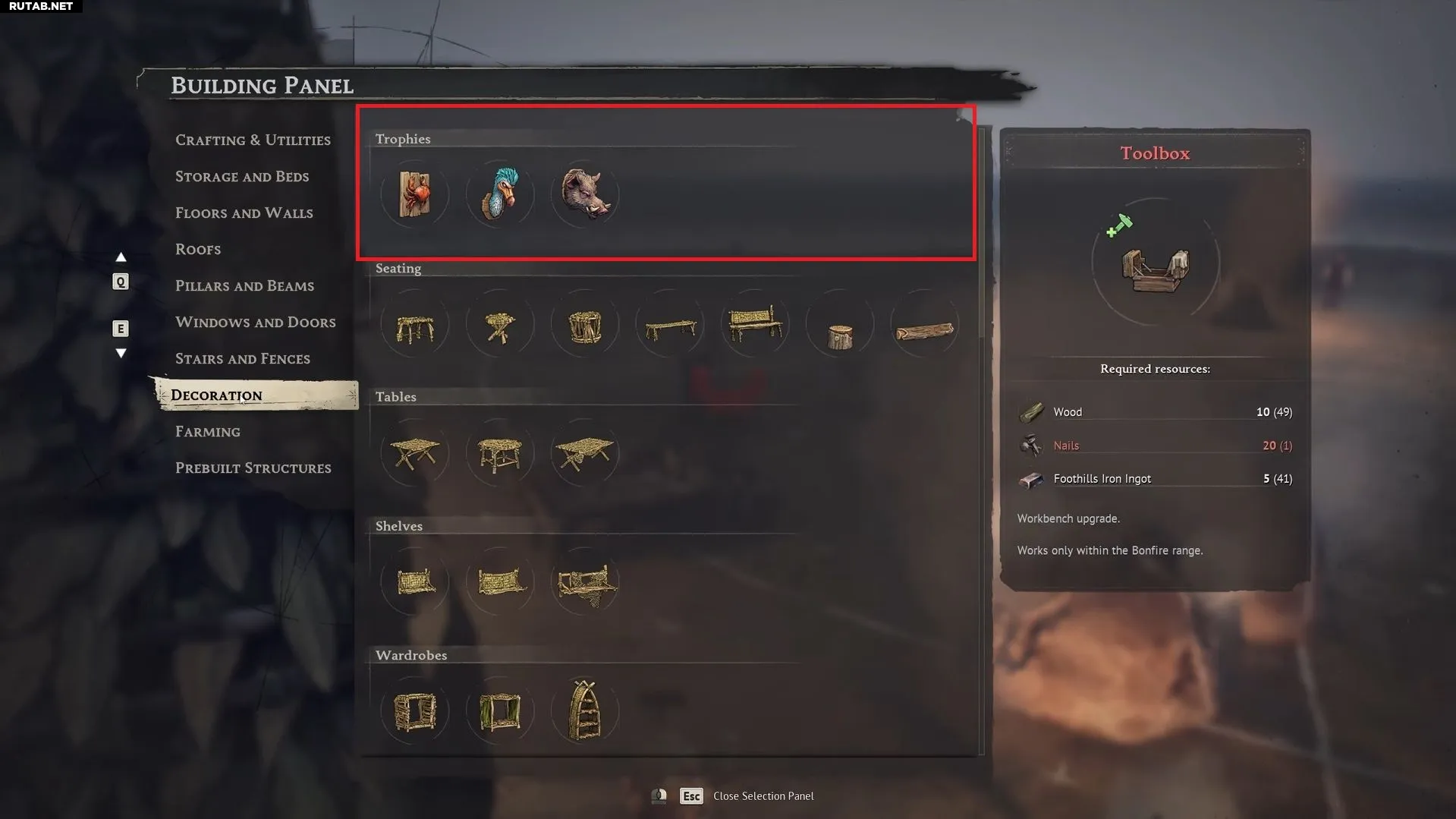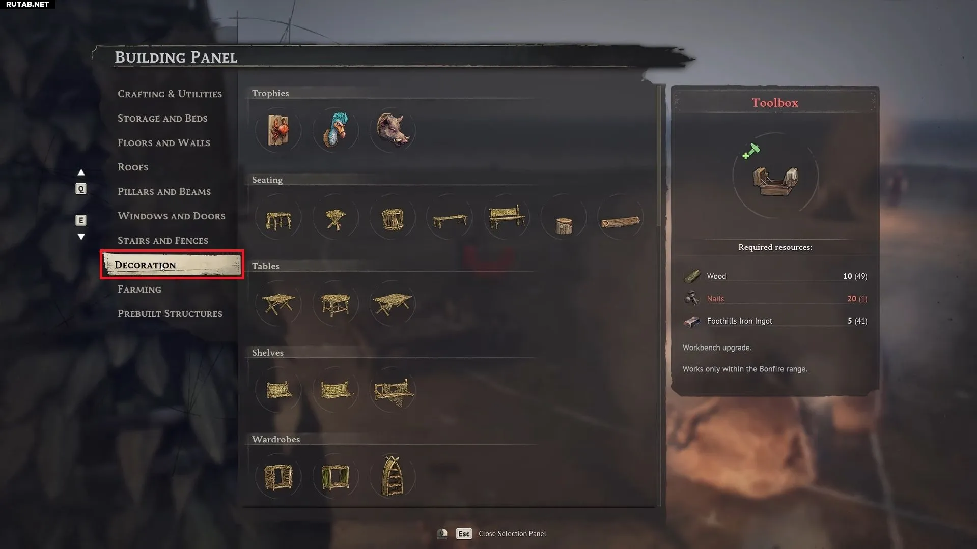 Чтобы начать украшать базу, нажмите «B» для открытия меню строительства и перейдите на вкладку «Украшения». Большинство предметов начального уровня сделаны из дерева, поэтому повысить свой показатель можно почти сразу.