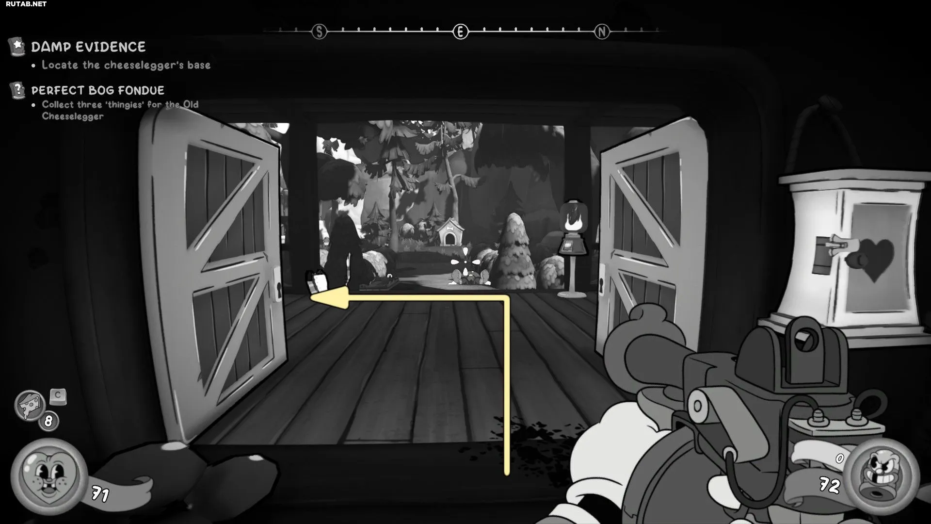 Оказавшись снаружи, войдите в хижину перед собой и сразу посмотрите налево. На оборудовании для перегонки в углу лежит Бейсбольная карточка. Заберите её, затем поговорите со Старым сырным контрабандистом, чтобы продвинуться в квесте «Идеальное болотное фондю».