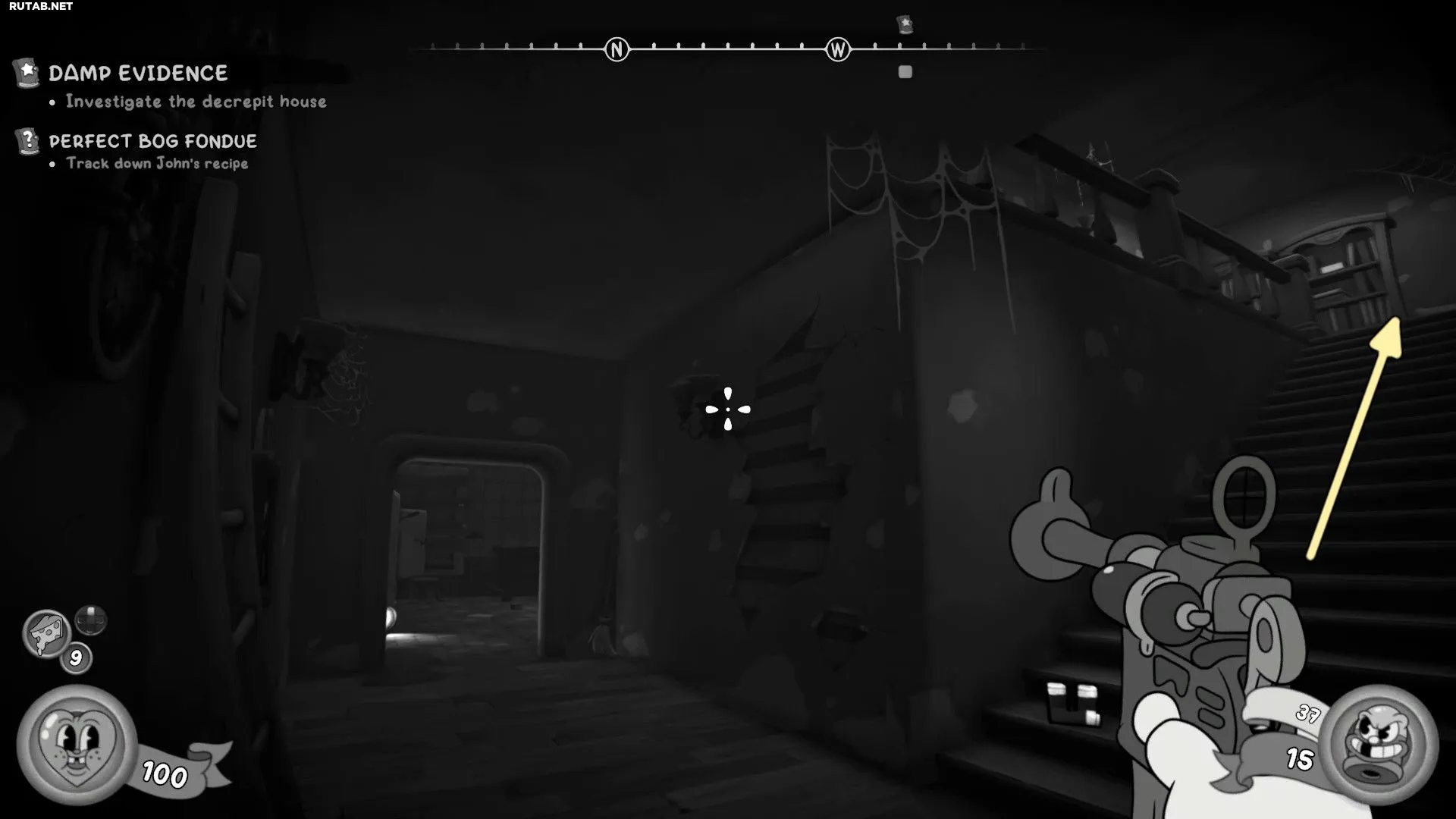 Поднимитесь по лестнице в начале уровня и войдите в комнату наверху. В углу на стуле лежит Газета. Заберите её, затем пройдите через кухню и подвал.