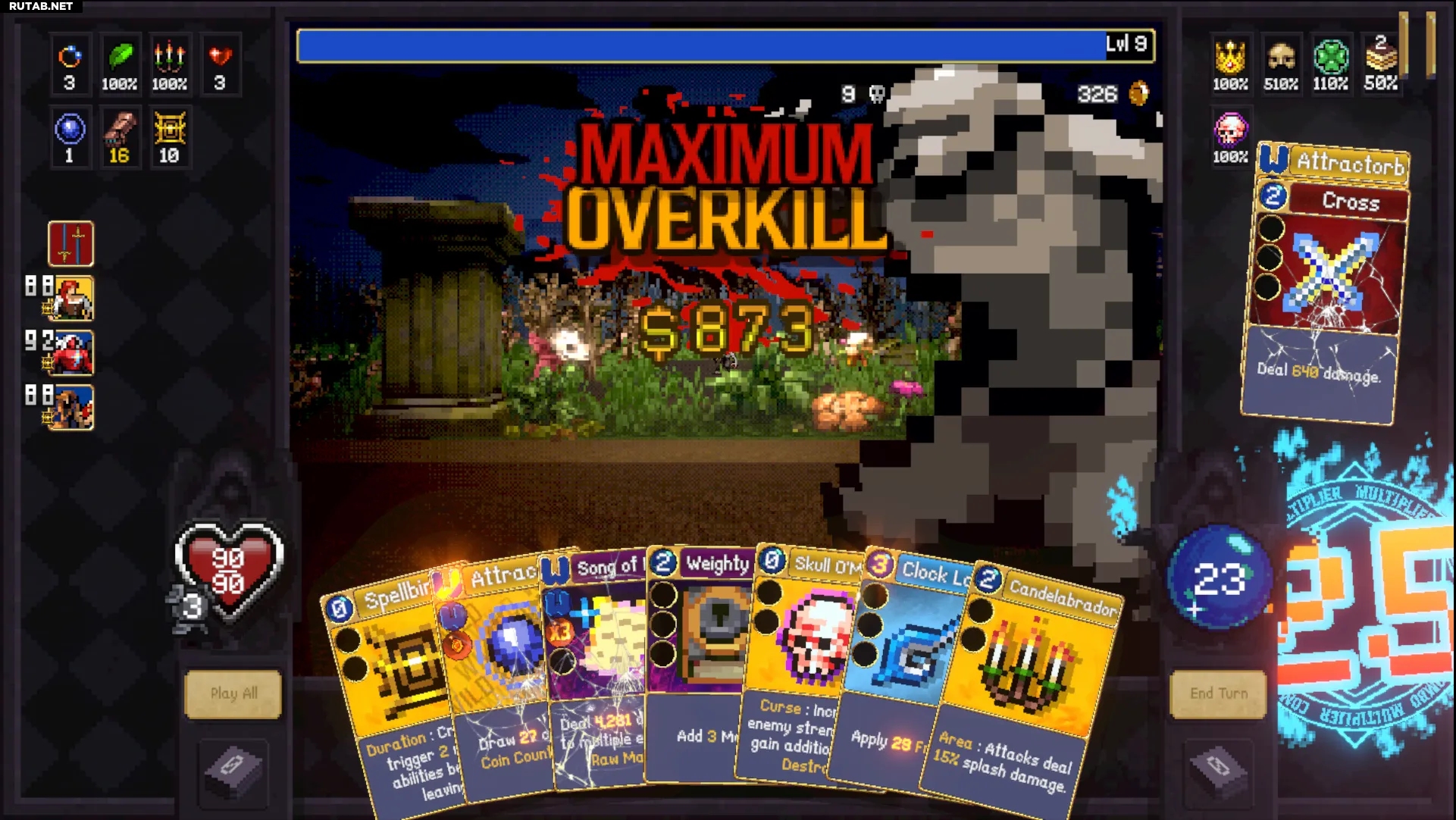 Наслаждайтесь бесплатными деньгами. Вы убиваете мобов и боссов с одного удара, фармите оверкиллы и смерти карт, которые вы уничтожаете. Вы даже можете уничтожить несколько карт за одну встречу. Цикл тот же: в конце первой смерти от уничтоженной карты вы ломаете следующую карту (но не ломайте две карты одну за другой — при двух смертях на одном экране вы получите только один оверкилл).