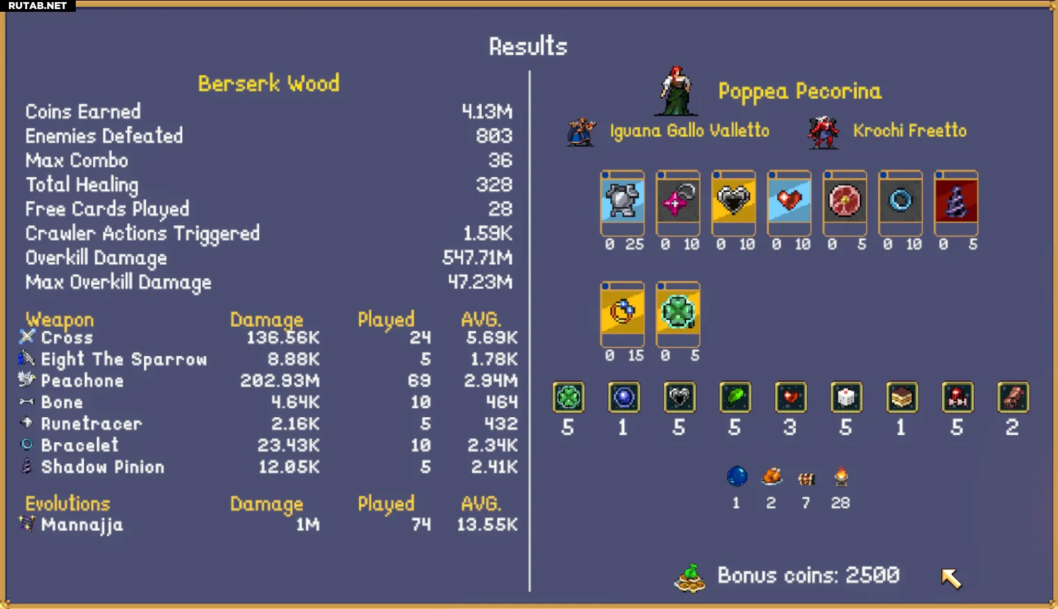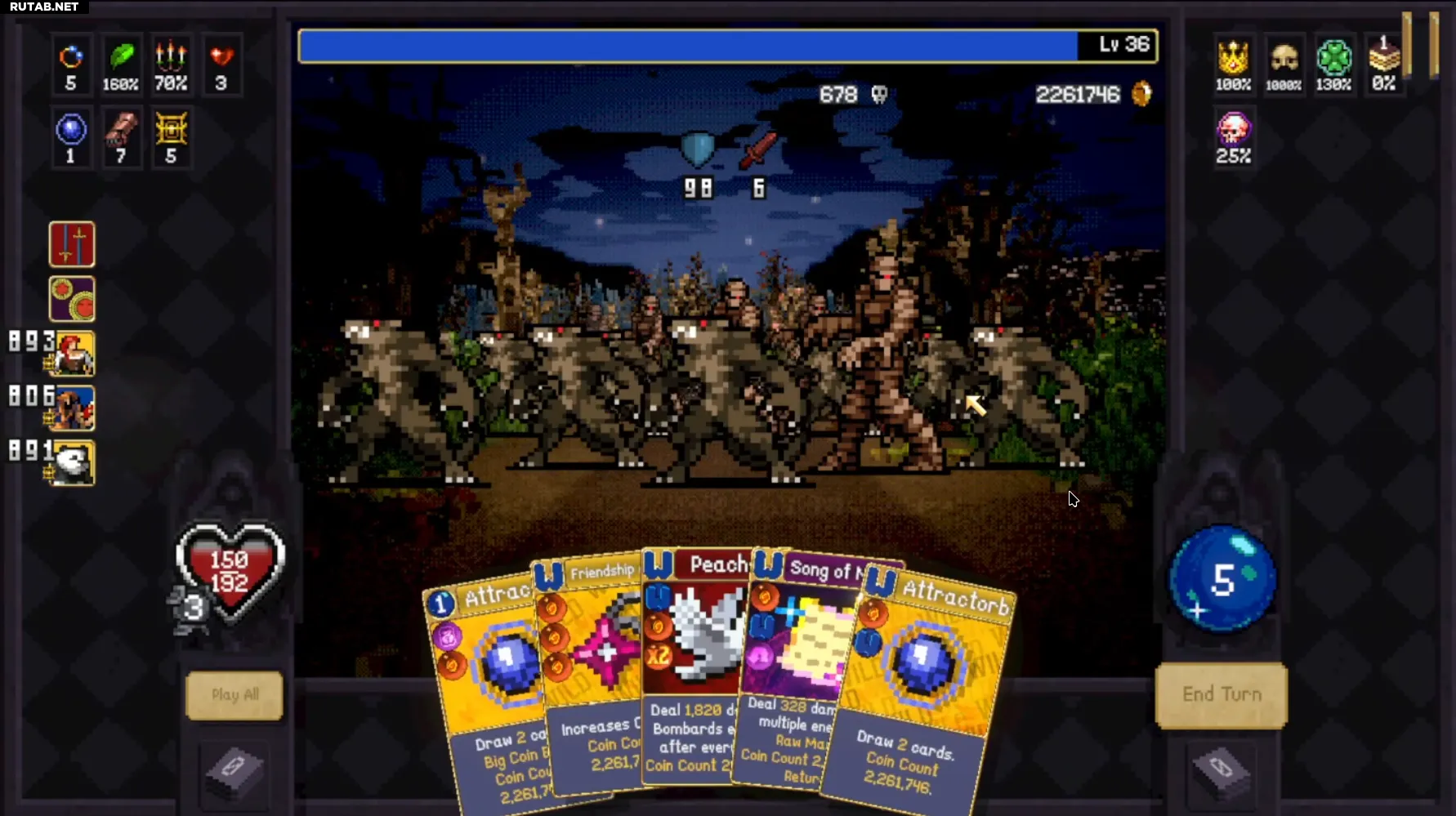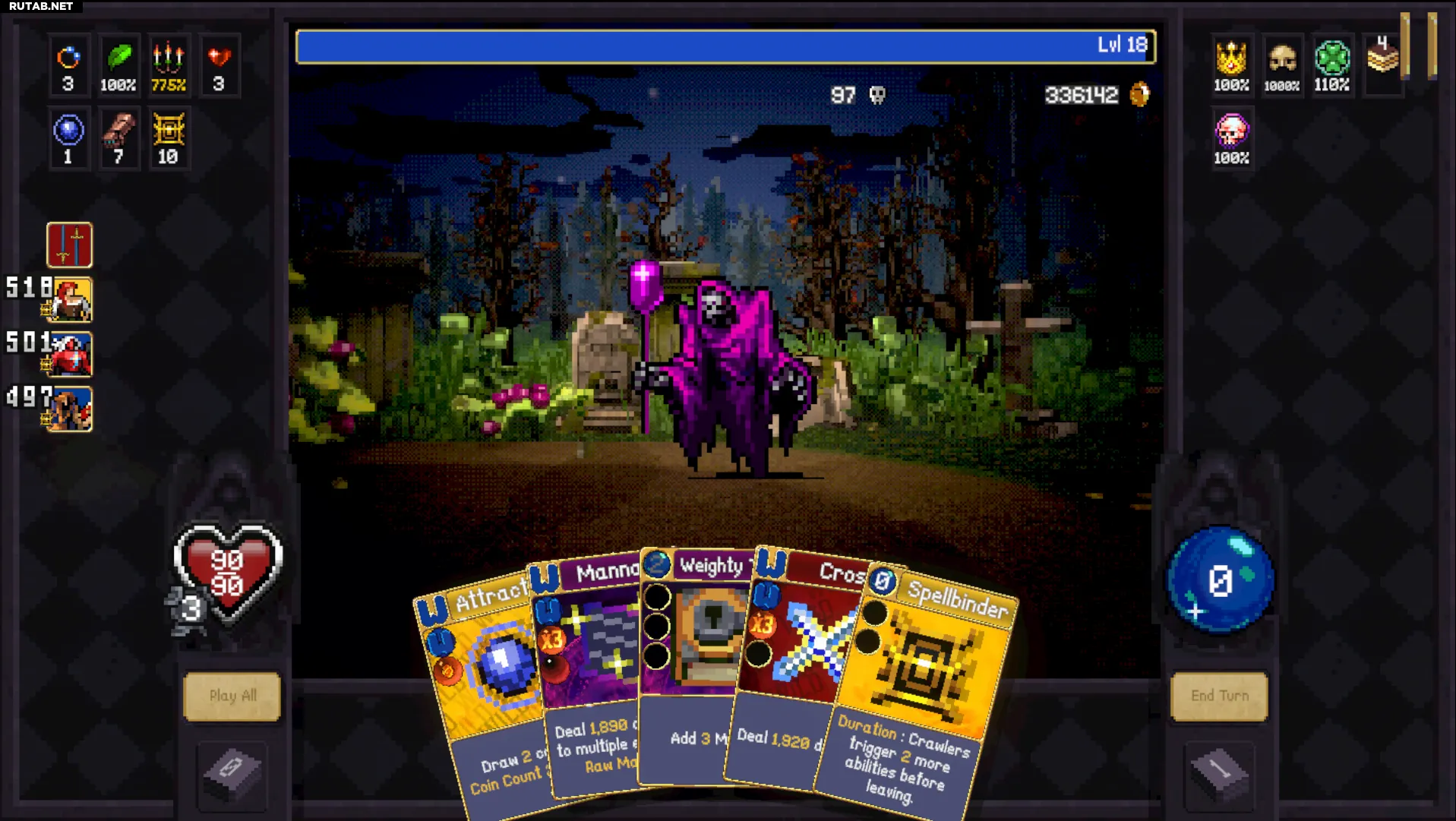 Неважно, где вы проходите забег: вы не получаете больше денег за элитных мобов — вы зарабатываете на оверкиллах. Нужно быстро убивать мобов и максимально быстро накапливать оверкилл. Мне нравится «Бешеный лес»: на первом этаже есть статуя эволюции, позволяющая рано эволюционировать «Песнь Маны» (или взять «Череп», чтобы быстро эволюционировать «Маннаю» на втором этаже).