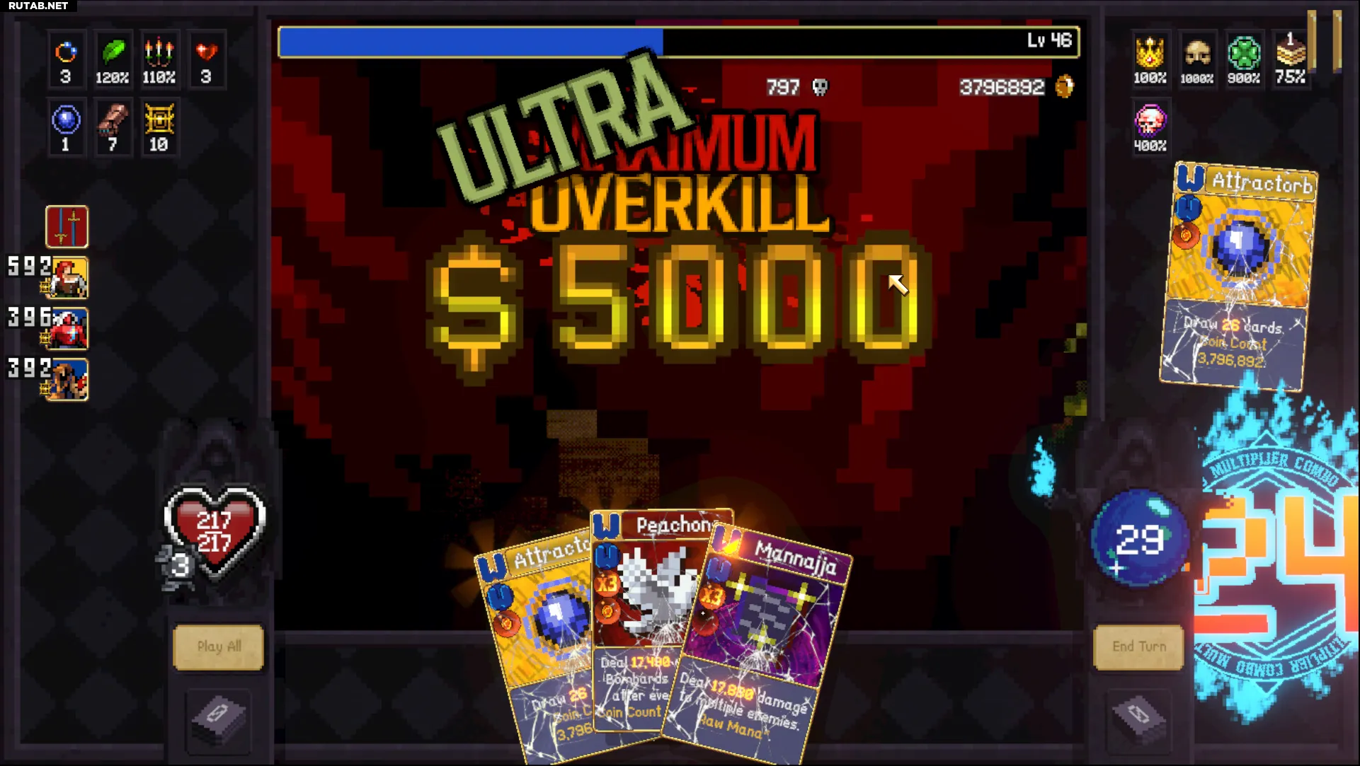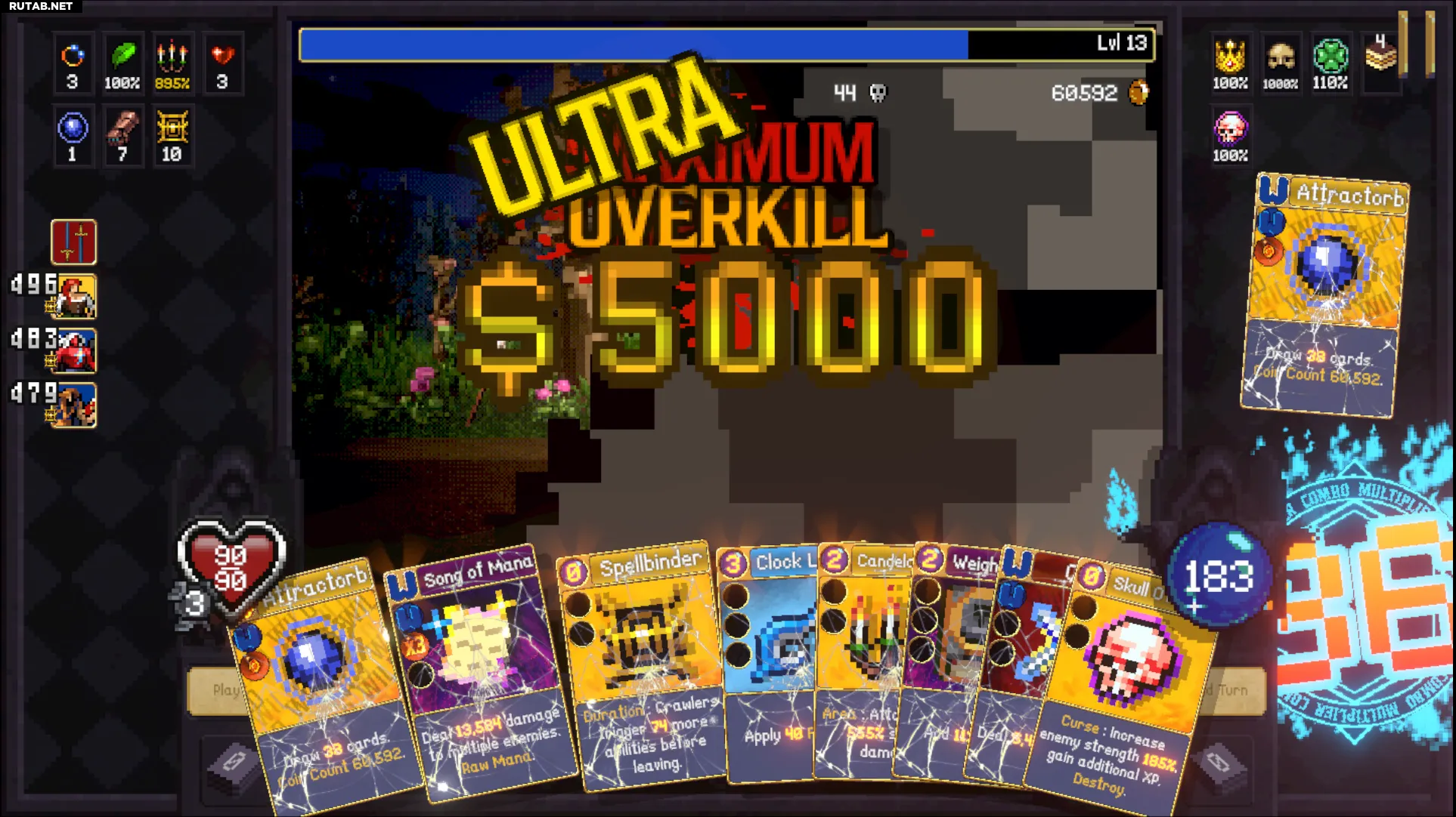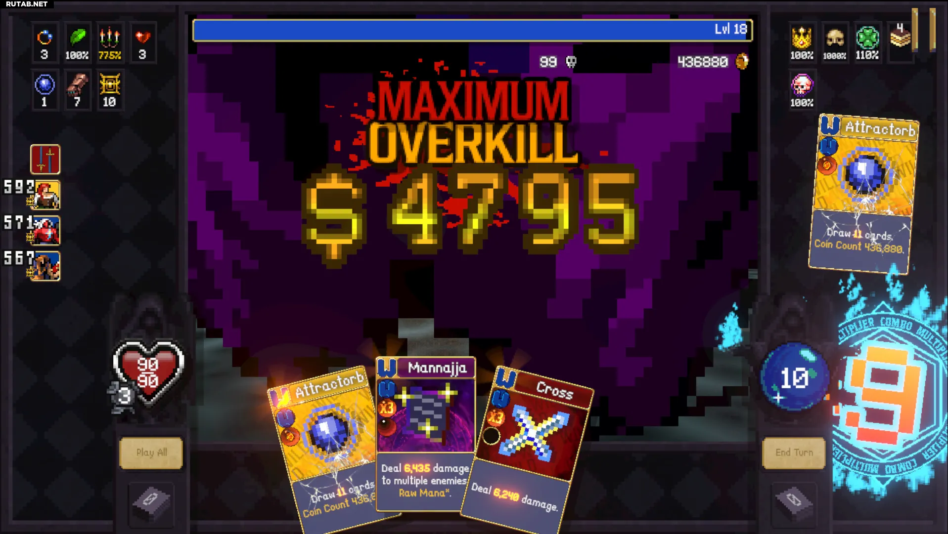 Сначала «Манная», затем 2 «Сырые» карты, «Крест» (если вы ещё не в оверкилле, сыграйте «Аттракторб» и повторите), а затем «Аттракторб» со «Счётом монет» для мгновенного «Ультра Максимального Оверкилла». Если к этому моменту не все ваши карты дикие, «Сырые» карты помогут поддержать комбо. Вы делаете только один ход, убивая мобов и мгновенно получая «Ультра Максимальный Оверкилл» с помощью одного из ваших «Аттракторбов».