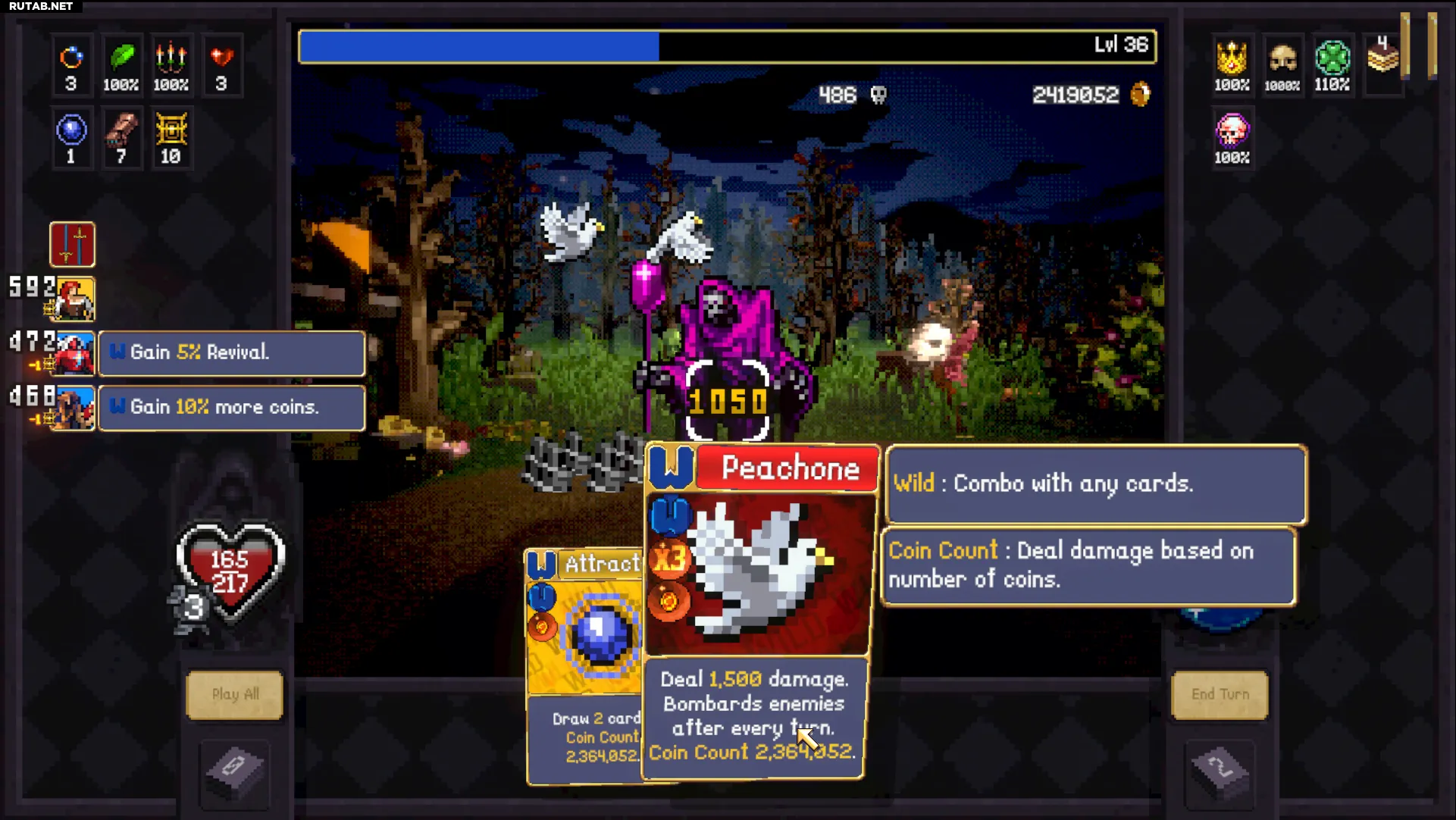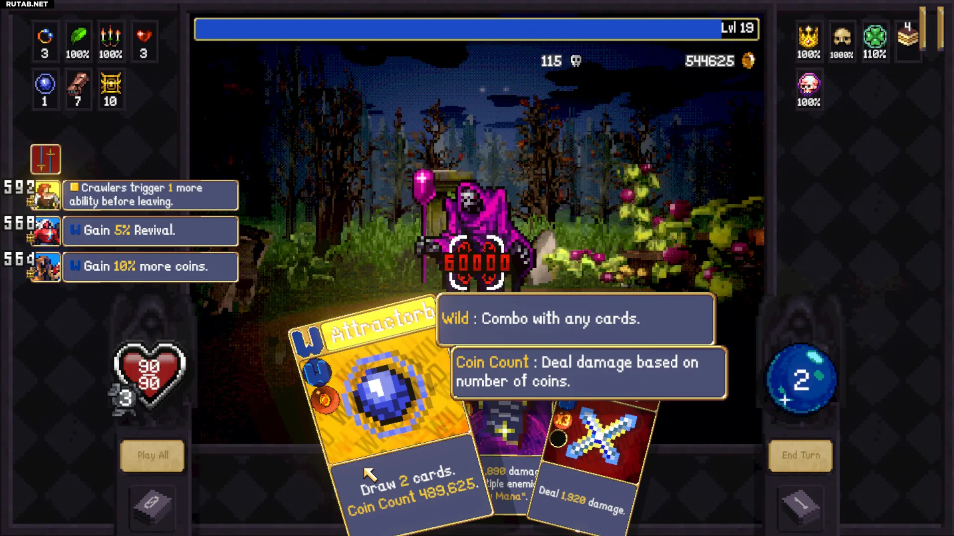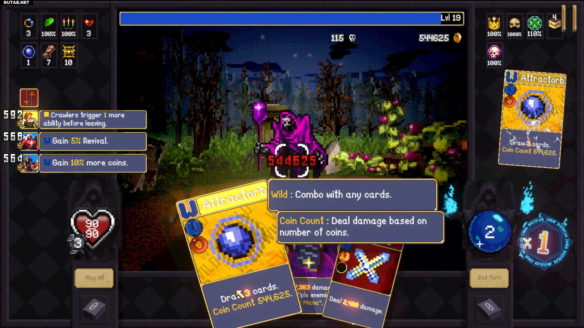 Сначала «Манная», затем 2 «Сырые» карты, «Крест» (если вы ещё не в оверкилле, сыграйте «Аттракторб» и повторите), а затем «Аттракторб» со «Счётом монет» для мгновенного «Ультра Максимального Оверкилла». Если к этому моменту не все ваши карты дикие, «Сырые» карты помогут поддержать комбо. Вы делаете только один ход, убивая мобов и мгновенно получая «Ультра Максимальный Оверкилл» с помощью одного из ваших «Аттракторбов».