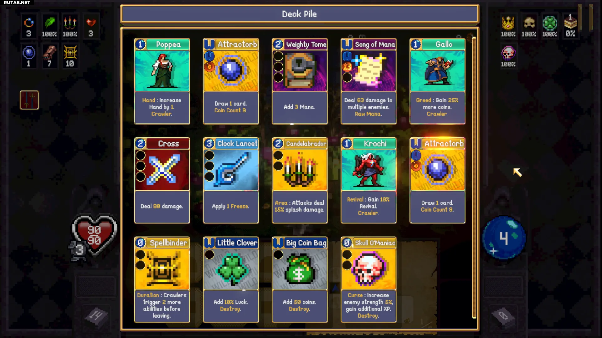 Теперь вы должны начать прореживать колоду. Это можно сделать, разрушая карты! После оверкилла мобов чередуйте два ваших «Аттракторба» и карту, которую хотите уничтожить. Лучшая часть: теперь вы можете также фармить смерть для оверкиллов. Вы можете уничтожить «Заклинателя заклинаний», «Тяжёлый фолиант», «Ланцет» и «Свечу». Они вам больше не нужны.