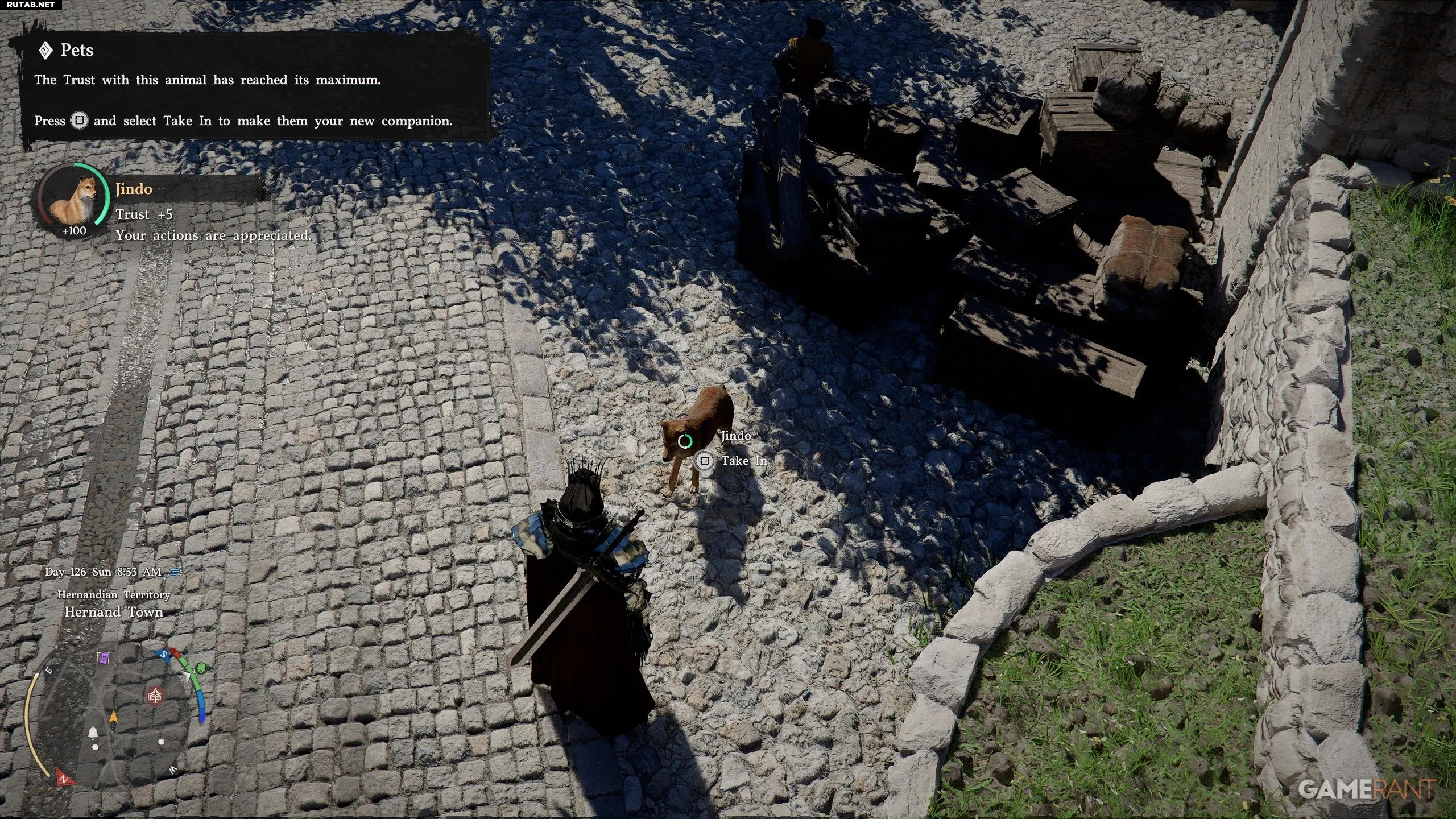 - Когда доверие достигнет +100, нажмите квадрат/X, чтобы «Забрать» собаку и принять её в качестве питомца.