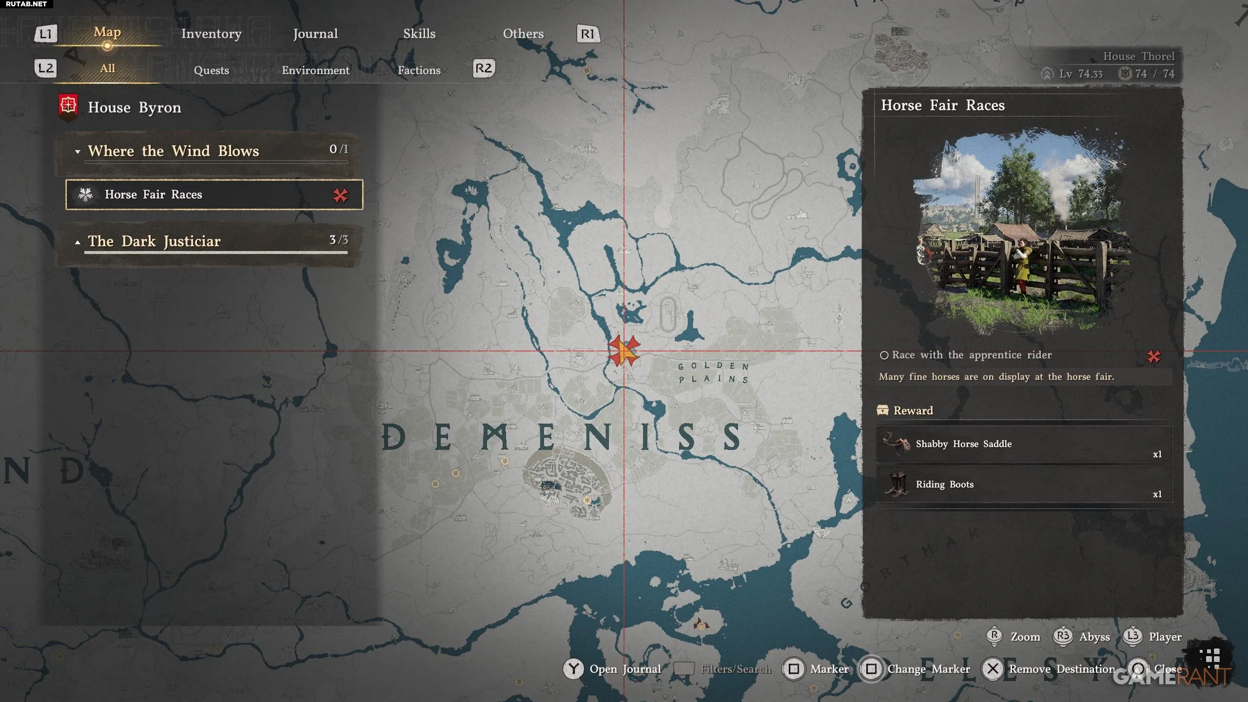 - Задание можно начать, поговорив с наездником-учеником на Конской ярмарке Деменисса (к северу от буквы «н» в названии города на карте).