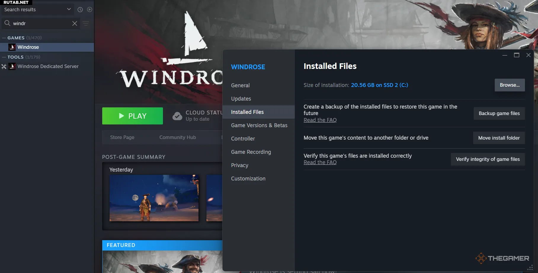 После загрузки мода вам нужно найти папку с игрой Windrose. Самый простой способ — нажать правой кнопкой мыши на ярлык Windrose в Steam, выбрать «Свойства», затем «Установленные файлы», а потом «Просмотреть». Это приведёт вас прямо к файлам игры.