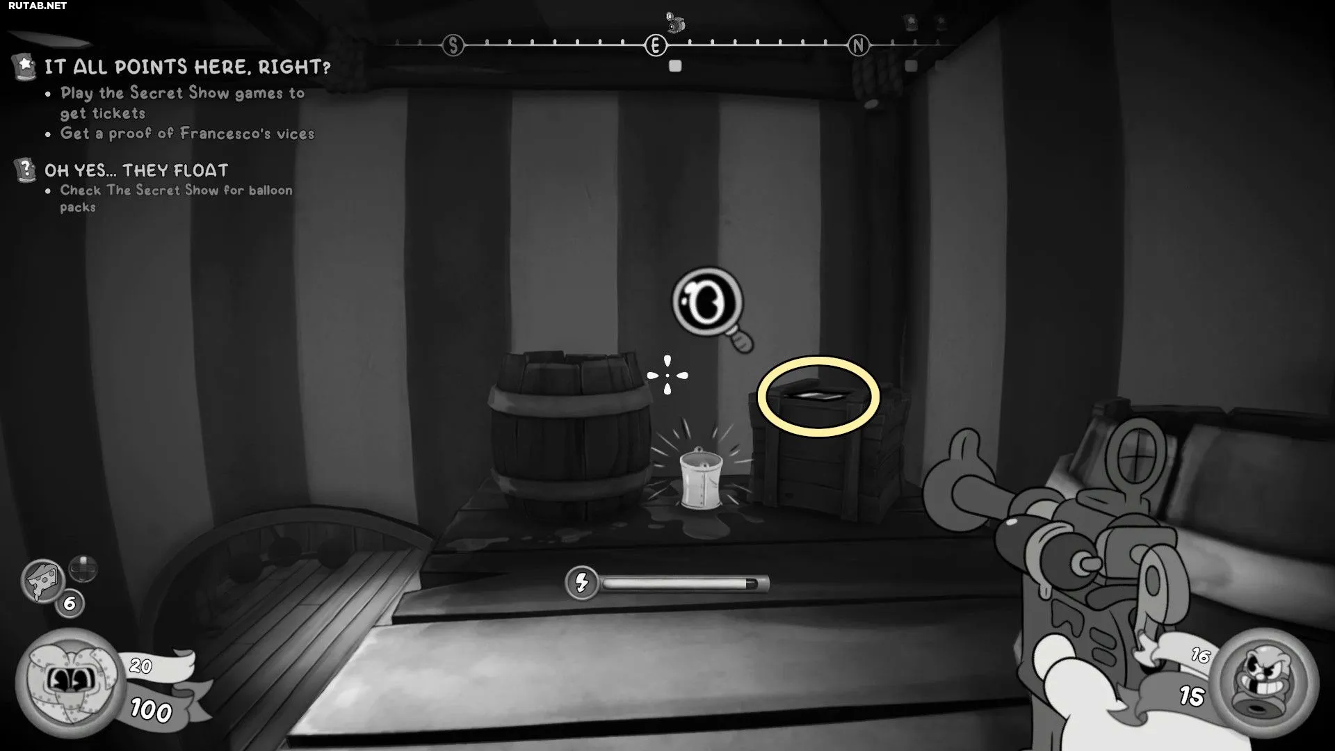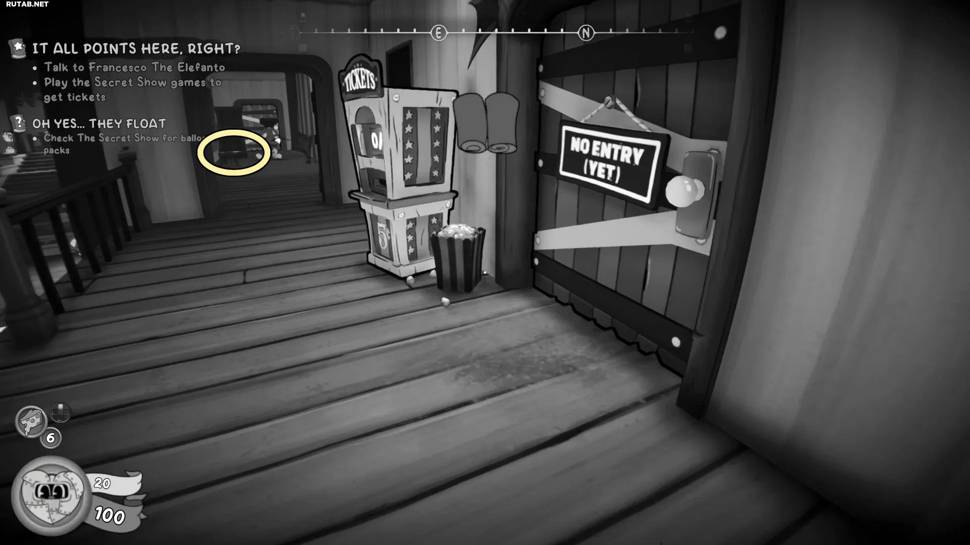 Пройдите через дверь рядом с уборщиком цирка и используйте «Прыжок по стенам», чтобы добраться до Франческо Элефанто. Поговорите с NPC, а затем с помощью «Прыжка по стенам» заберитесь на платформу над ним. Сфотографируйте ведро и возьмите Газету с ящика. Затем снова поговорите с Франческо и подберите Билет перед ним.
