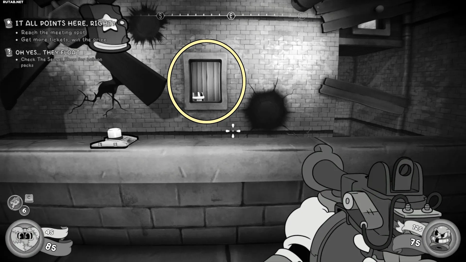 Подойдите к кнопке, активирующей мини-игру «T.N.T. Watch It Explode», и запрыгните в неподвижное окно через пропасть, чтобы найти Бейсбольную карточку. Затем вернитесь к кнопке и завершите мини-игру, бросая тротил в окно за пропеллером, неподвижное окно и движущееся окно, чтобы получить билет.
