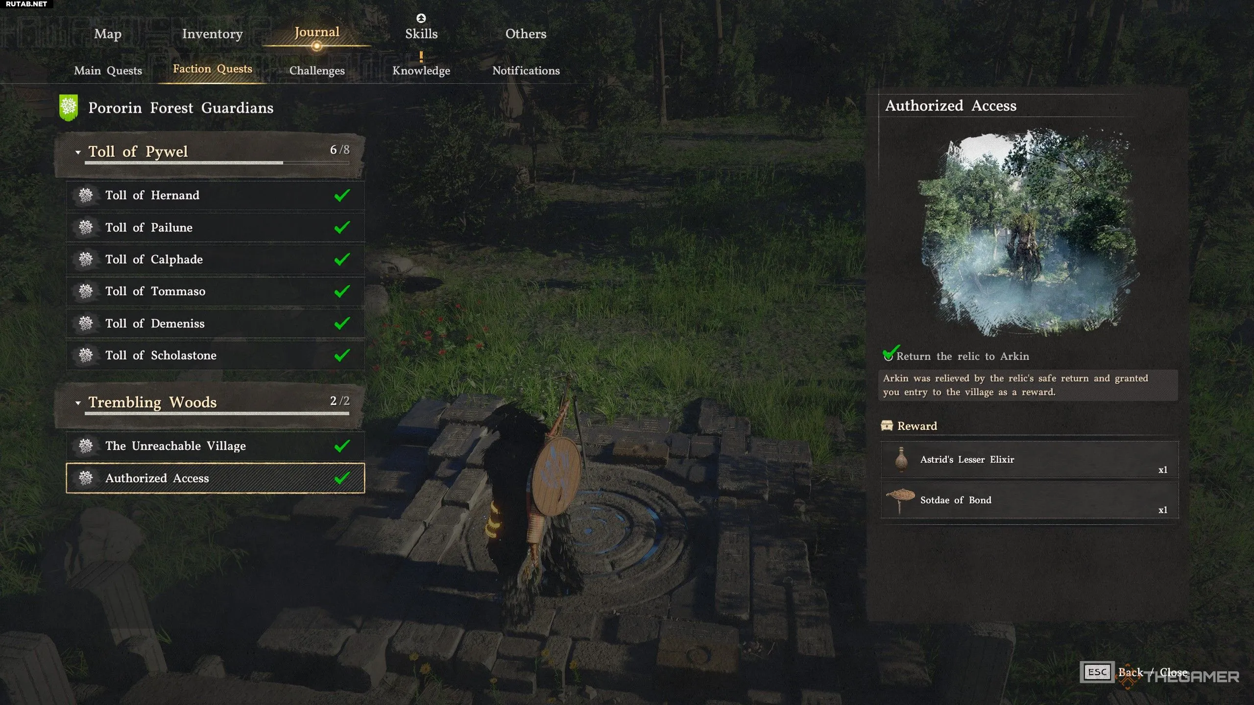 Отправляйтесь к указанному маркеру квеста и ждите у обрыва, где стоит Аркин, пока не увидите большое разумное дерево. Заберитесь на его вершину, чтобы обнаружить реликвию, застрявшую между ветвей. Подберите ее и передайте реликвию Аркину, чтобы завершить квест и получить Тотемный столб единения.
