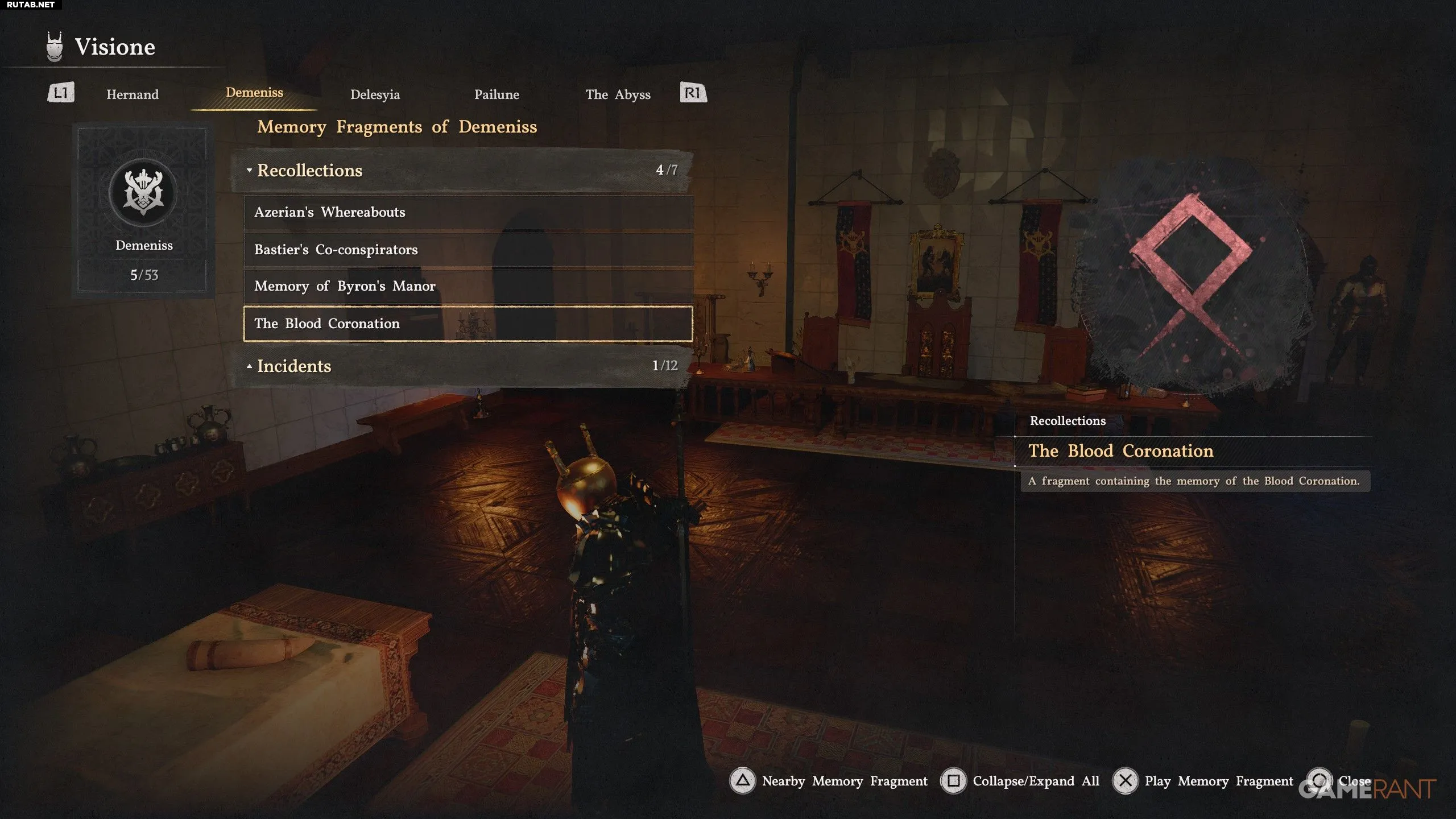 - Откроется меню «Воспоминания Визионе», где нужно выбрать «Деменисс», а затем в разделе «Воспоминания» — «Кровавая коронация».