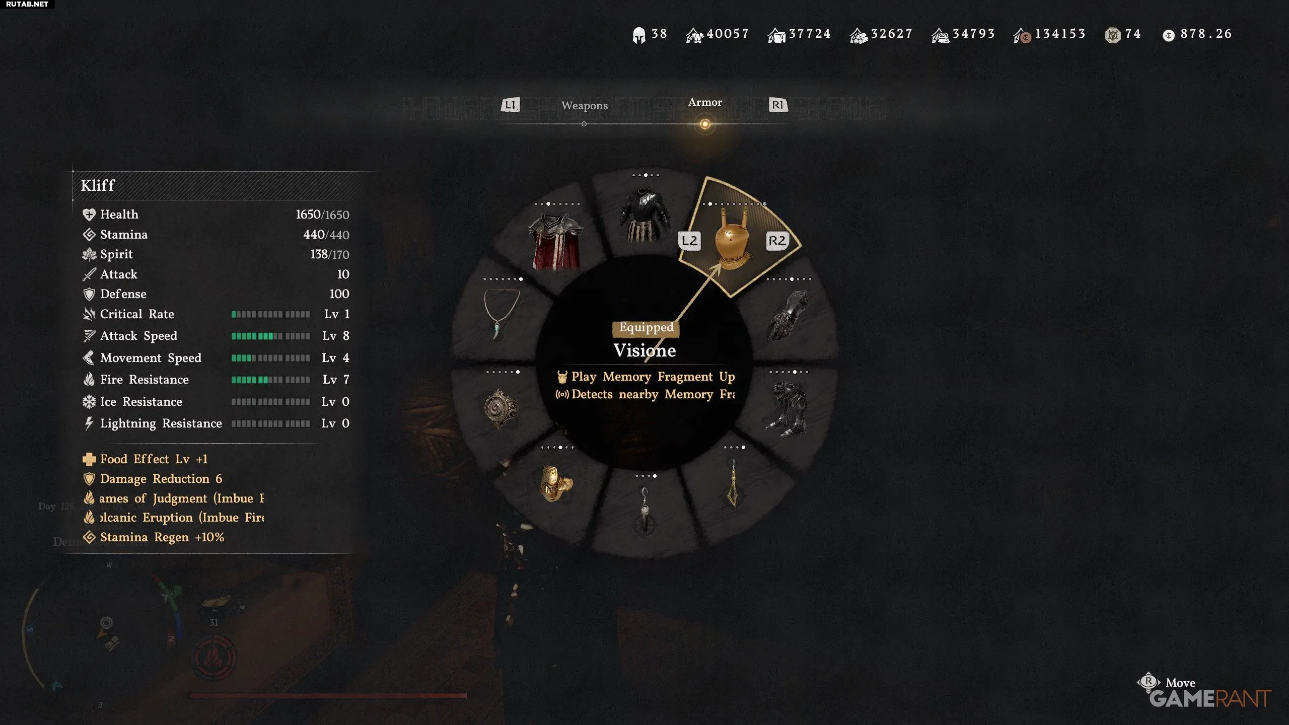 - Если вы уже видели воспоминание, его можно воспроизвести через колесо оружия (левая крестовина). Нажмите R1/RB, чтобы перейти к разделу «Броня». Экипируйте Визионе и выделите его правым стиком.