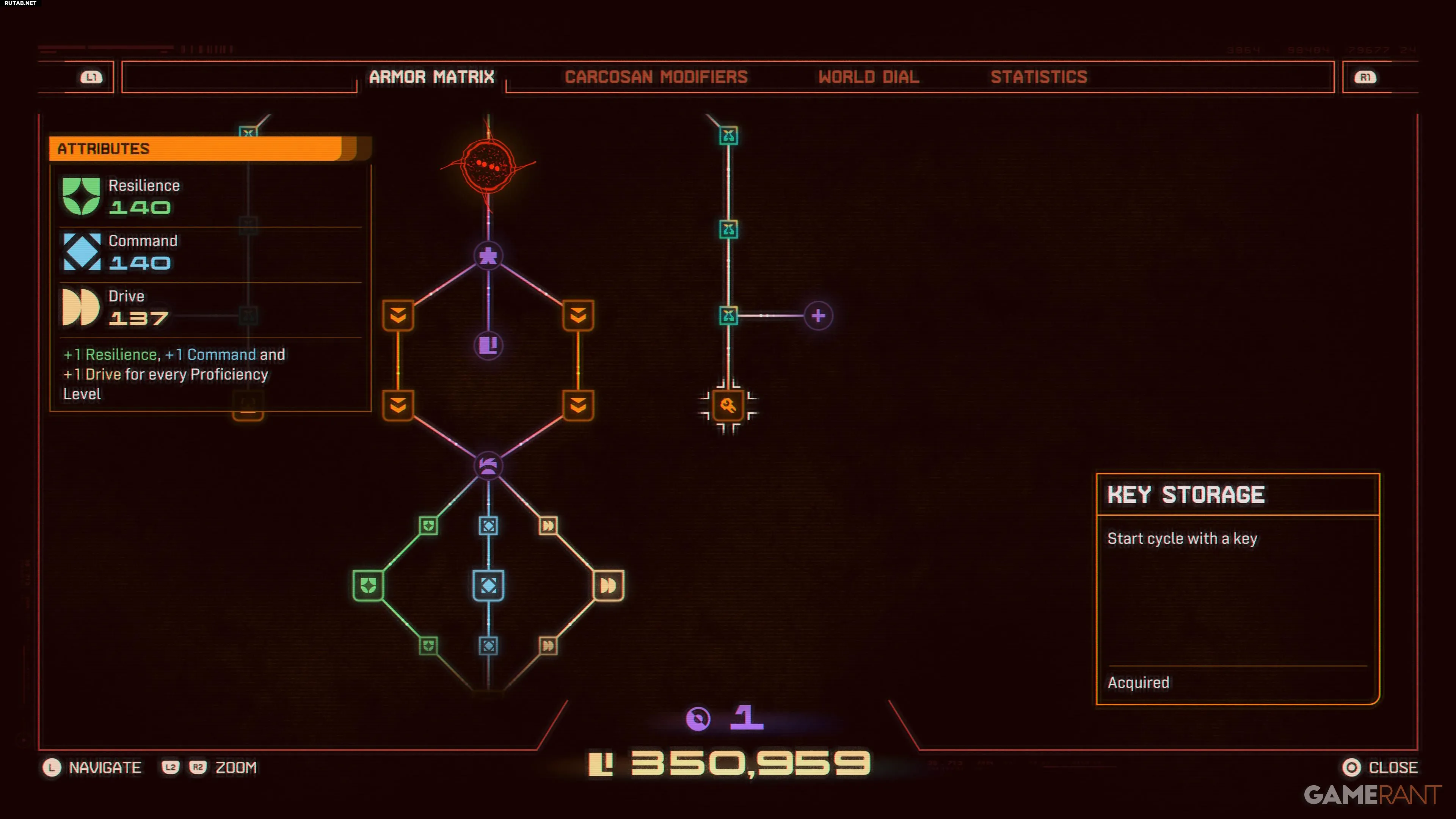 Всего в Броневой матрице пять таких узлов. Разблокировав их все, вы будете начинать каждый забег с пятью ключами. Наконец, еще один способ открывать запертые контейнеры становится доступен после достижения последнего биома. Там вы получите способность ломать желтые барьеры и желтые контейнеры, экономя ключи.