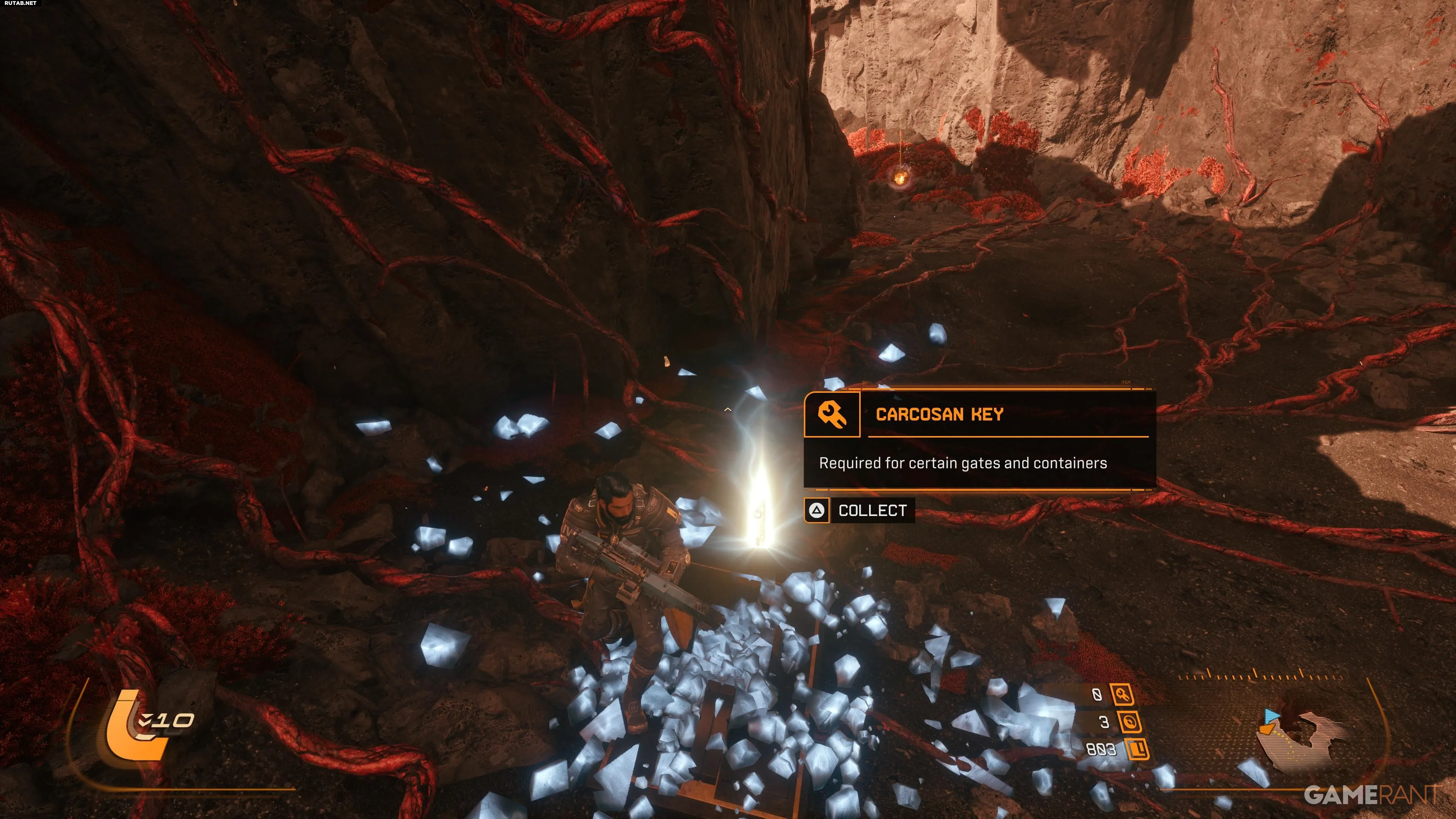 Наткнувшись на запертый контейнер без ключа Каркозы, лучше двигаться дальше и исследовать биом. Ключи можно найти в обычных белых контейнерах, но они выпадают довольно редко. В большинстве биомов нельзя вернуться назад или телепортироваться в конкретную точку, как в Returnal. Если вы пропустили желтый контейнер, скорее всего, вы не сможете к нему вернуться. Не зацикливайтесь на этом и продолжайте искать следующий.