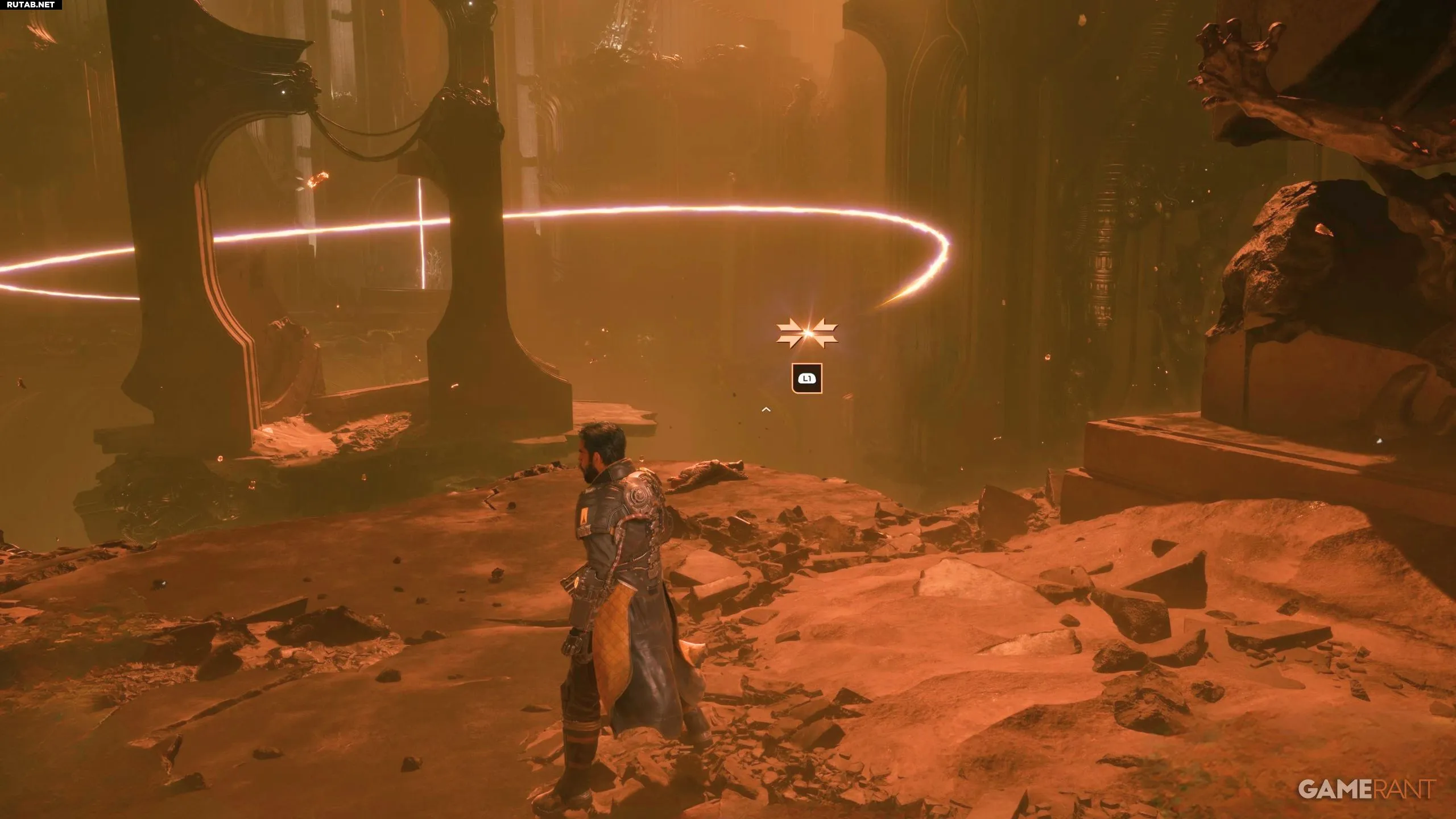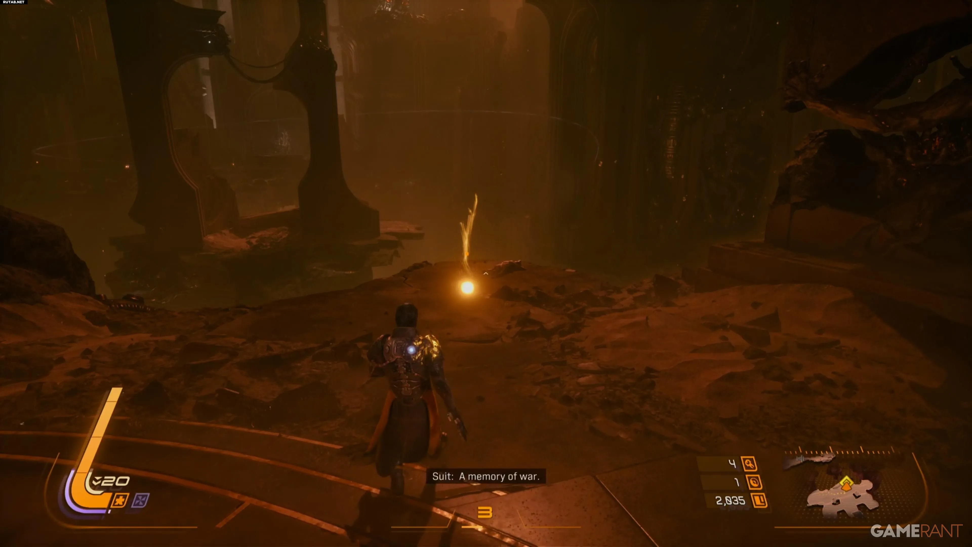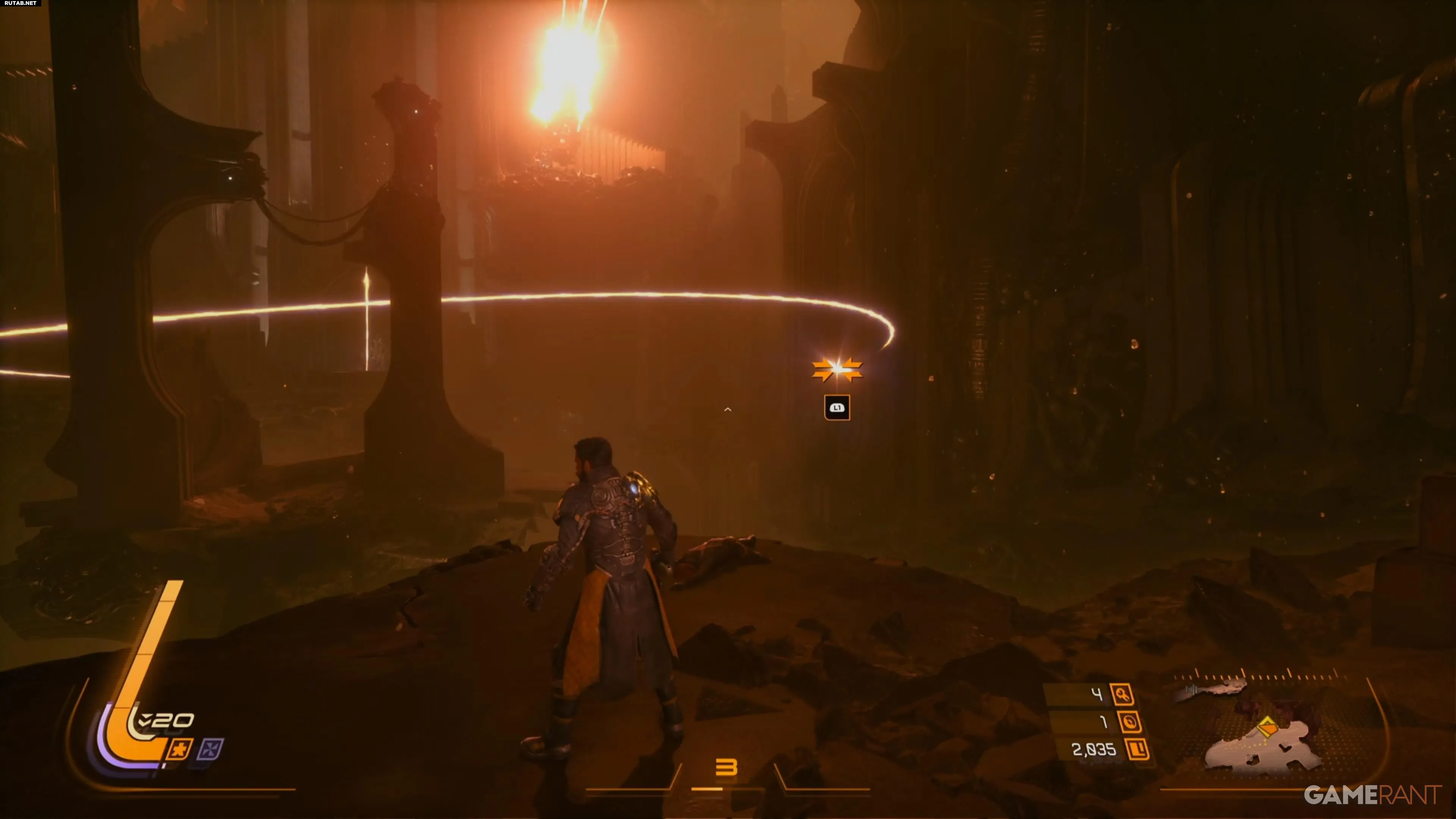 Дальше пути нет, поэтому единственный вариант — активировать устройство. После этого впереди появится небольшой жёлтый ключевой предмет. Пока Арджун разговаривает со своим костюмом, подберите блестящий объект с земли — это откроет способность «Эклипс-нити». Она позволит перемещаться по большим комнатам, просто нажимая кнопку L1, которая используется для рывка.