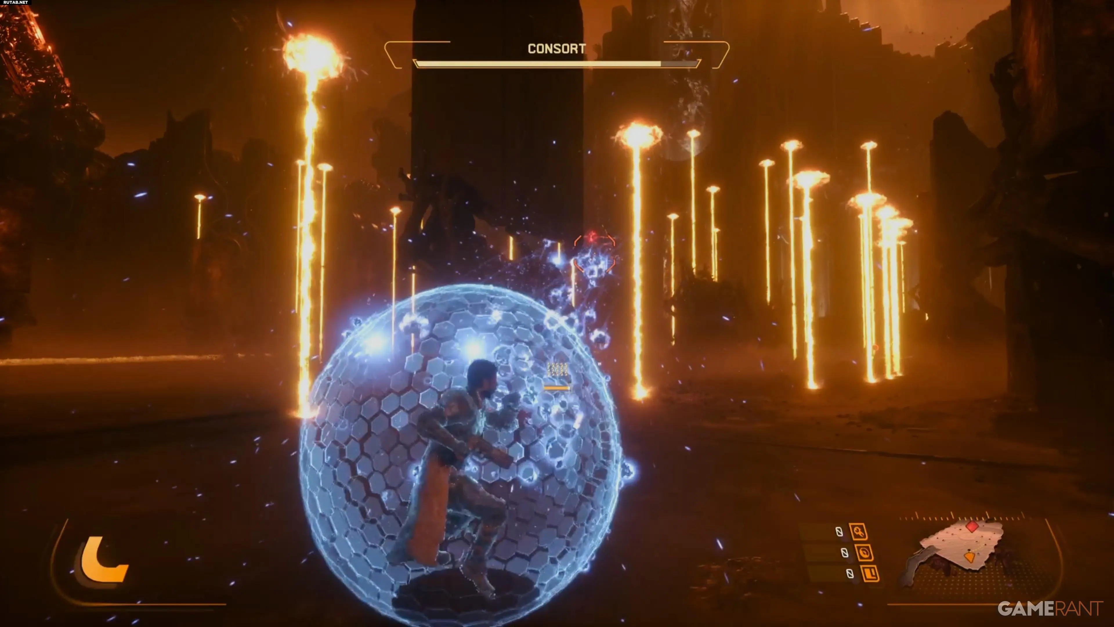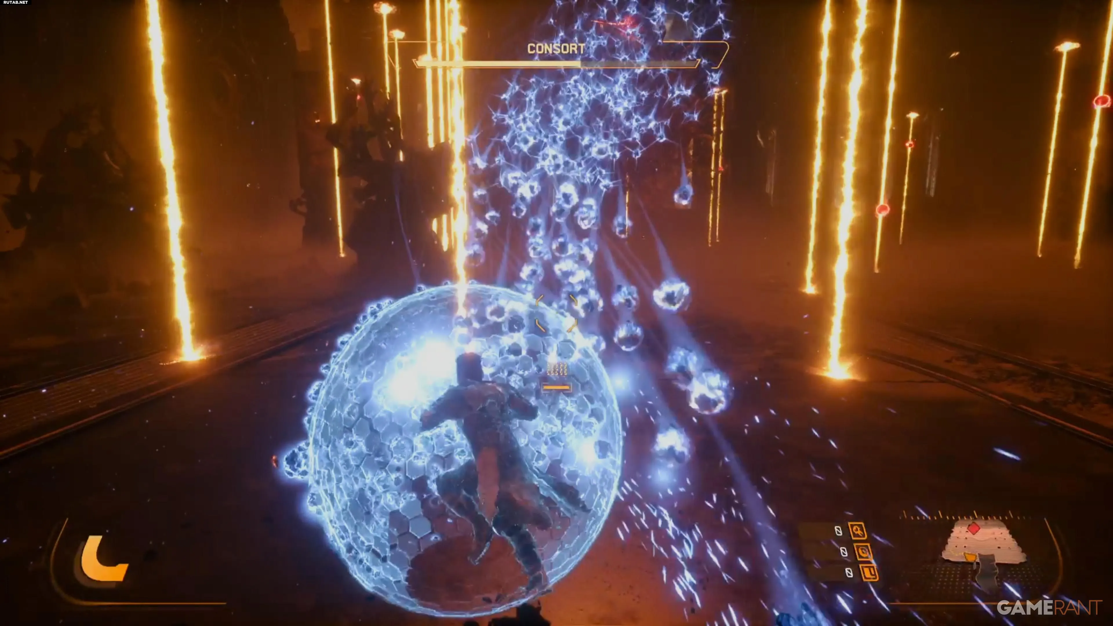 Есть еще несколько вариаций желтых атак. Одна из них — когда босс создает расширяющиеся кольца на земле, которые нужно перепрыгивать. Другая — три неподвижные сферы, стреляющие вертикальными лучами вверх. Лучшая стратегия для этого боя — сражаться вокруг многочисленных колонн, расположенных в разных точках арены. Они защитят вас от красных и желтых снарядов, давая укрытие, чтобы вы могли выглядывать и стрелять по боссу.