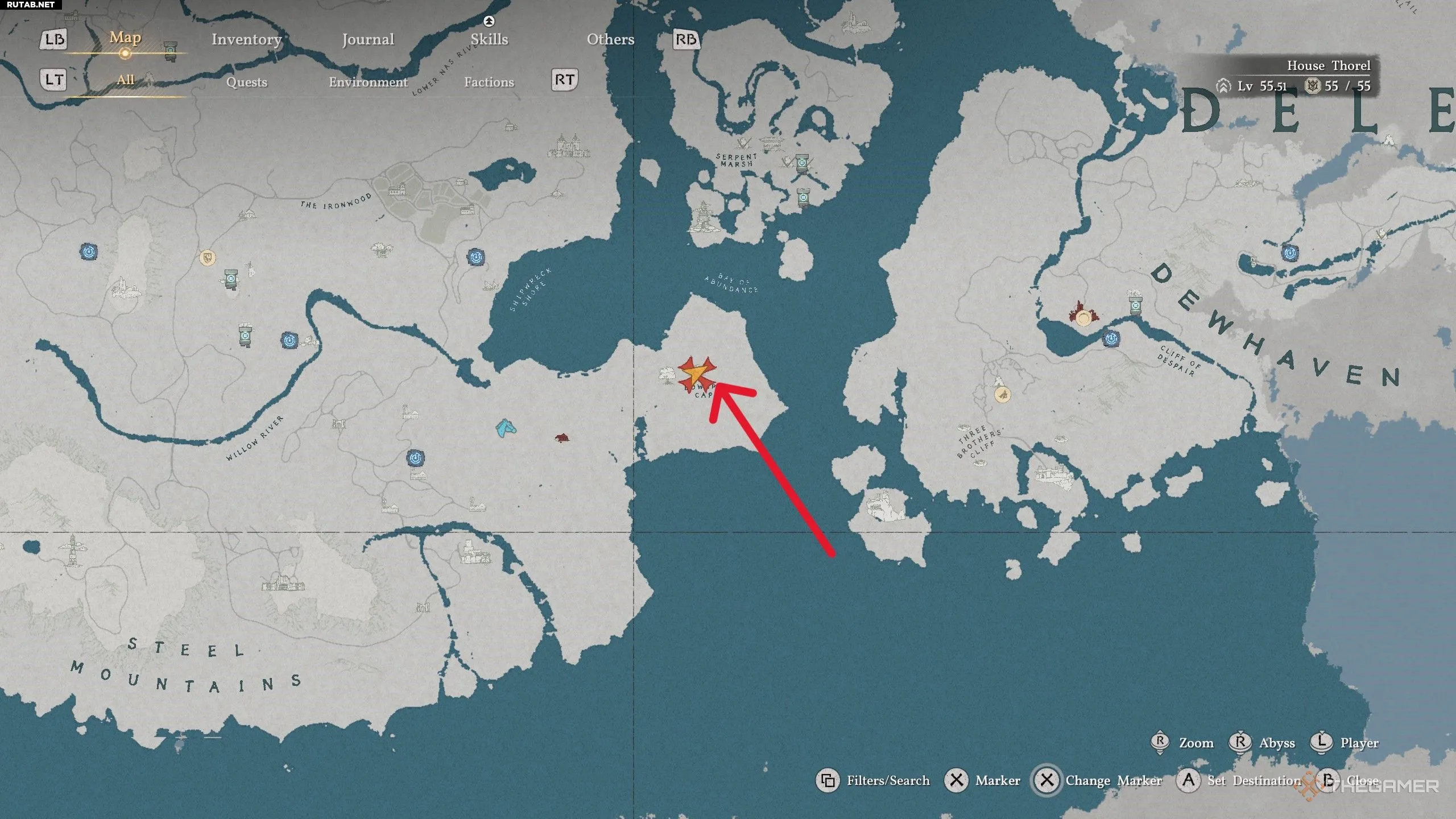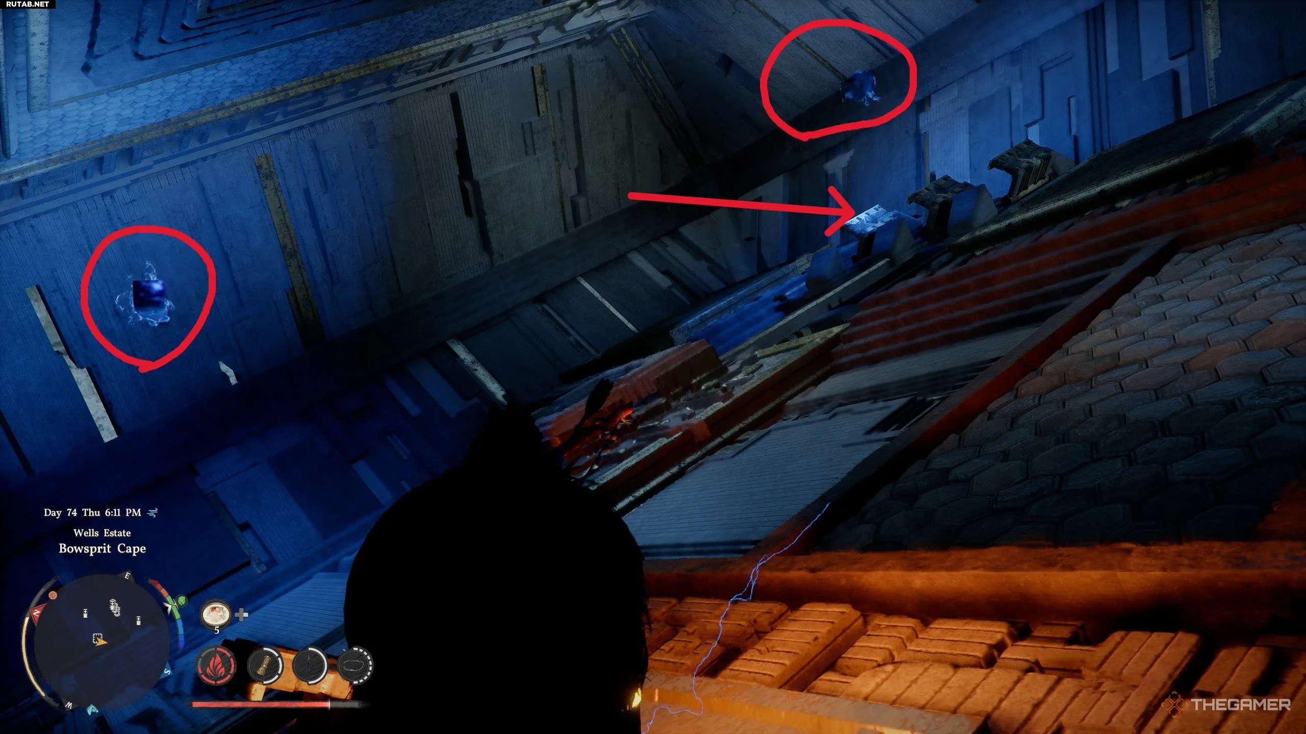 Однако вместо перемещения на другой остров вы попадёте прямо на мыс Бушприт. В качестве альтернативы можно отправиться к югу от Деменисса — мыс находится на полуострове у залива Изобилия. Ищите большой сломанный лифт, лежащий на земле под углом.