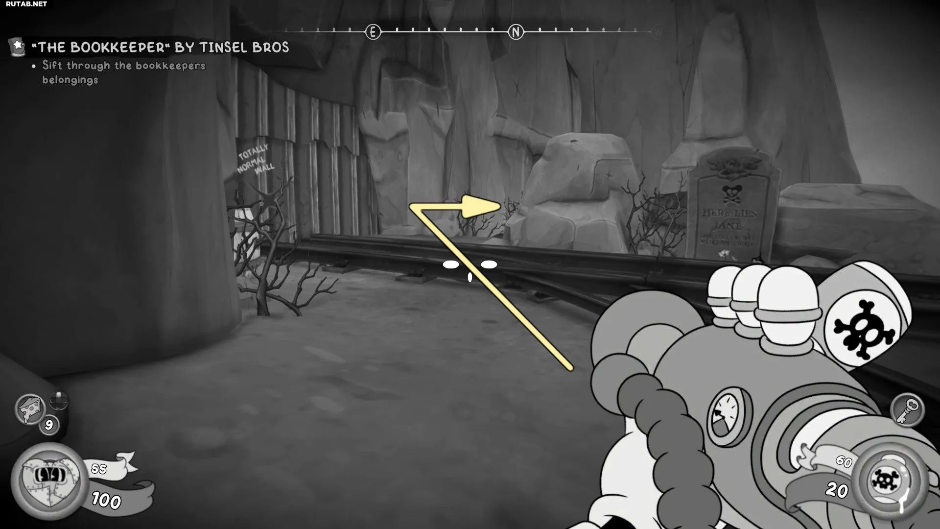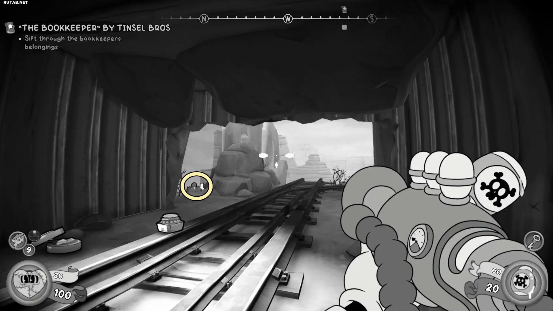 Спуститесь туда, где скрылся Счетовод, но сначала поверните налево и следуйте по рельсам. Вы наткнётесь на надгробие, а за ним будет лежать Бейсбольная карточка. Заберите её, а затем подберите улику, которую обронил Счетовод.