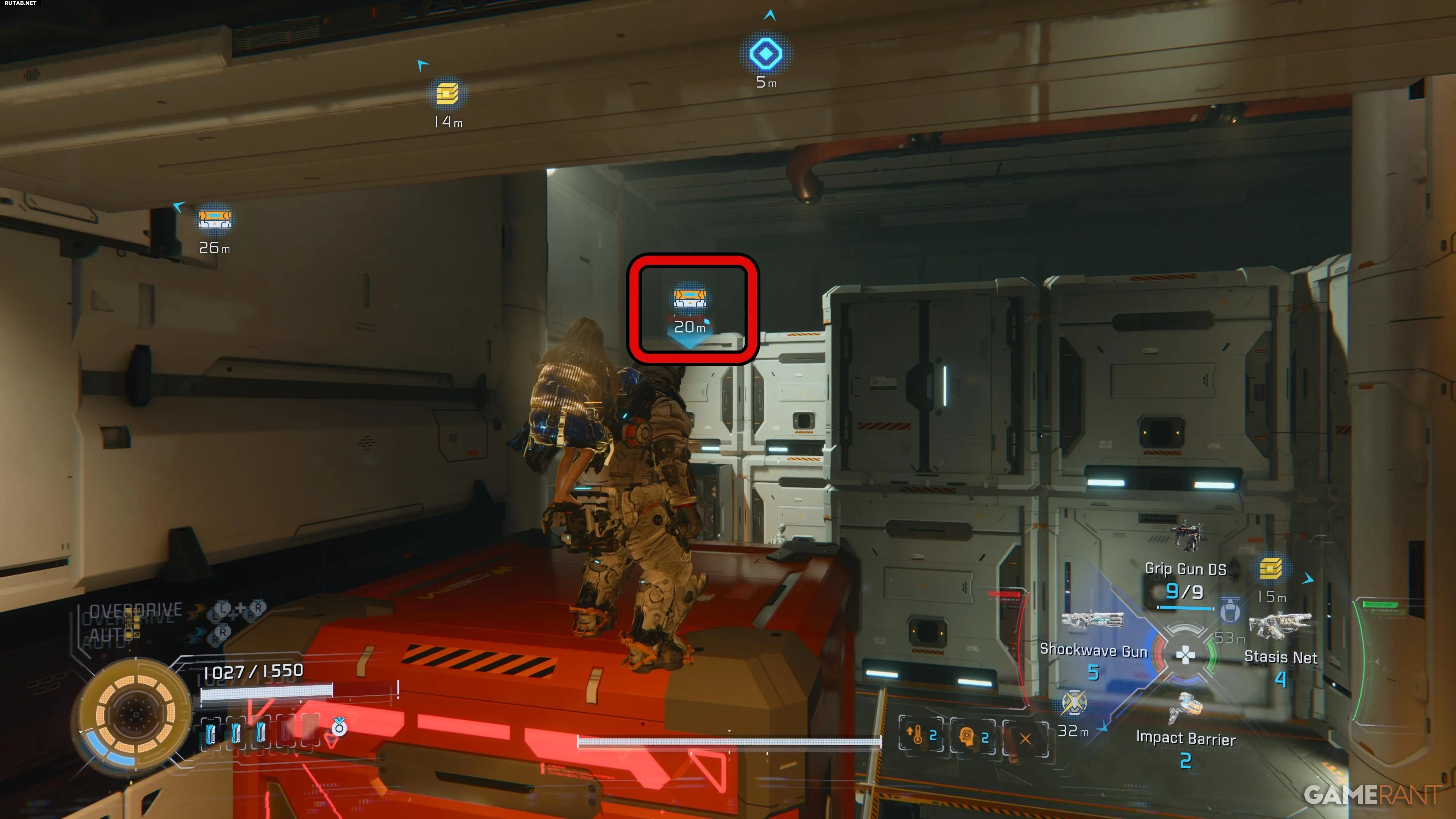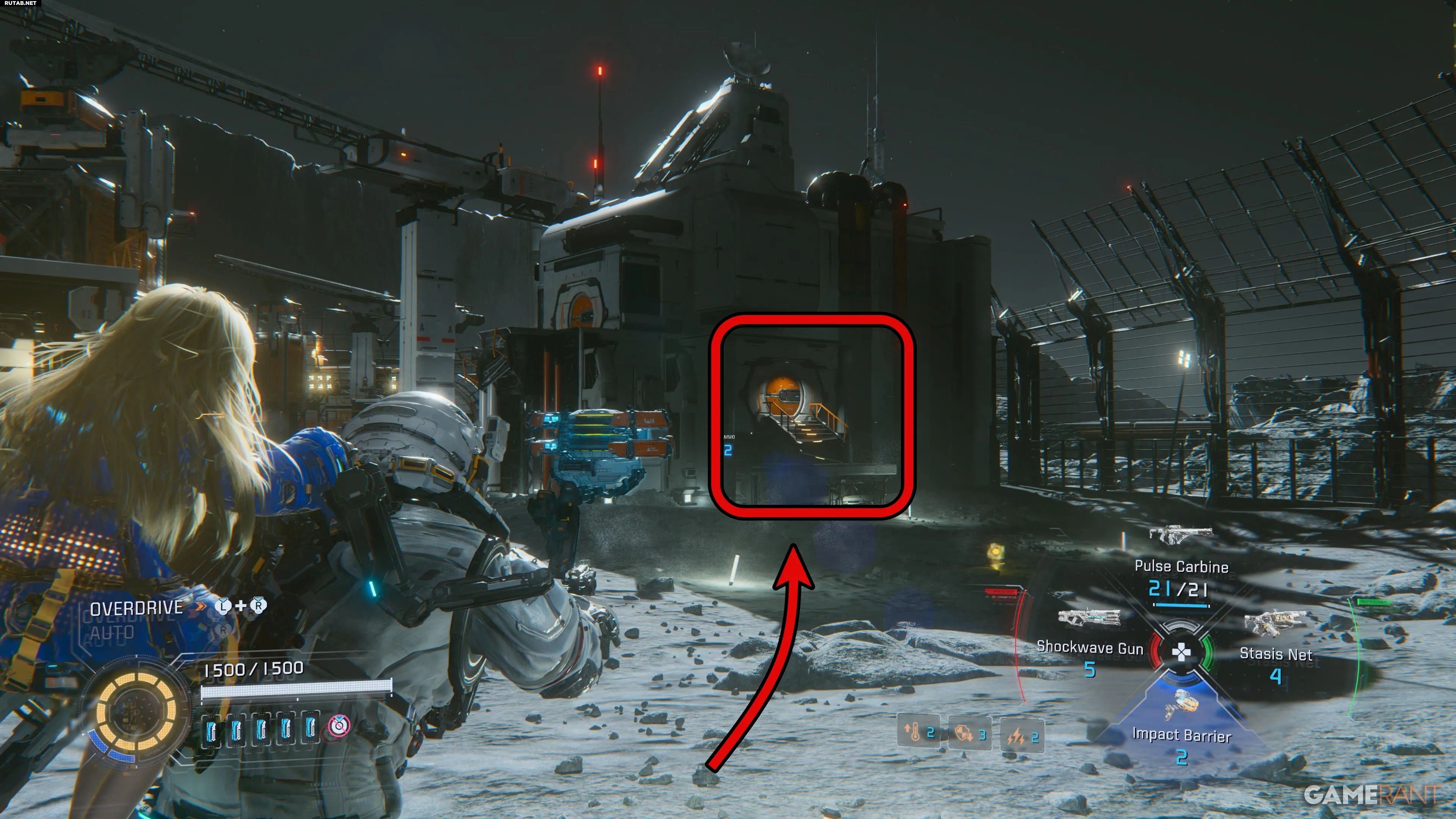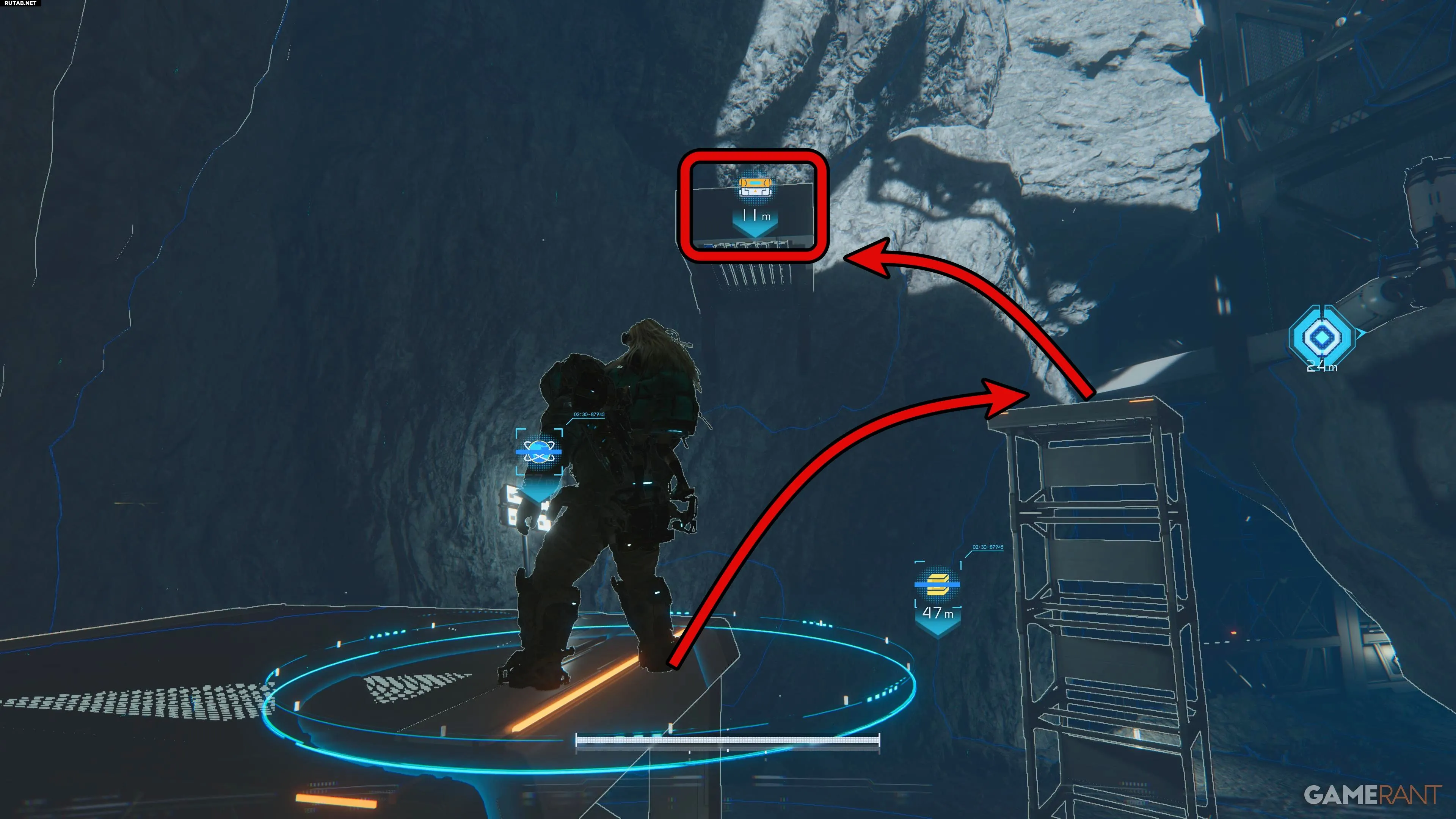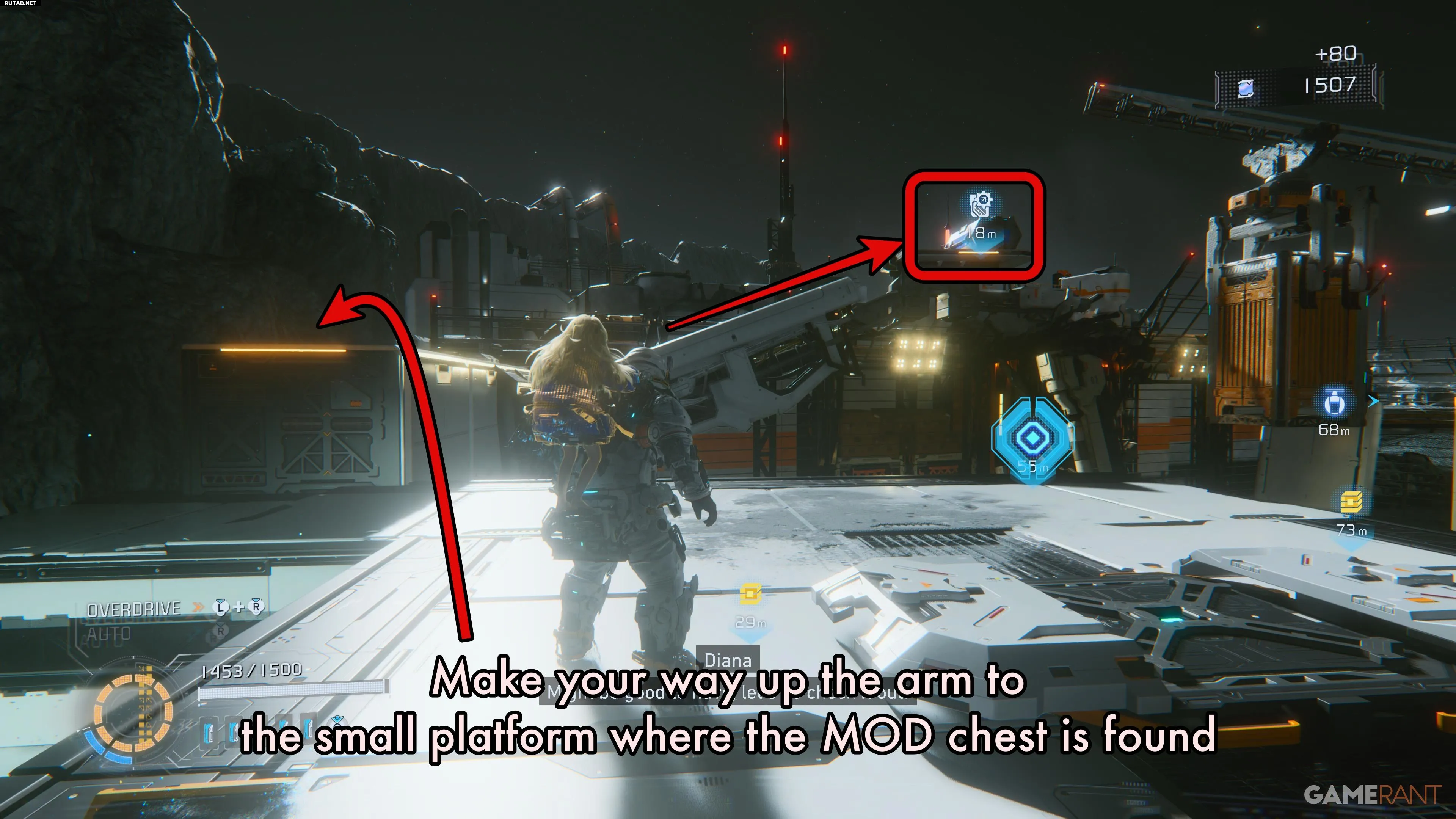 Спустившись с первого уступа, с которого открывается вид на шахты, вы сядете на лифт до уровня земли. Диана скажет использовать ускоритель, чтобы перепрыгивать платформы, но если применить способность «Сканирование», вы заметите участок на земле, ведущий к сундуку с Модом.