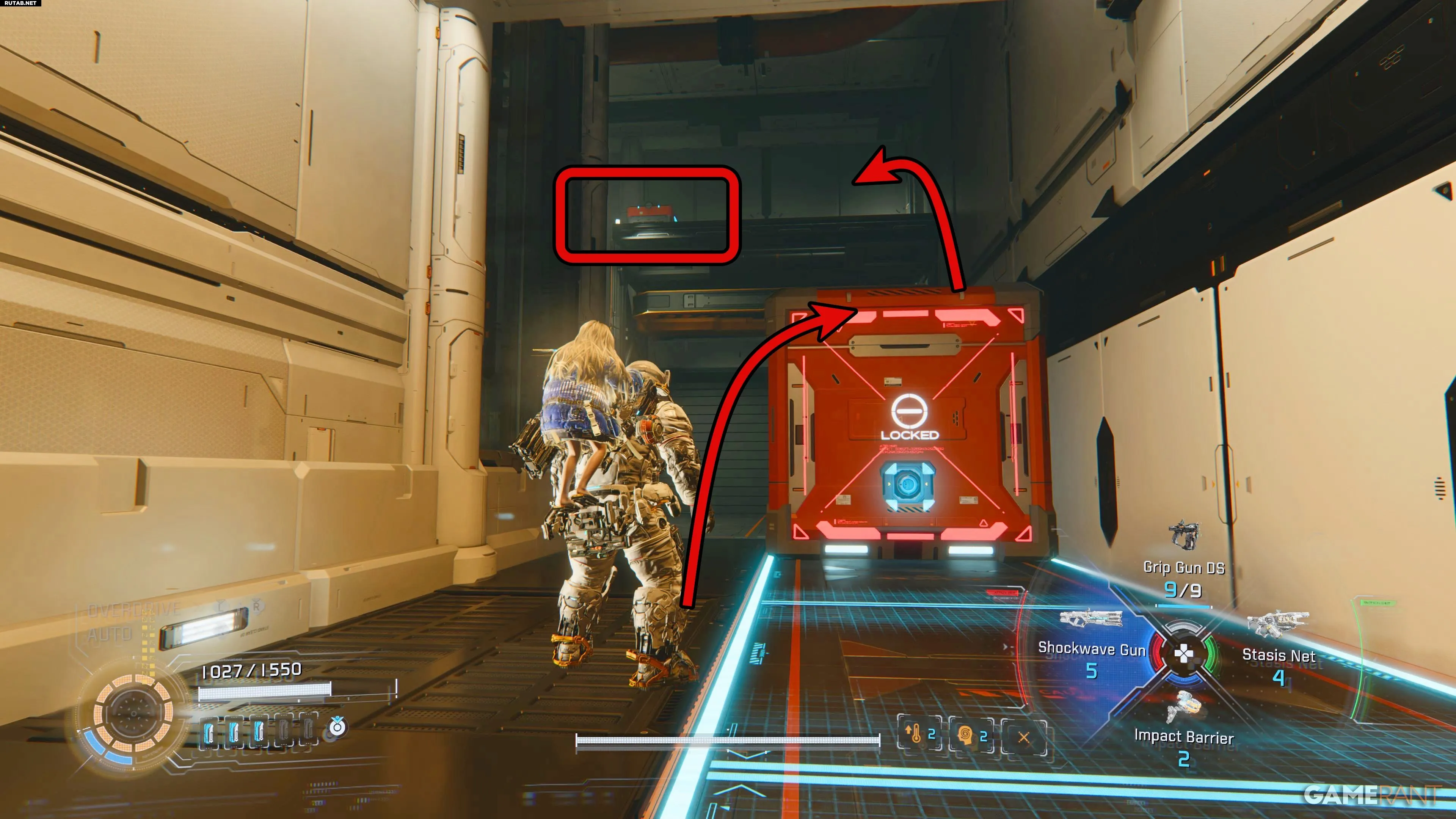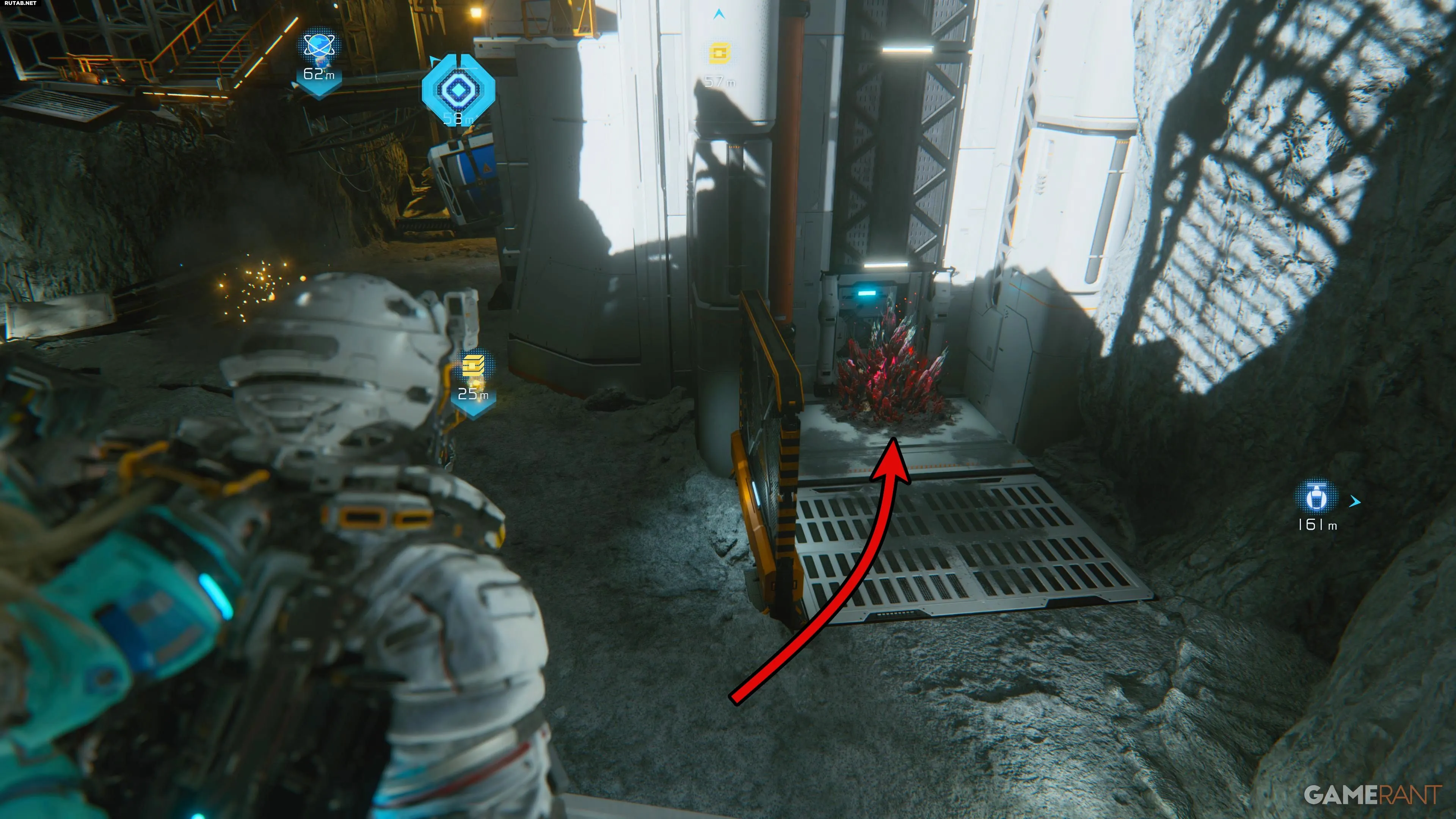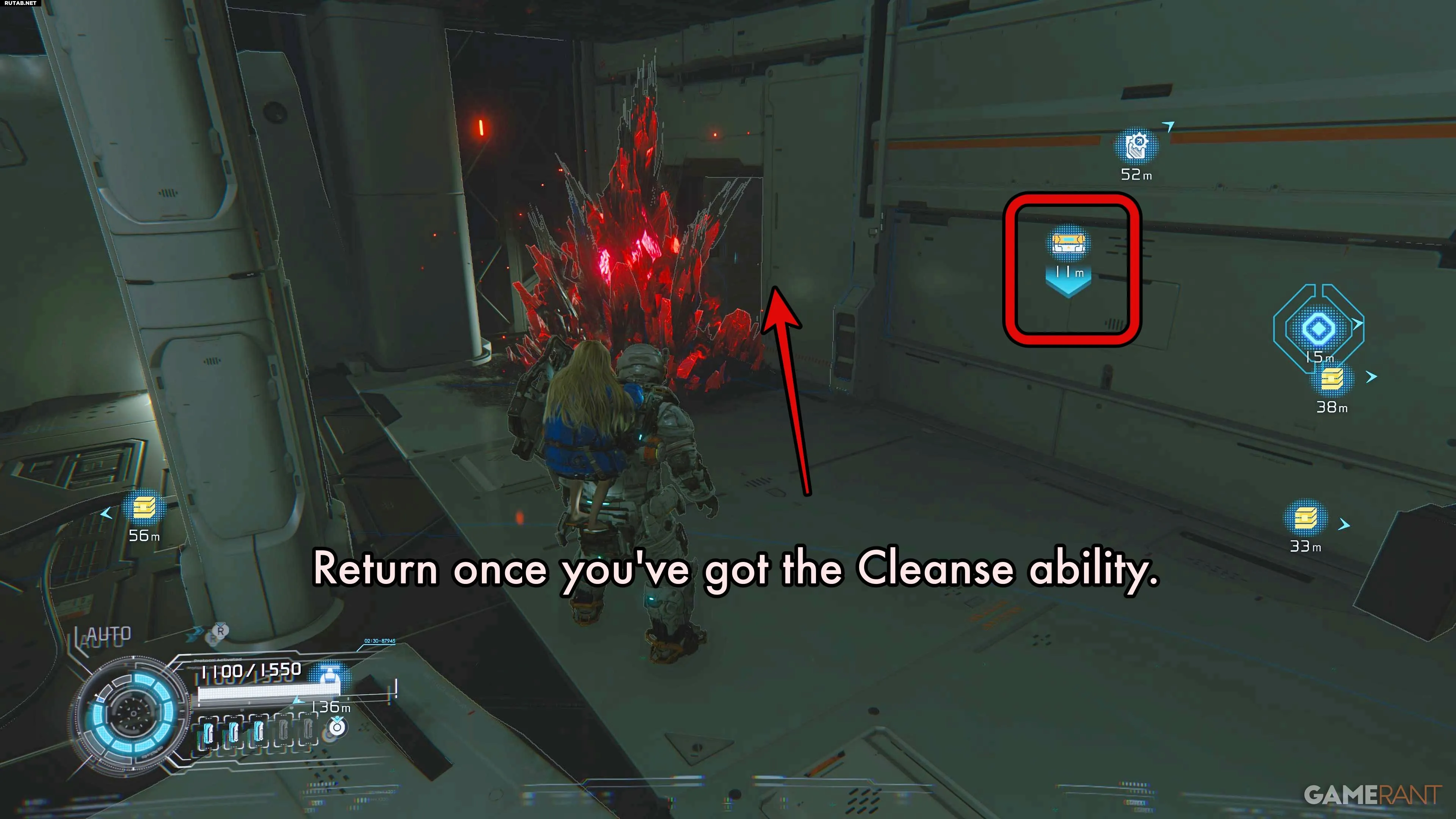 После столкновения с первым Ходоком, заражённым чёрной слизью, спуститесь по пандусу, прежде чем двигаться дальше. Вы заметите небольшую дверь, заблокированную красной массой Мёртвых Нитей. Чтобы её убрать, сначала нужно получить способность «Очищение» на следующем уровне, а затем вернуться.