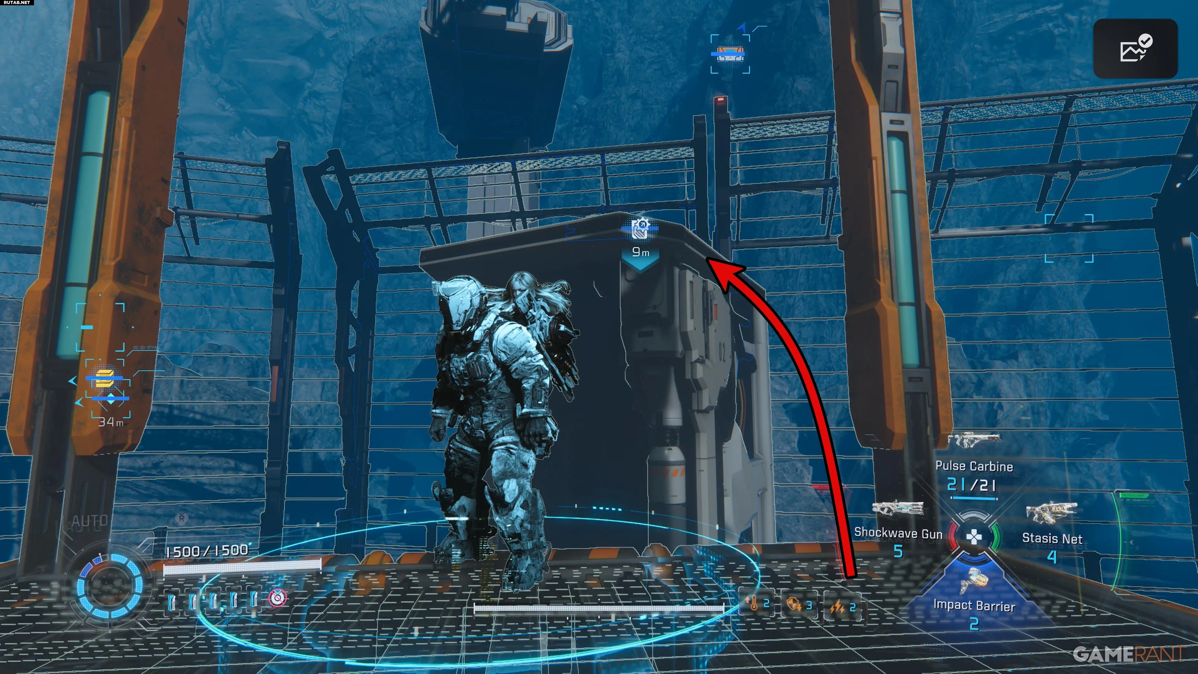 Выйдя из второй комнаты Шлюза на Главном раскопе, вы окажетесь на улице в большой открытой зоне. Прежде чем спрыгнуть на уровень земли, сверните налево к короткой лестнице у края платформы и взломайте красный узел. Это опустит большой контейнер, создав платформу для прыжка.