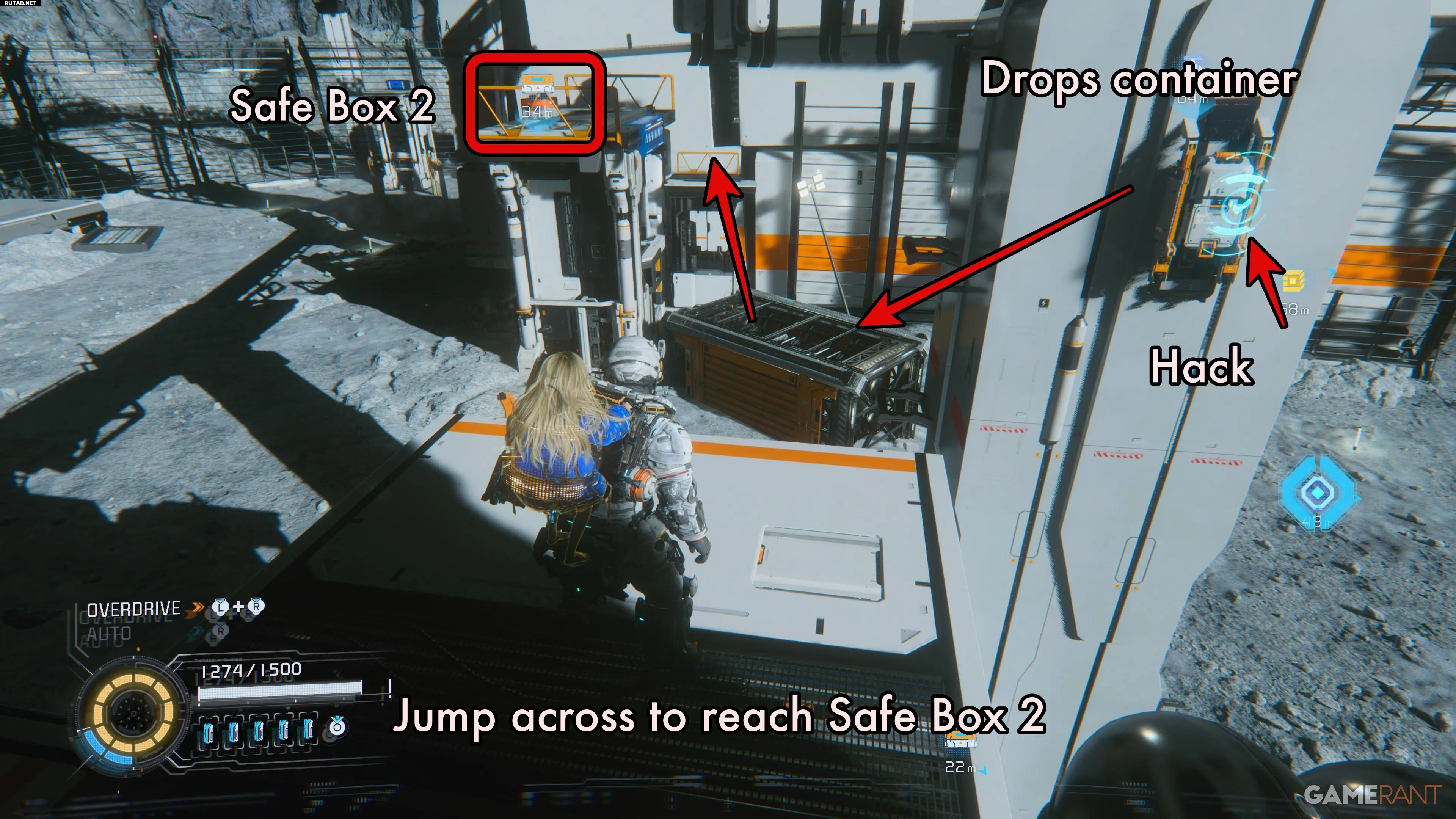 Собрав Мини-кабину, используйте узел взлома, чтобы опустить контейнер снаружи выхода на втором этаже здания с Сейфом 1. Перепрыгните на только что опущенный контейнер — так вы доберётесь до платформы, где находится Сейф 2.
