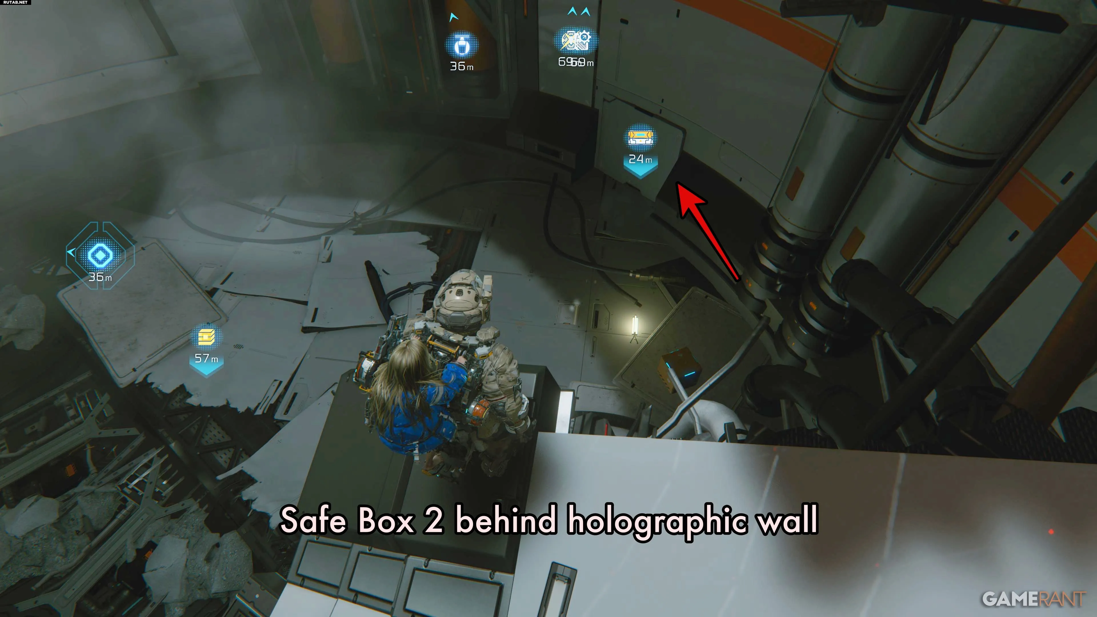 Стоя на контейнере, на который вы спрыгнули, чтобы забрать второй Сейф, обернитесь назад к зданию, где вы нашли Сейф 1 и Мини-кабину. Вам нужно пересечь уровень земли, чтобы добраться до голографической стены с левой стороны здания.