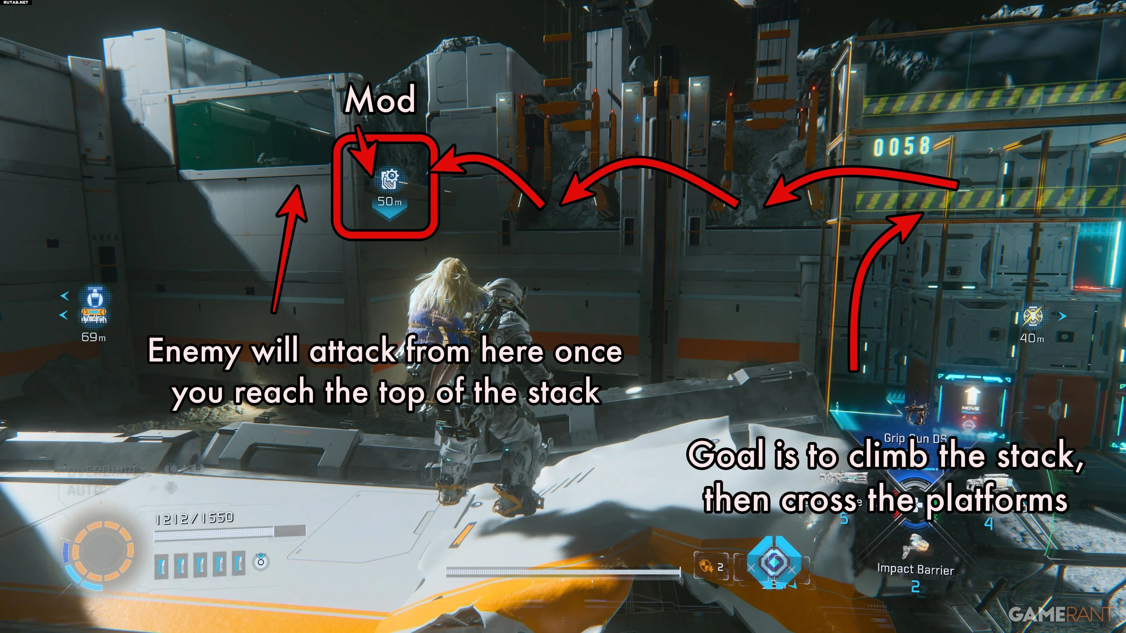 С другой стороны открытой зоны вы увидите ещё одну стопку контейнеров с подвижными ящиками, как внутри. Если посмотреть на эту область со сломанной платформы в центре арены, станет виден путь к сундуку с Модом.