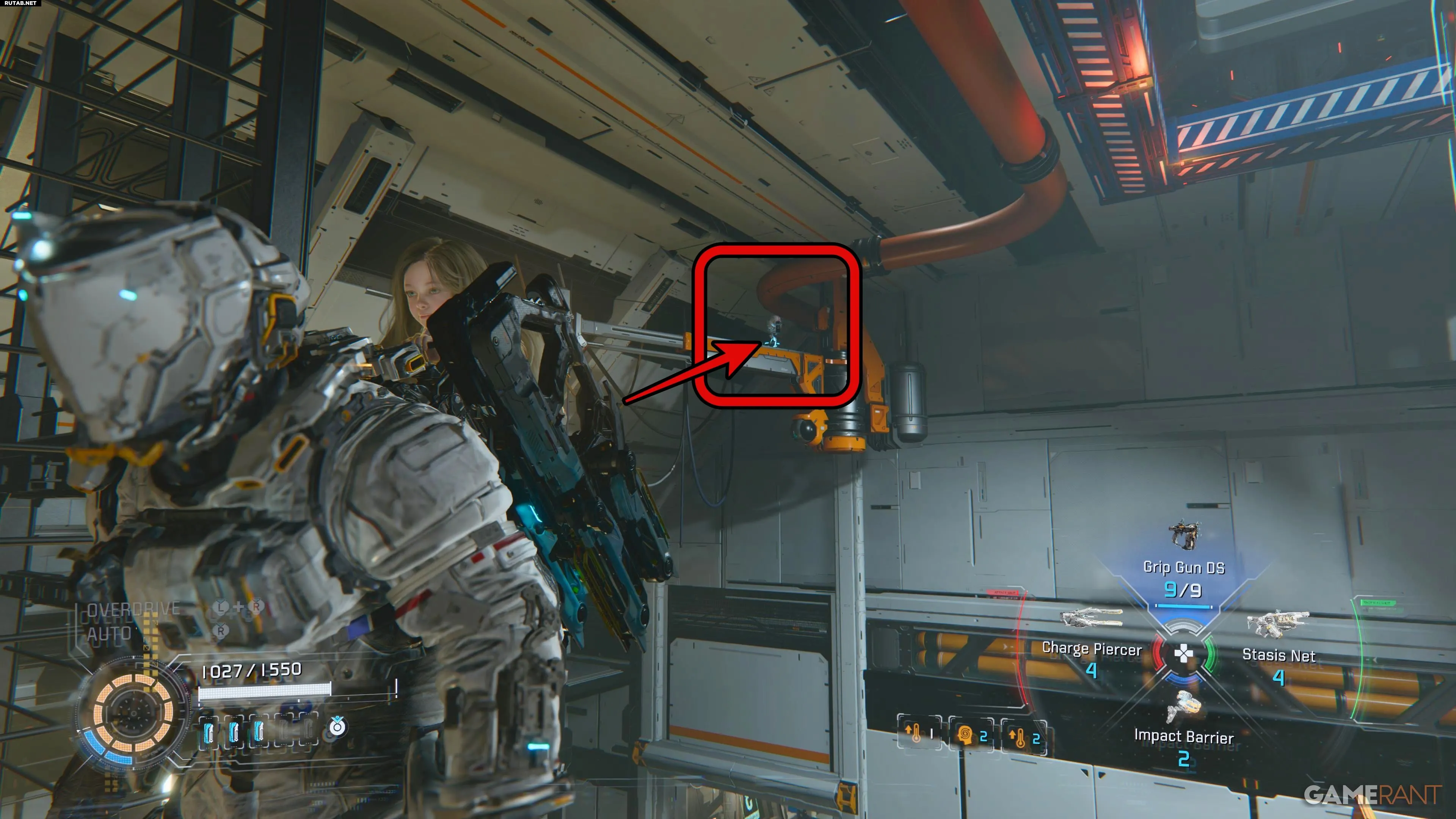 Отодвиньте первый ящик до упора, затем поверните направо и двигайте второй, пока он не зафиксируется. Зайдите в зону за вторым ящиком, затем посмотрите вверх и направо — вы увидите ящик, который нужно сдвинуть, чтобы добраться до РЭМ. Заберитесь наверх и через решётку, откуда видна передняя часть ящика, взломайте его. Это позволит вам спрыгнуть в камеру и собрать РЭМ «Сетка».