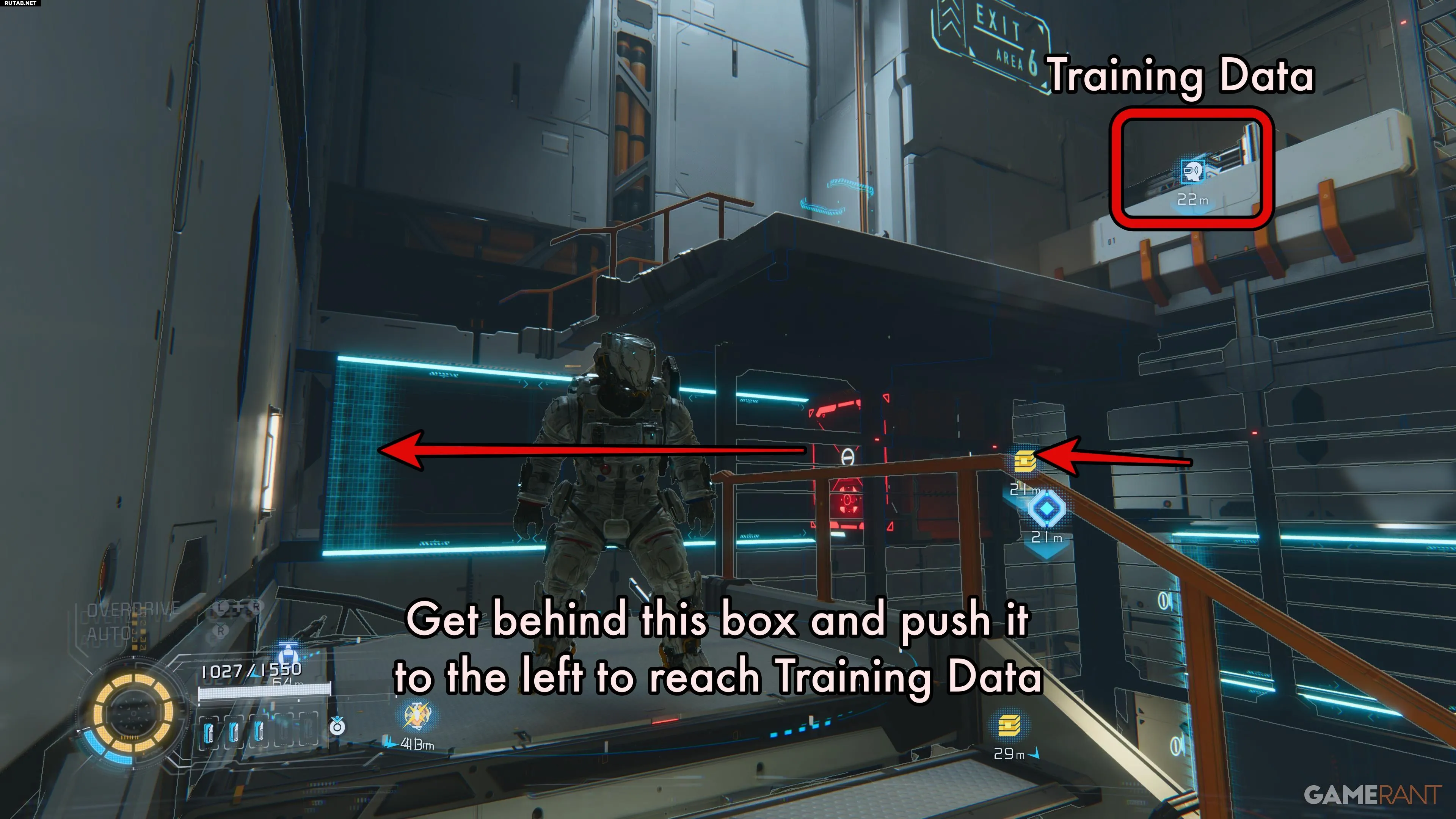 Учебные данные находятся в той же камере, что и Сейф 5. Обратите внимание на сломанную лестницу над выходом. Вам нужно переместить один красный ящик влево, чтобы использовать его как мост к платформе, ведущей к Учебным данным. Для этого прыгните с красного ящика внизу.