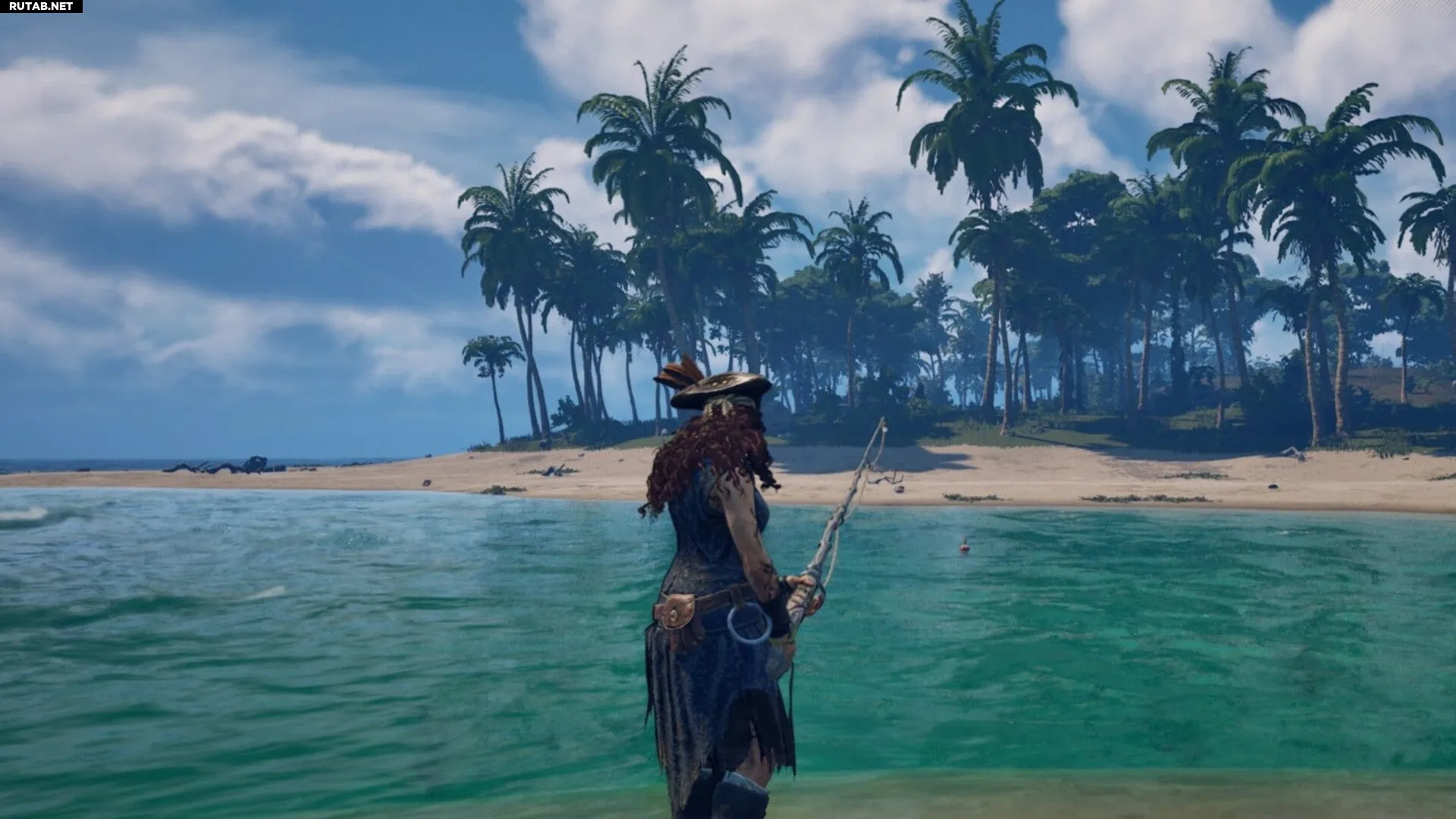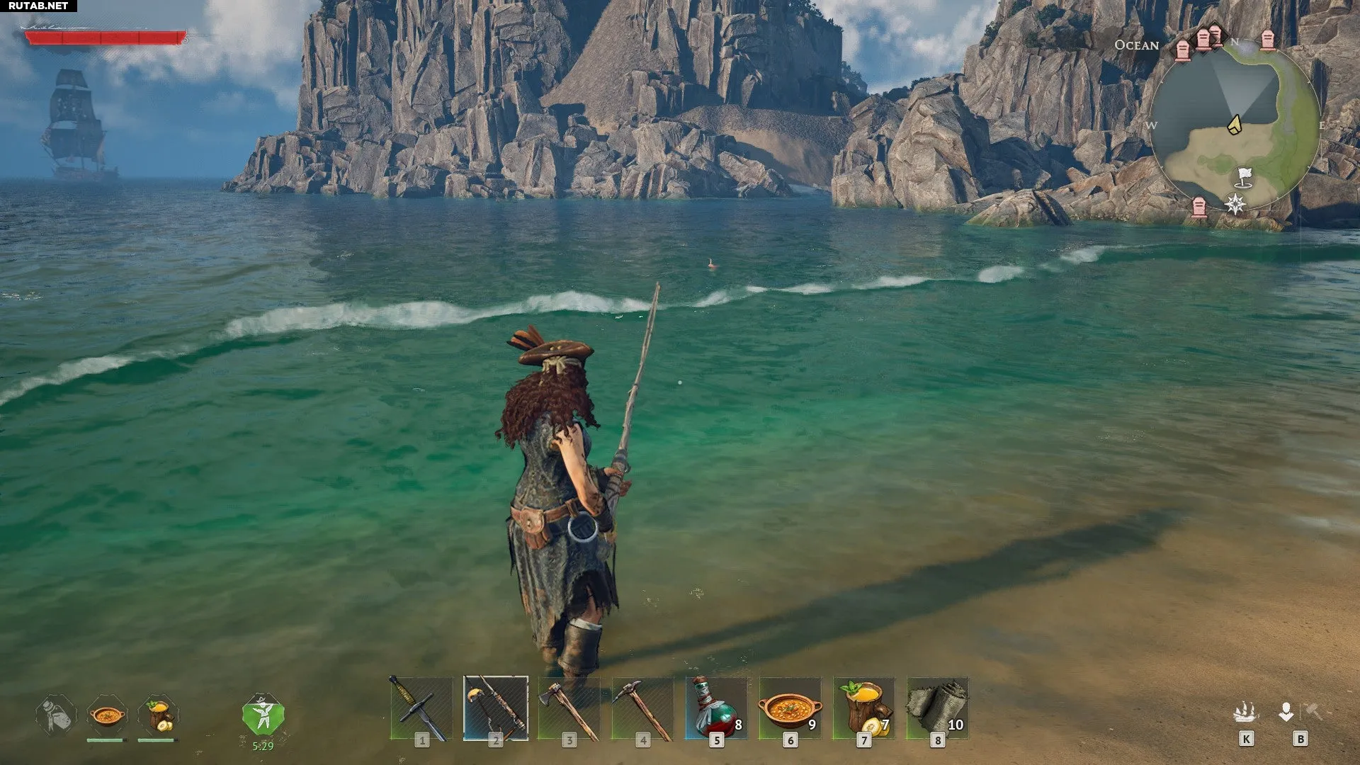 Рыбалка в Windrose довольно проста. Сначала найдите водоём. Затем поместите удочку на панель быстрого доступа и экипируйте её, как любое другое оружие или инструмент. Нажмите левую кнопку мыши, чтобы закинуть леску в воду.