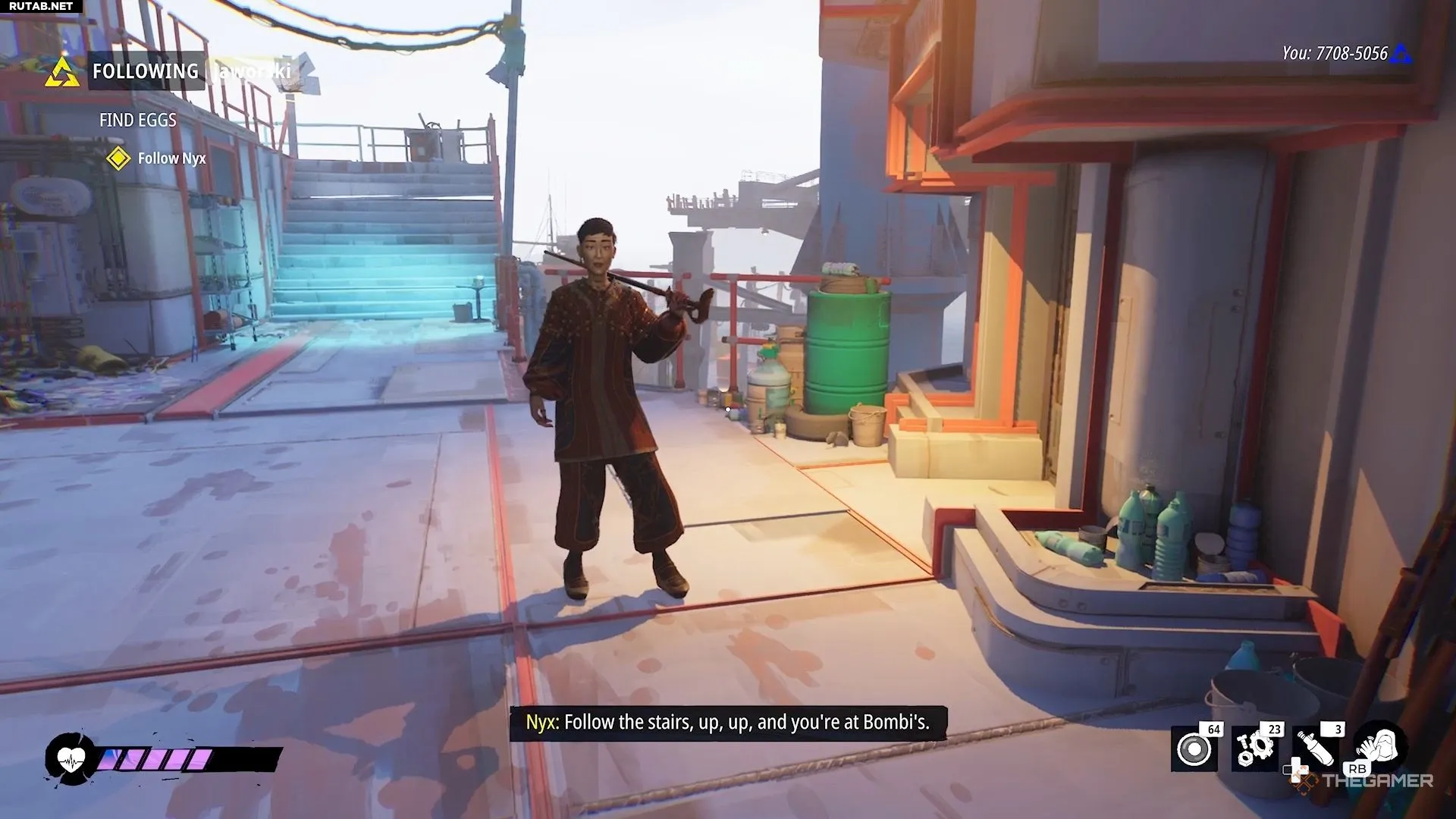 На верху лестницы поговорите с персонажем, который там находится. Это будет либо Эйла слева, либо Никс справа.